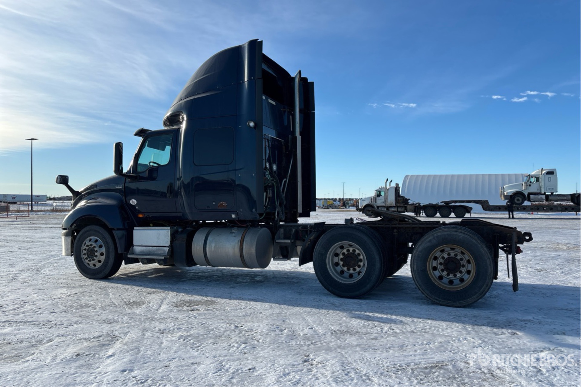Moteur Cummins, homologué EPA 2018, 13 506 heures moteur, transmission automatique, essieu avant de 6 350 kg, essieux arrière de 20 860 kg, PTAC de 27 216 kg, frein moteur, double blocage de différentiel, cabine couchette à toit surélevé de 130 cm, empattement de 560 cm, suspension pneumatique, jantes en aluminium, pneus 11R22.5, sellette d'attelage coulissante pneumatique, deux réservoirs de carburant