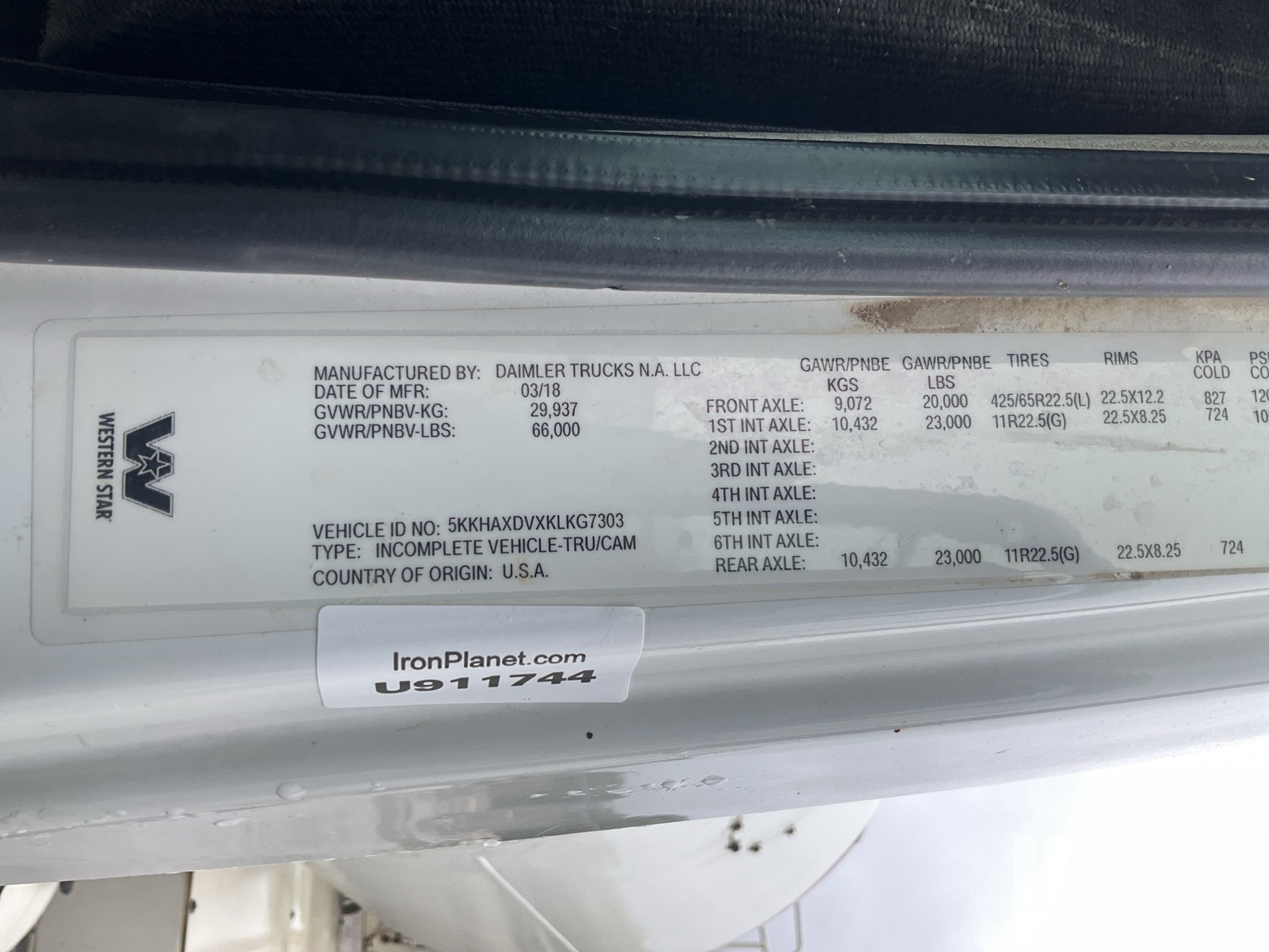 Moteur diesel Detroit DD13 6 cylindres 12,8 L de 410 ch, homologué EPA (États-Unis) 2018, liquide d'échappement diesel requis, 11 091 heures moteur, climatisation, régulateur de vitesse, vitres électriques, frein moteur, boîte automatique Allison 4700 à 7 rapports, blocage de différentiel, essieu avant de 9 188 kg (20 000 lb), essieu arrière de 20 988 kg (46 000 lb), essieux moteurs Meritor RT-46-160P, rapport de pont de 4,30:1, PNBV de 3 988 kg (66 000 lb), cabine pneumatique, roues avant en aluminium, pneus avant 425/65R22.5, pneus arrière 11R22.5, double boîtier de direction, double châssis, suspension Hendrickson Haulmaax à balancier en caoutchouc, empattement de 5 840 cm (232 po), malaxeur McNeilus 10,5 cyl., 3 goulottes amovibles, télécommandes avec et sans fil.