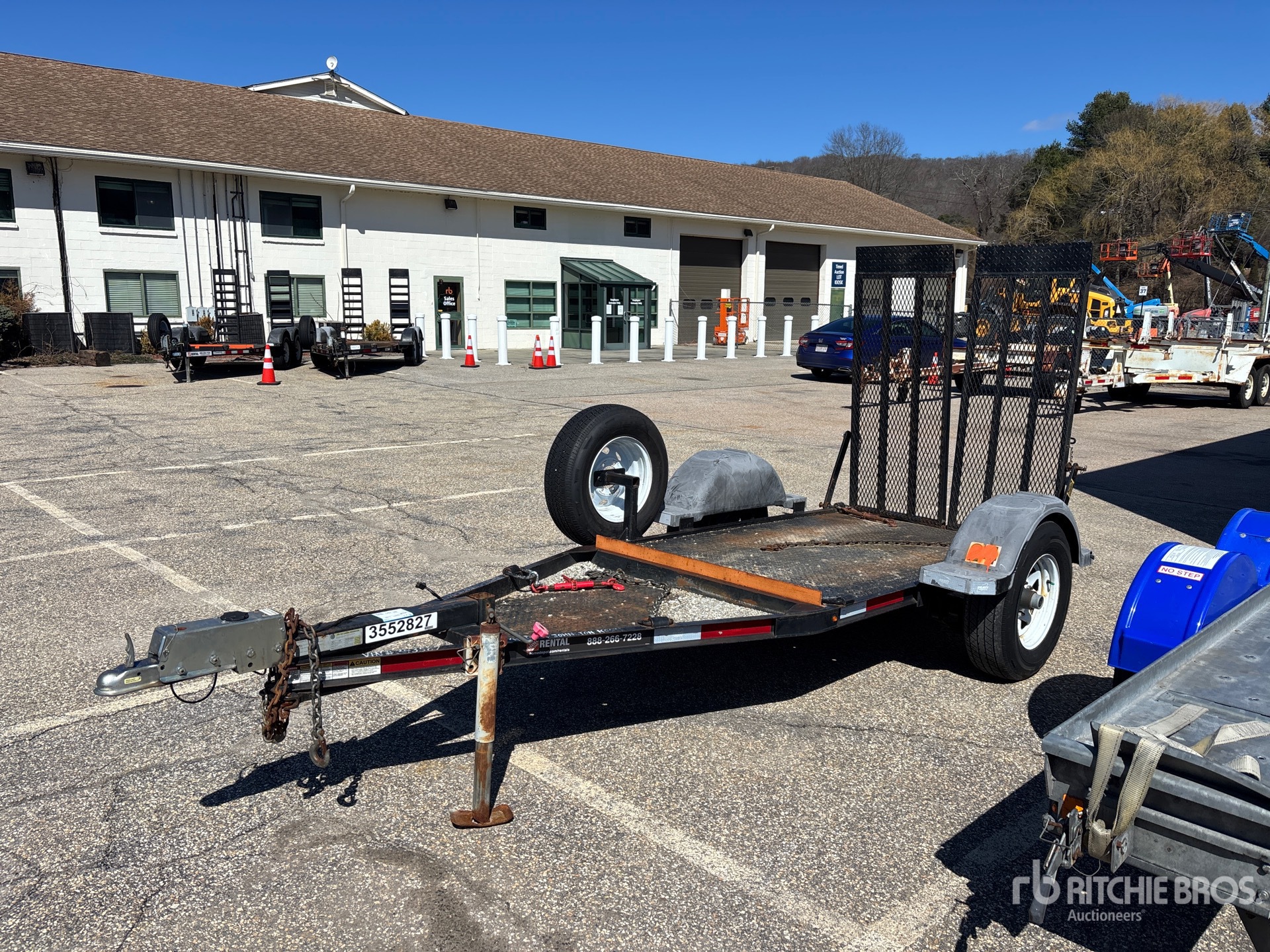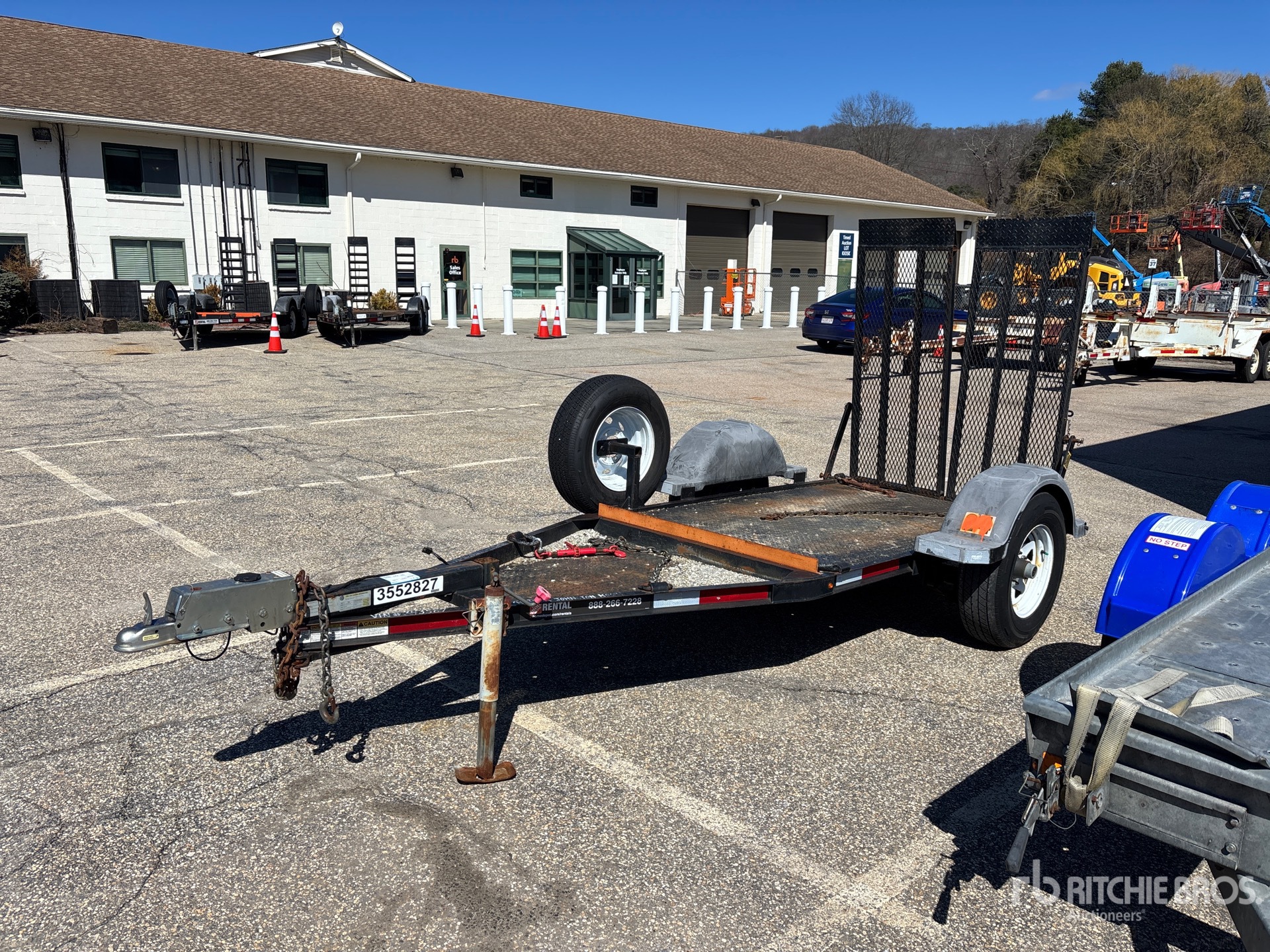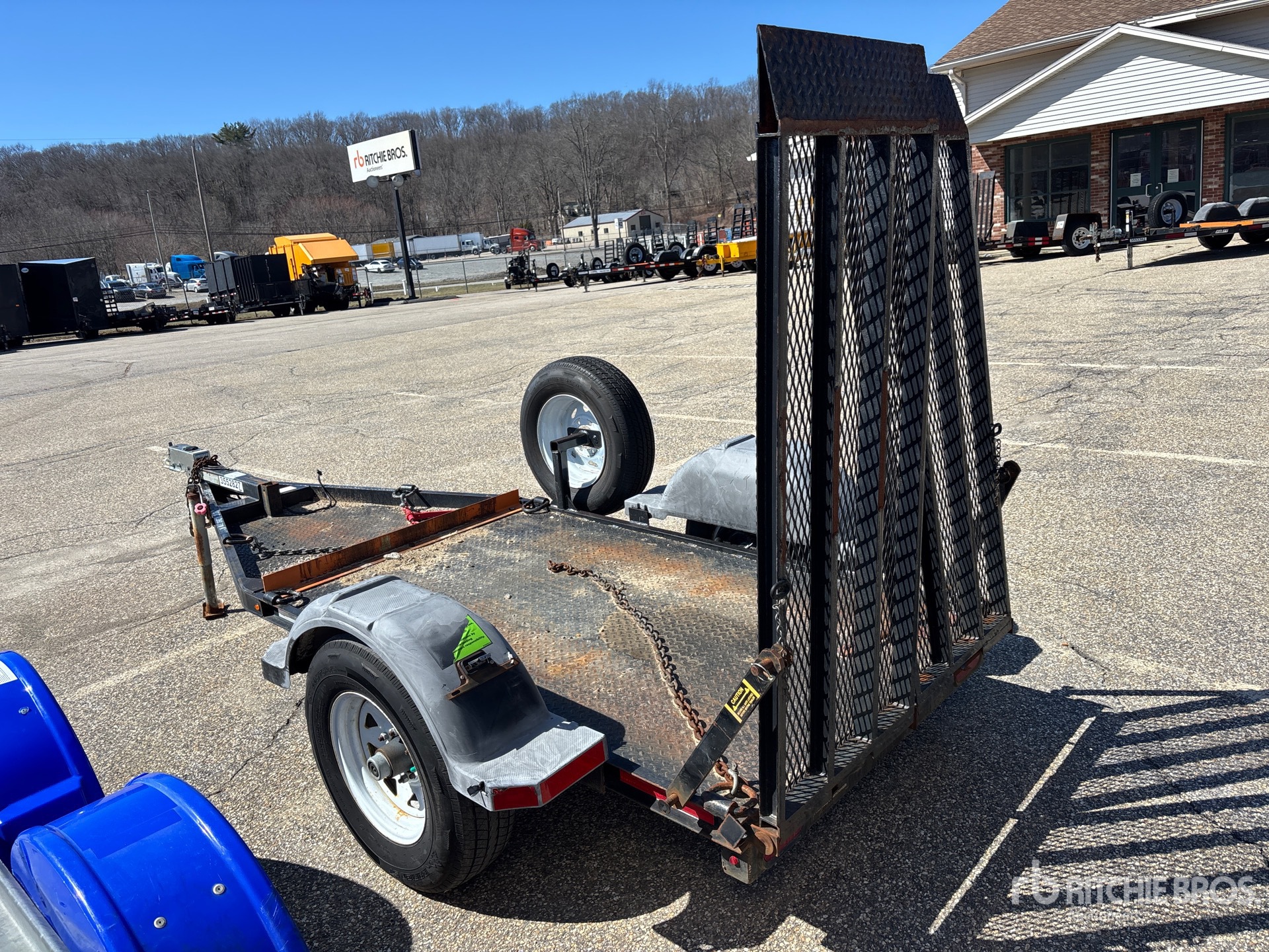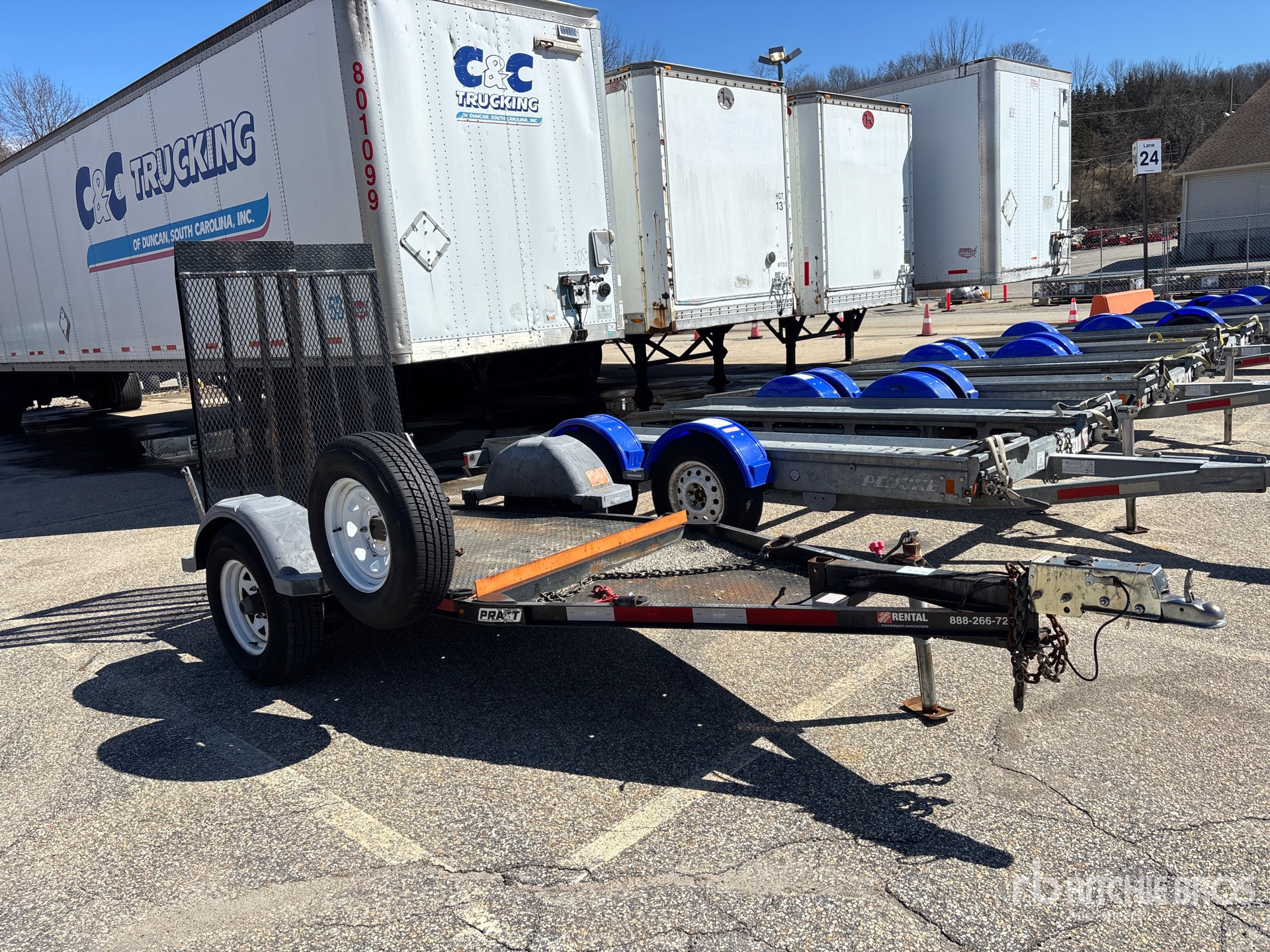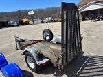 Située dans la voie 24, cette remorque est équipée d'un attelage à boule, d'un essieu de torsion, de freins à inertie, d'un plateau principal de 2,13 m (7 pi), d'une largeur utile de plateau de 1,22 m (48 po), d'une largeur totale de plateau de 1,30 m (51 po), de rampes manuelles, d'un plancher en acier, de pneus 225/75R15 et d'un PTAC de 2 000 kg (4 400 lb).