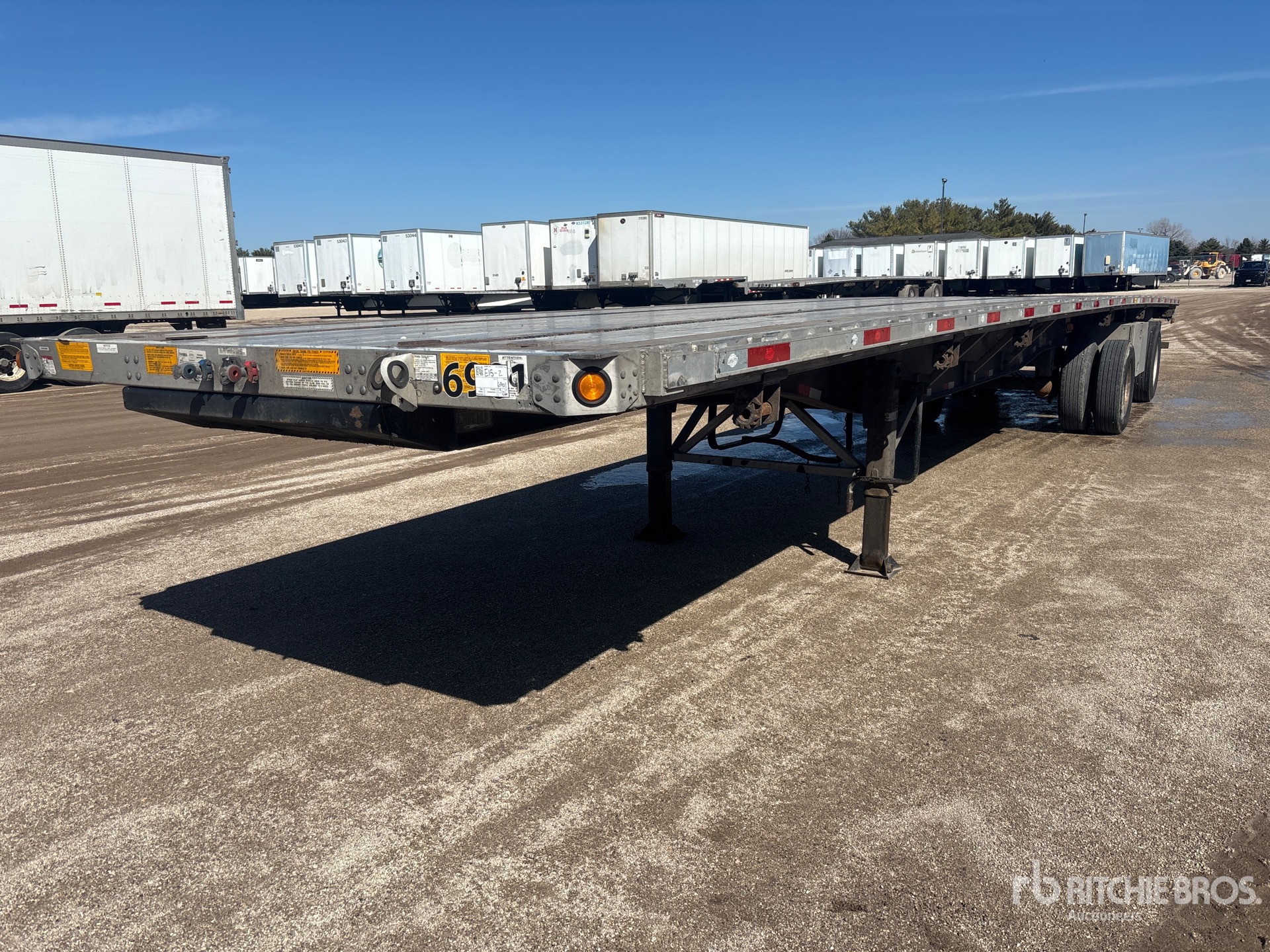 Suspension pneumatique, largeur du plateau de 246 cm, largeur hors tout de 259 cm, plancher en aluminium avec lattes de bois, jantes en aluminium, pneus 295/75R22.5, PTAC de 33 116 kg