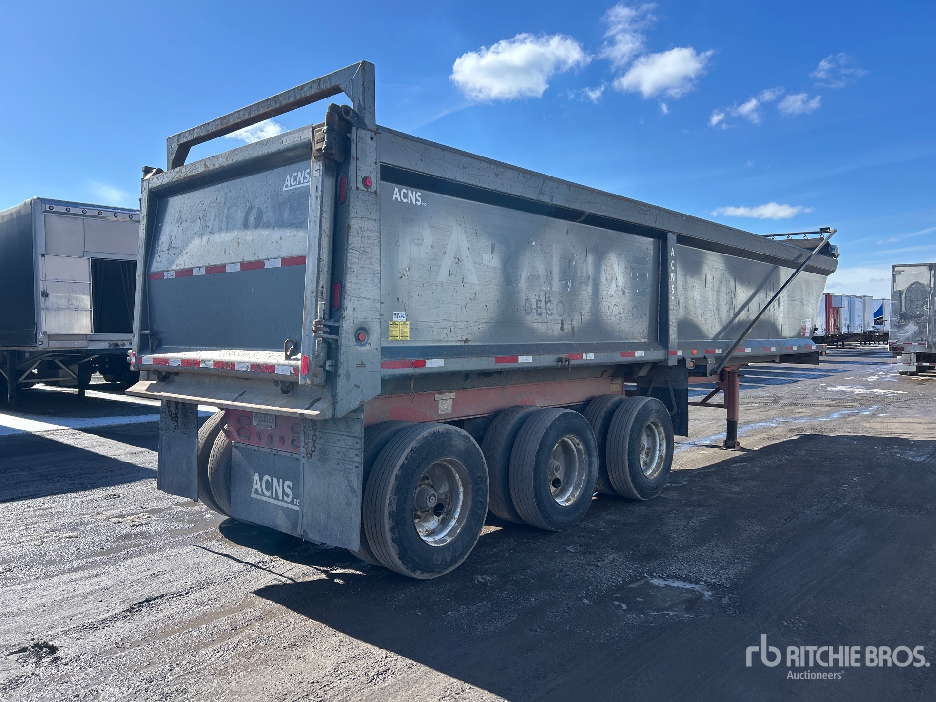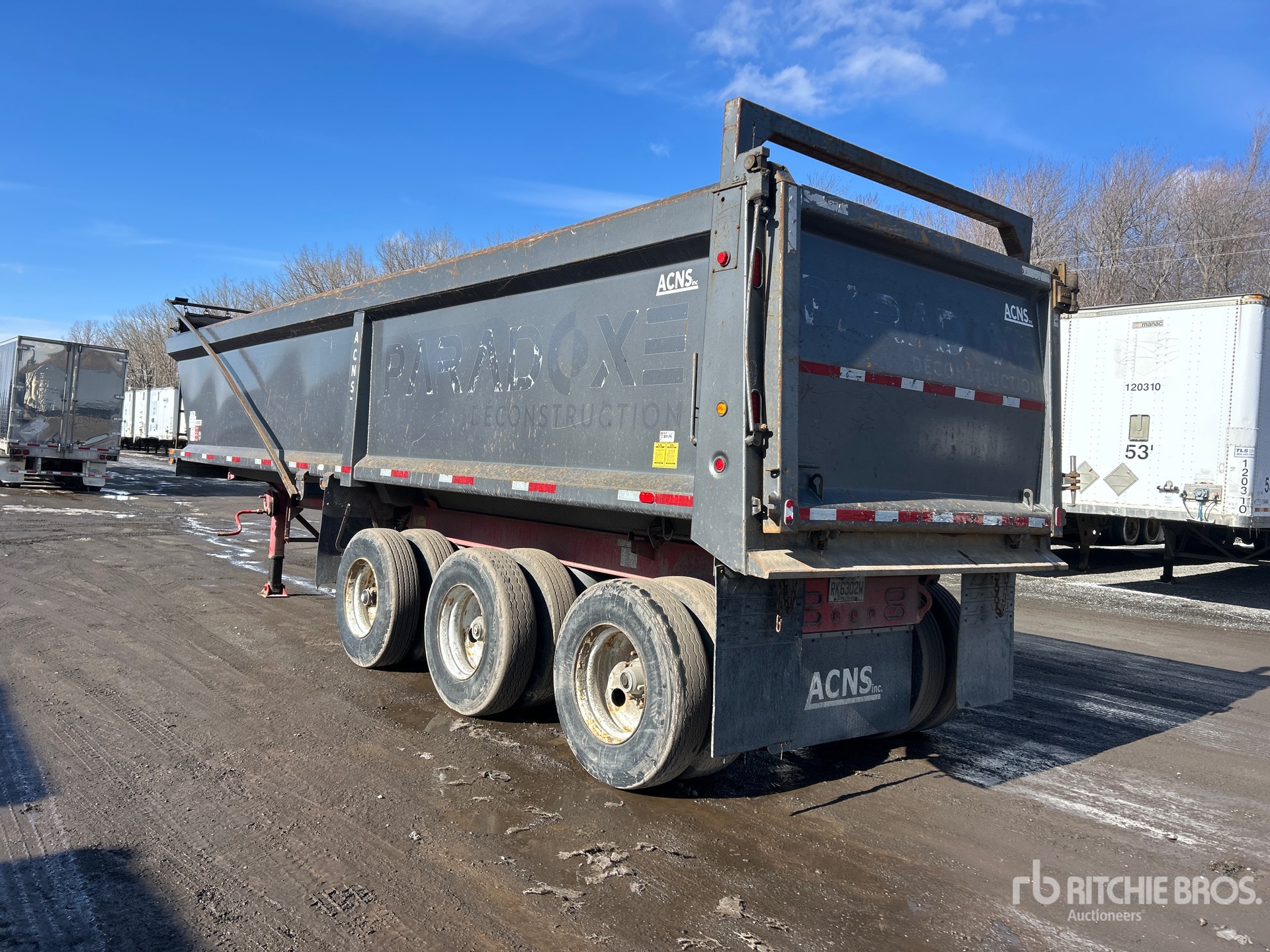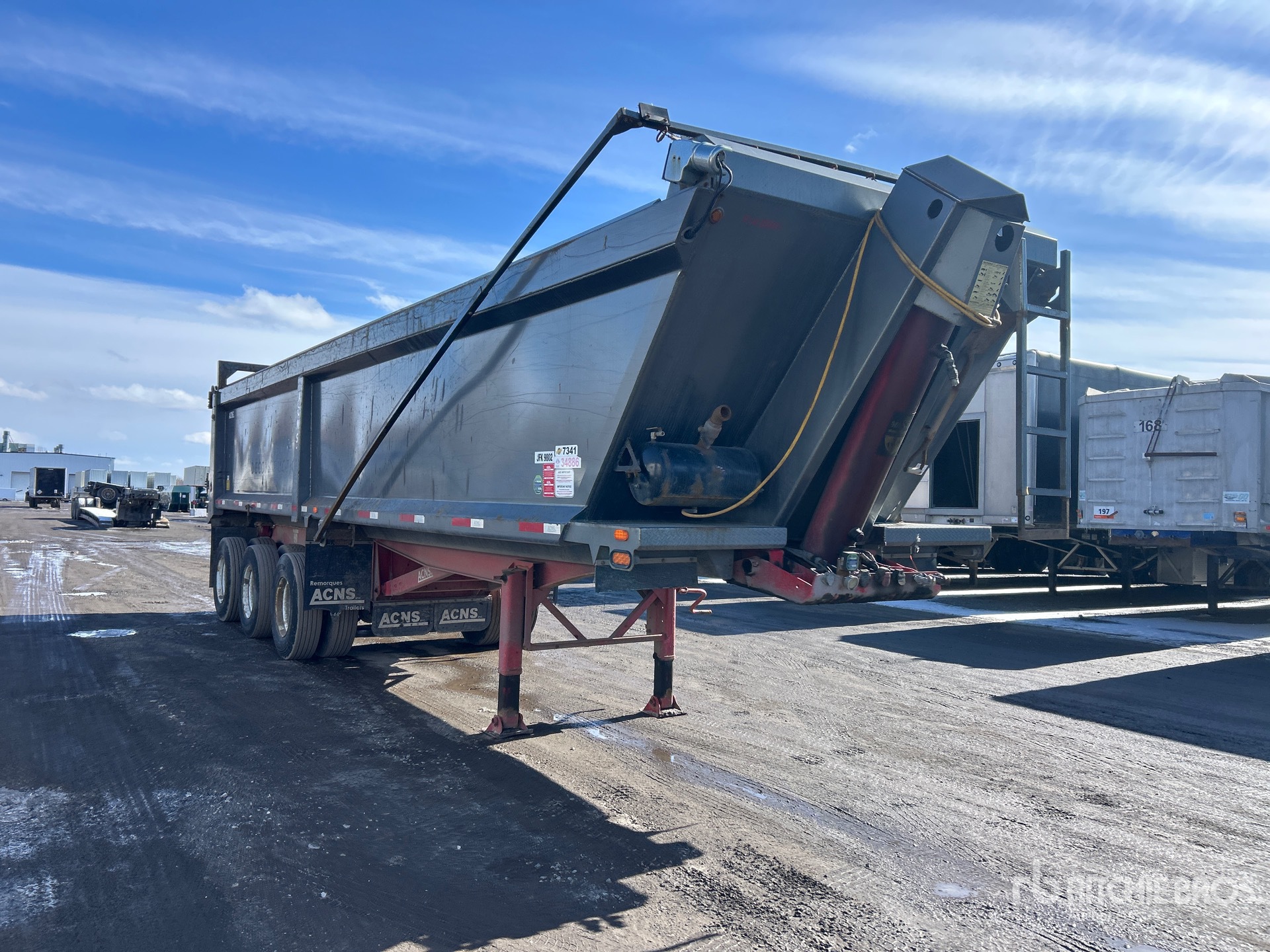 Suspension pneumatique, freins pneumatiques, caisse de 10,4 m (34 pi), parois latérales de 1,47 m (58 po), caisse en acier, bâche à enroulement électrique, hayon à double ouverture, pneus 11R22.5, PTAC de 38 500 kg