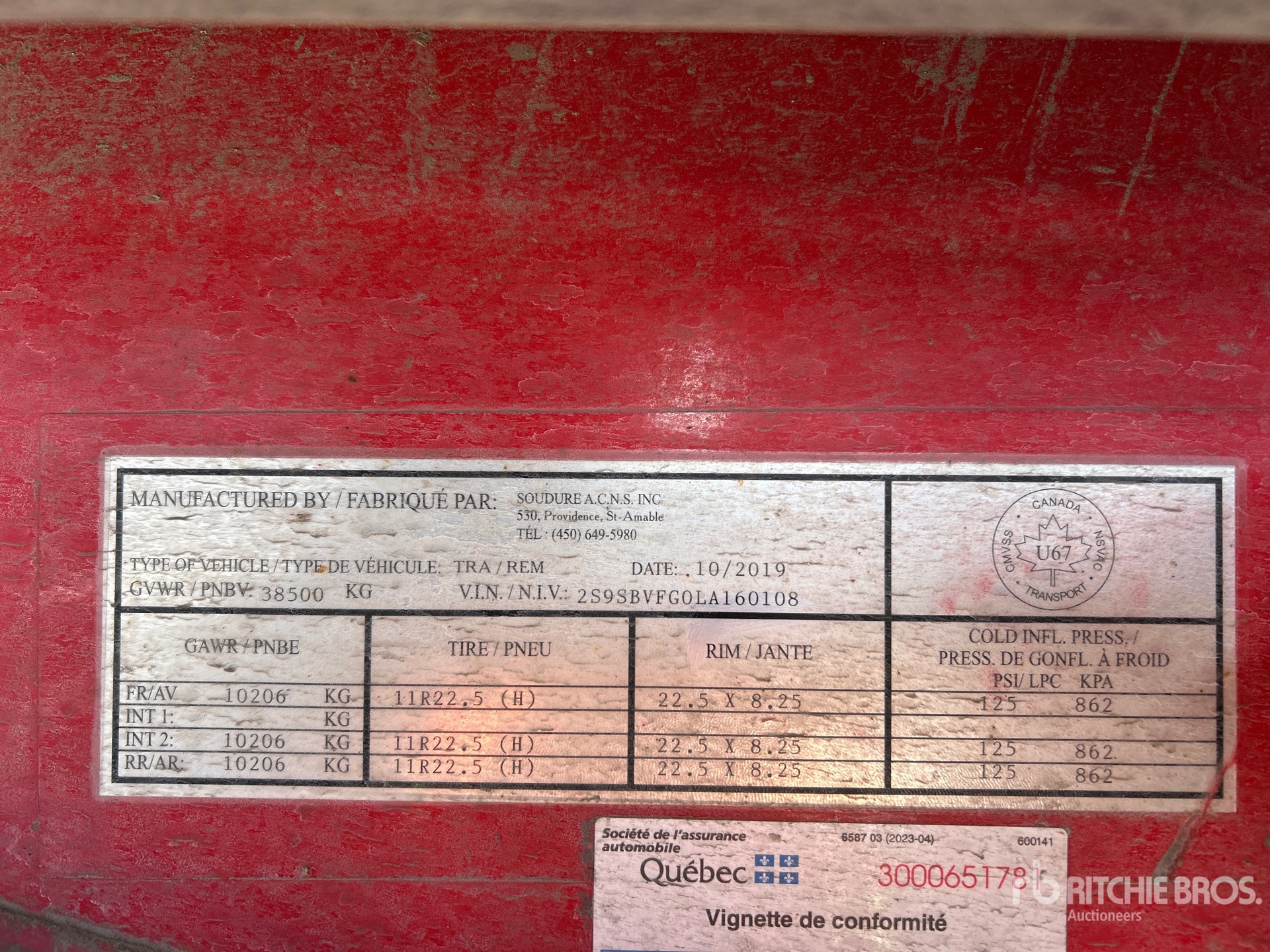 Les Informations détaillées de l’équipement sont d’une portée limitée, et les Encans Ritchie Bros. n’ont inspecté aucun autre aspect ou composant de l’équipement que ceux présentés expressément. Sauf indication précise, nous n’offrons aucune représentation ou garantie, officielle ou implicite, sur l’équipement ou ses composants, sans aucune limite de représentation ou de garantie en ce qui concerne la fonctionnalité, la conformité à toute norme de sécurité ou l’exigence de toute autorité ou agence de régulation en vigueur, l’adaptation à un quelconque usage, ou la valeur commerciale. Il vous est fortement conseillé d’effectuer votre propre inspection détaillée de l’équipement avant d’enchérir.