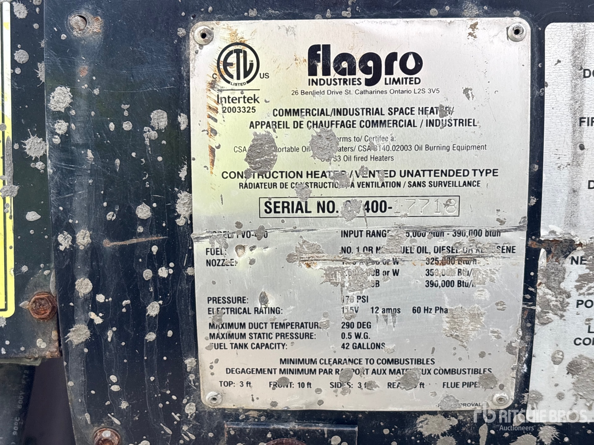 Les Informations détaillées de l’équipement sont d’une portée limitée, et les Encans Ritchie Bros. n’ont inspecté aucun autre aspect ou composant de l’équipement que ceux présentés expressément. Sauf indication précise, nous n’offrons aucune représentation ou garantie, officielle ou implicite, sur l’équipement ou ses composants, sans aucune limite de représentation ou de garantie en ce qui concerne la fonctionnalité, la conformité à toute norme de sécurité ou l’exigence de toute autorité ou agence de régulation en vigueur, l’adaptation à un quelconque usage, ou la valeur commerciale. Il vous est fortement conseillé d’effectuer votre propre inspection détaillée de l’équipement avant d’enchérir.