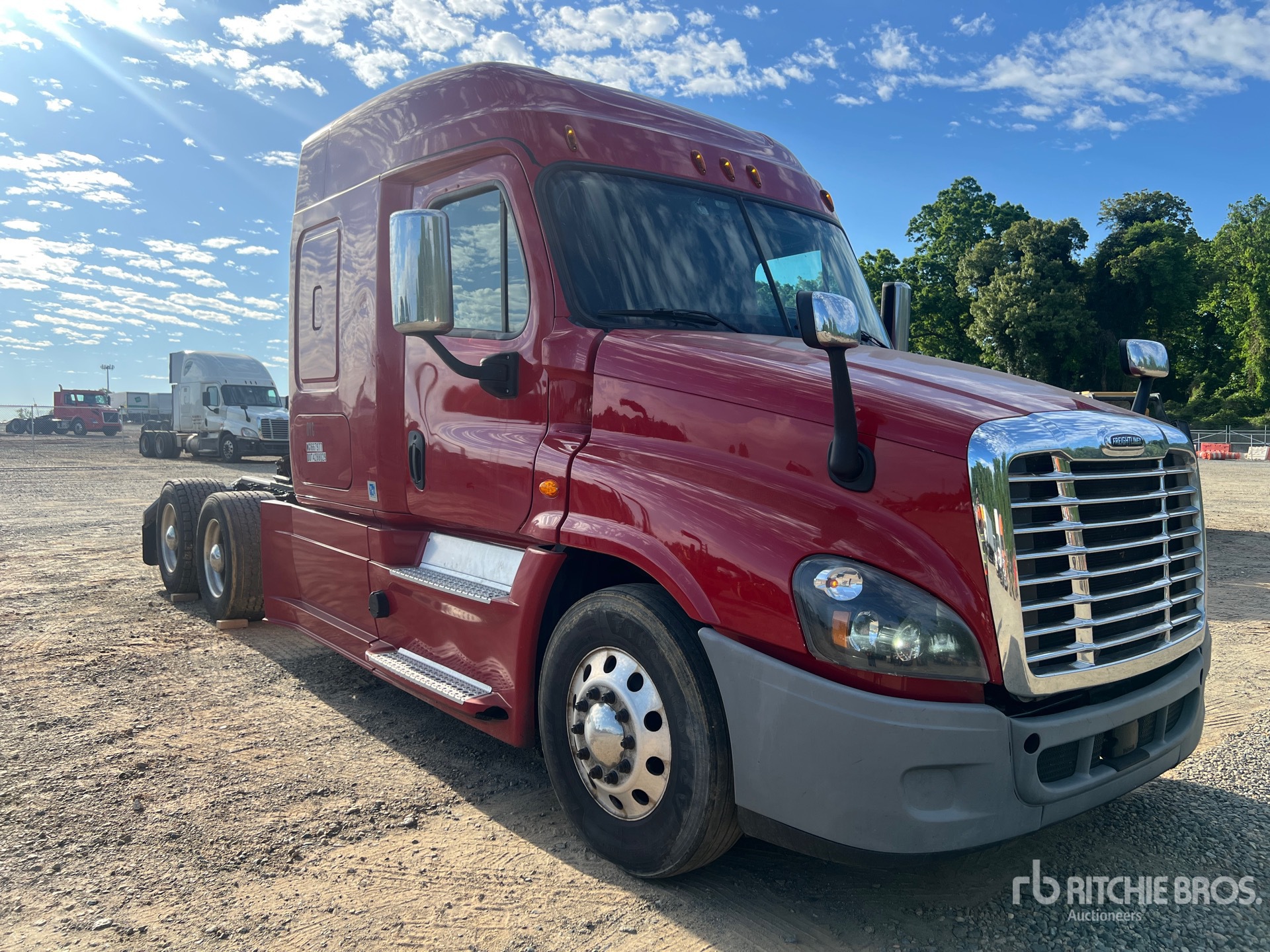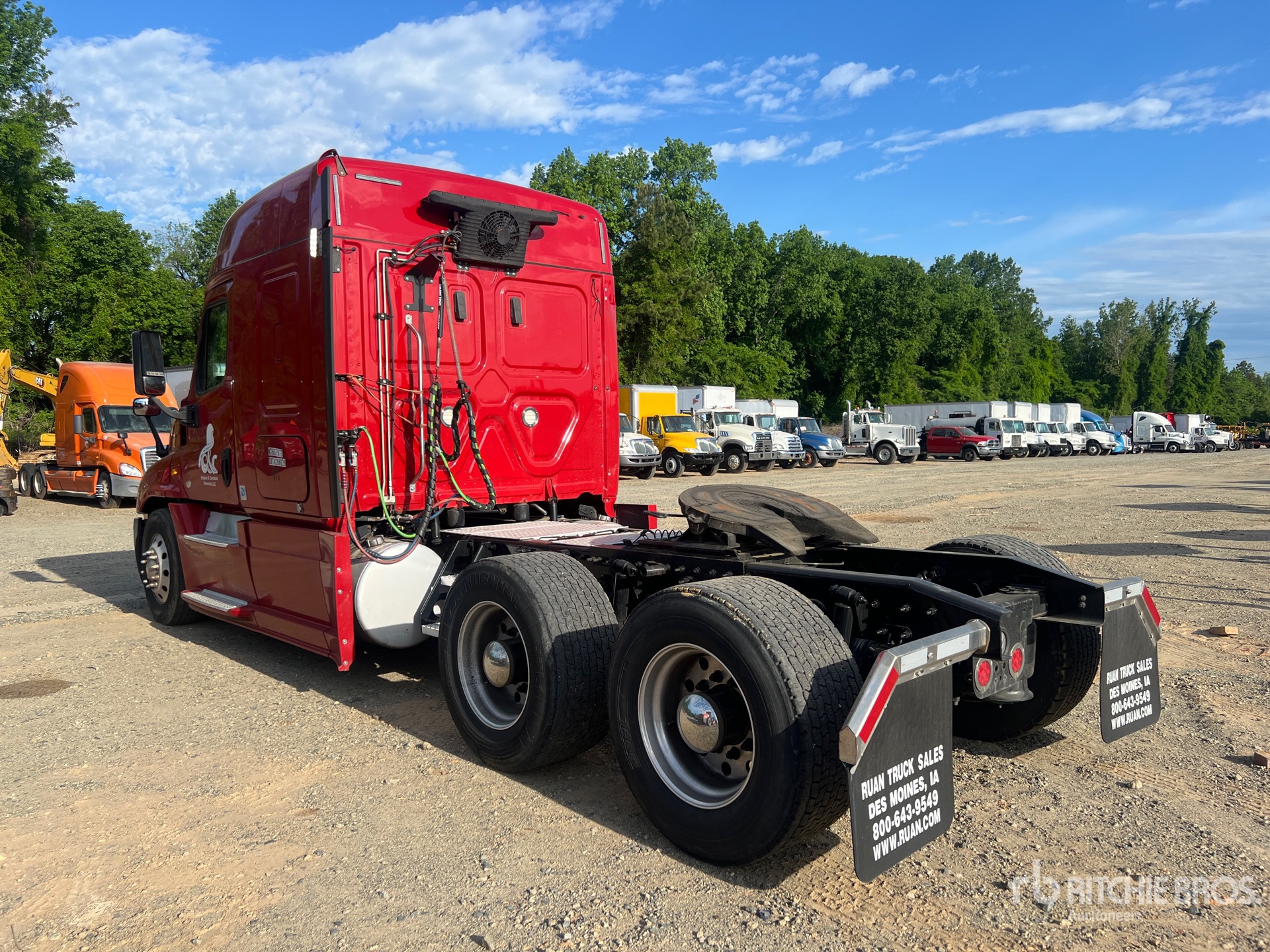 Moteur Detroit DD13, homologué EPA 2019, 16 671 heures de fonctionnement, transmission automatisée Eaton Fuller FAO-16810C-EA à 10 rapports, essieu avant de 5 600 kg, essieu arrière de 18 144 kg, PTAC de 23 700 kg, frein moteur, cabine couchette à toit surélevé de 147 cm, empattement de 559 cm, suspension pneumatique, jantes en aluminium, pneus avant 295/75R22.5, pneus arrière Super Singles 445/50R22.5, suspension avant assistée pneumatique, sellette d'attelage coulissante pneumatique, double réservoir de carburant