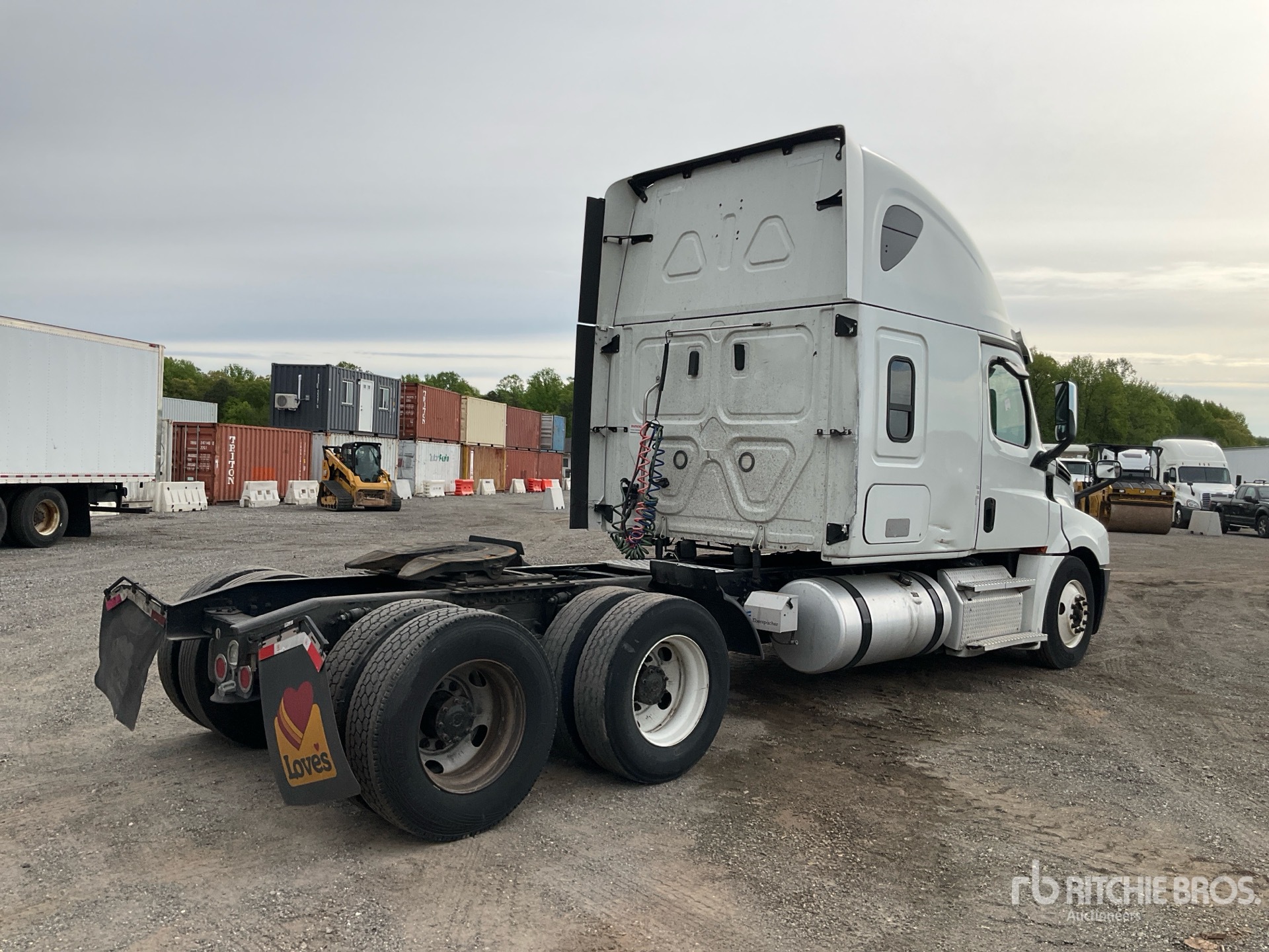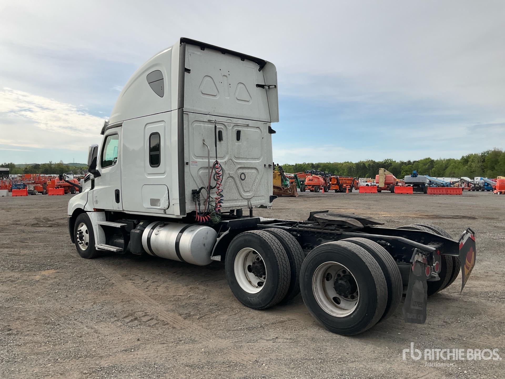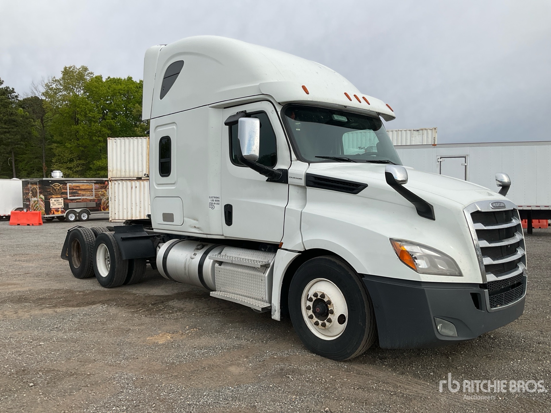 Moteur Detroit DD15 de 455 ch, homologué EPA 2019, 275 520 heures de fonctionnement, transmission automatisée Detroit DT12-1650-OH1 à 12 rapports, essieu avant de 5 580 kg, essieu arrière de 18 144 kg, PTAC de 23 700 kg, cabine couchette surélevée de 178 cm, lits superposés, empattement de 577 cm, pneus 295/75R22.5, sellette d'attelage coulissante pneumatique, deux réservoirs de carburant.