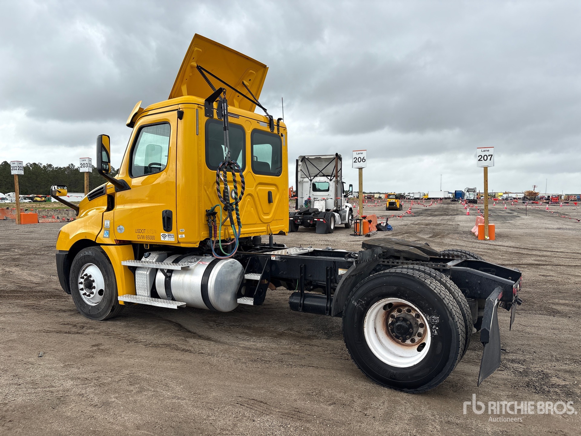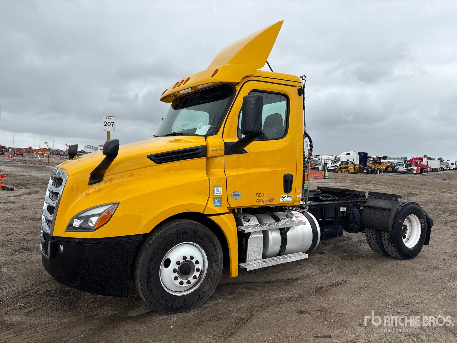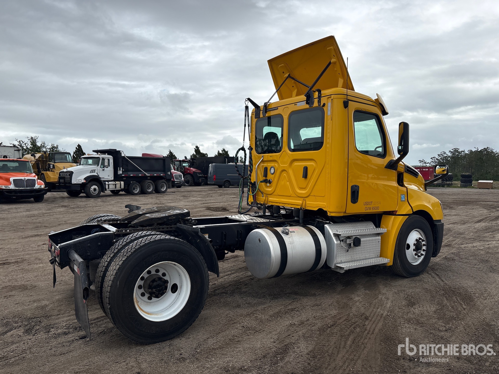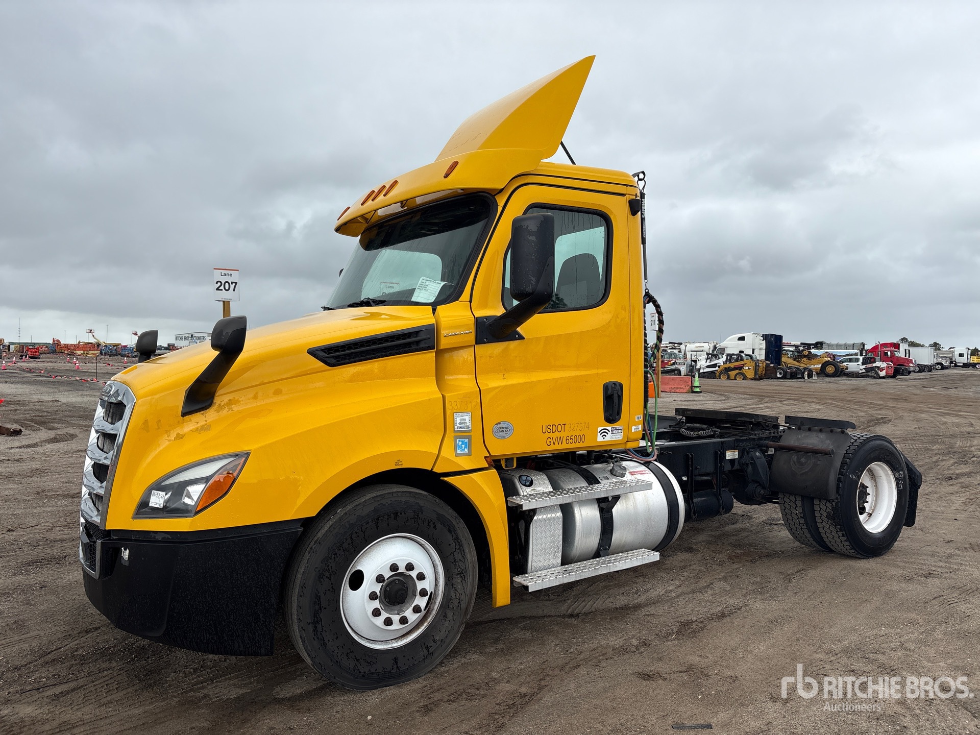 Moteur Detroit DD13 de 410 ch, homologué EPA 2019, transmission automatisée Detroit DT12-1450-OH1, essieu avant de 5 443 kg, essieu arrière de 9 525 kg, PTAC de 14 997 kg, empattement de 442 cm, suspension pneumatique, pneus 11R22.5, sellette d'attelage coulissante pneumatique, deux réservoirs de carburant