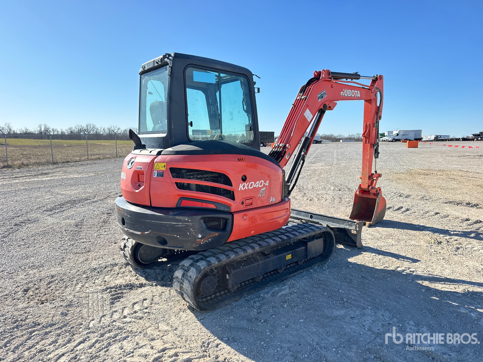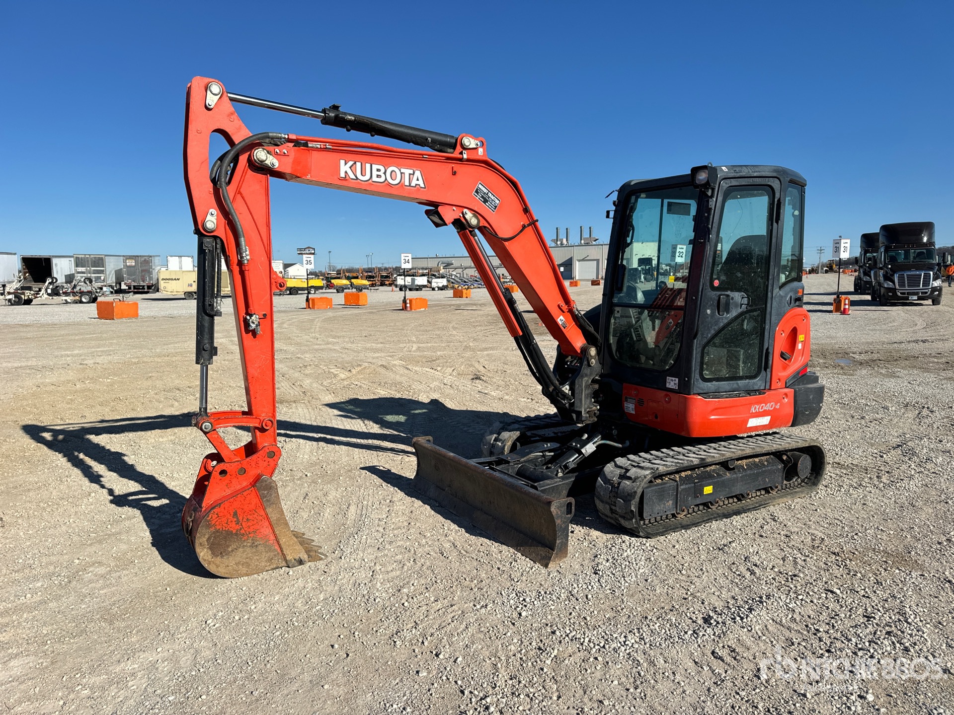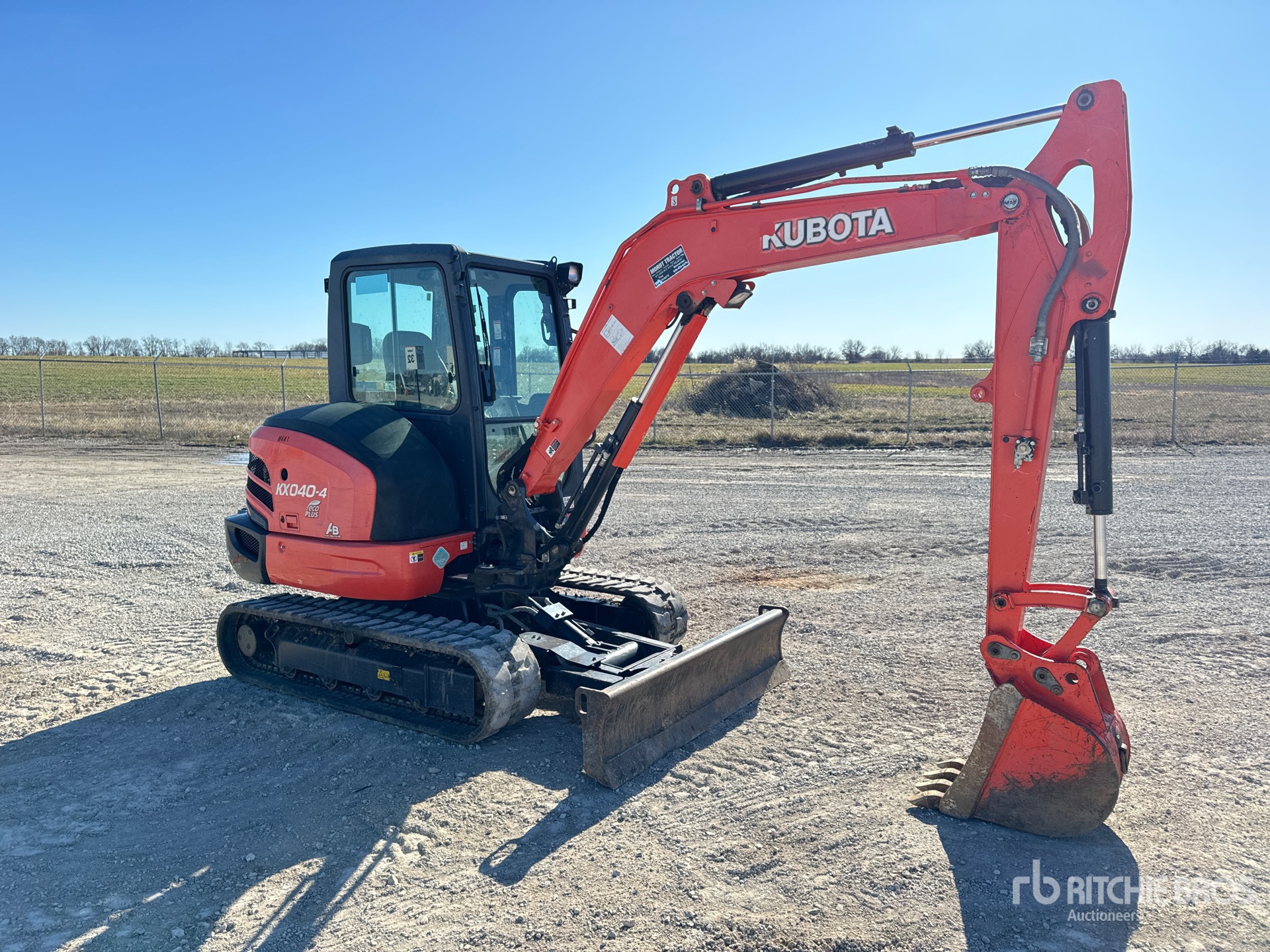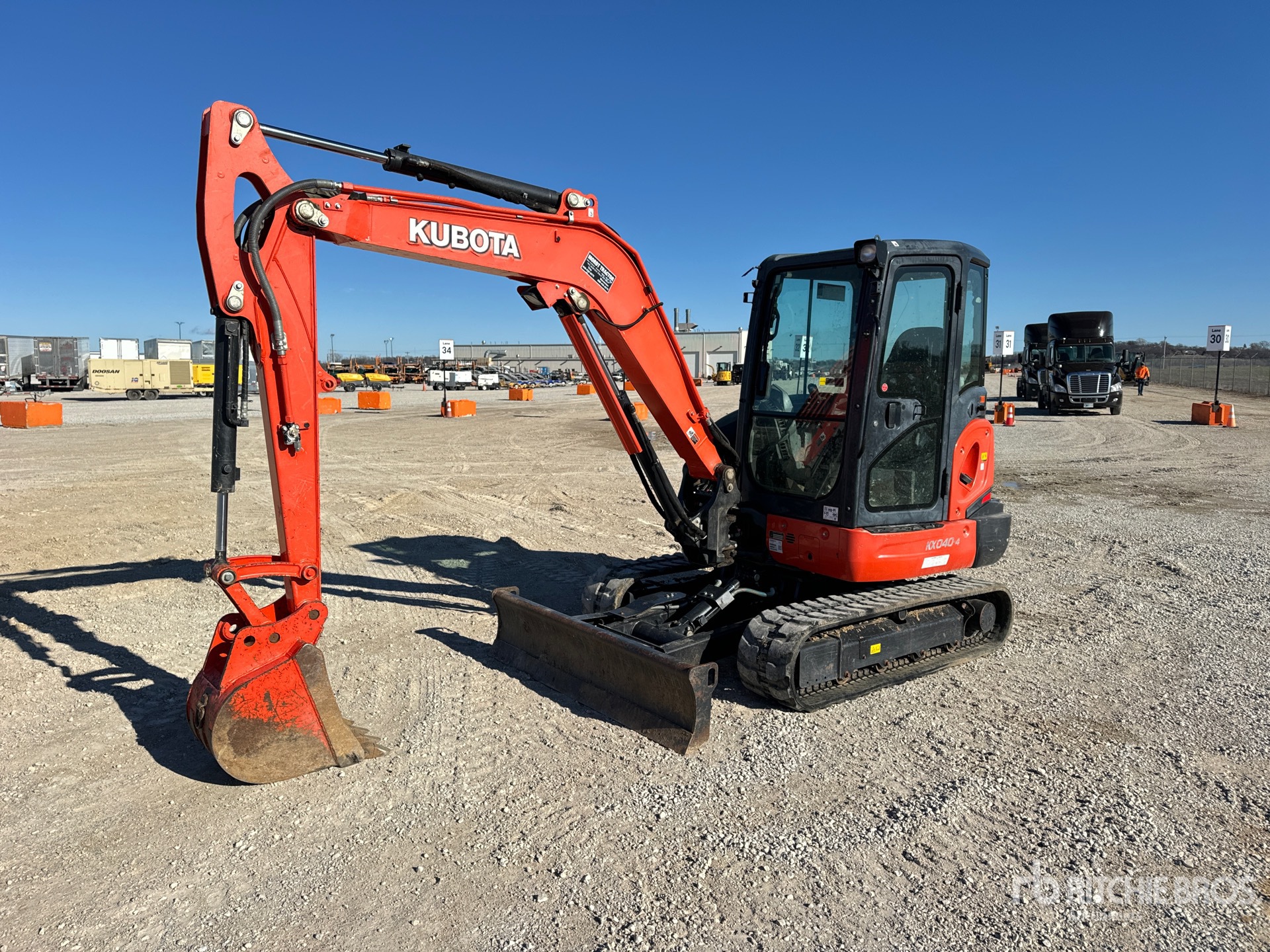 Cabine fermée, climatisation, homologation EPA américaine 2019, flèche pivotante, bras de 1,60 m, circuit hydraulique auxiliaire, lame à angle motorisé, chenilles en caoutchouc de 35,5 cm, godet de terrassement de 40,5 cm