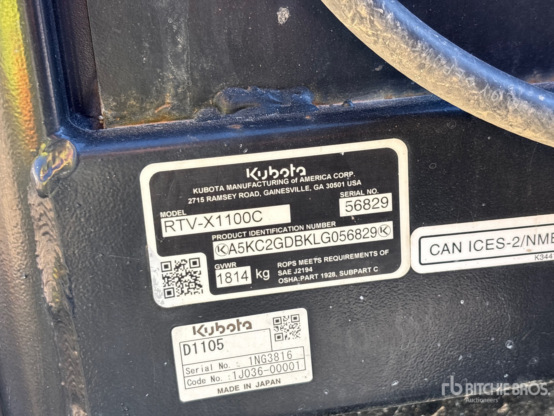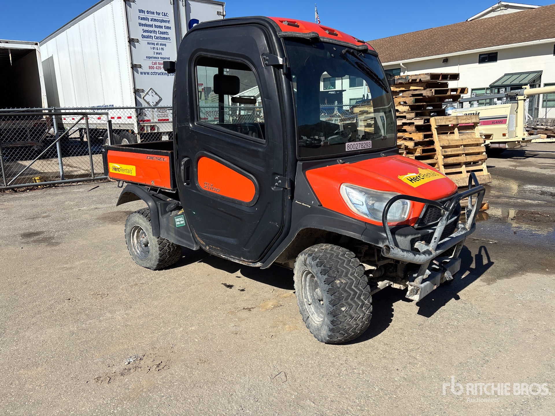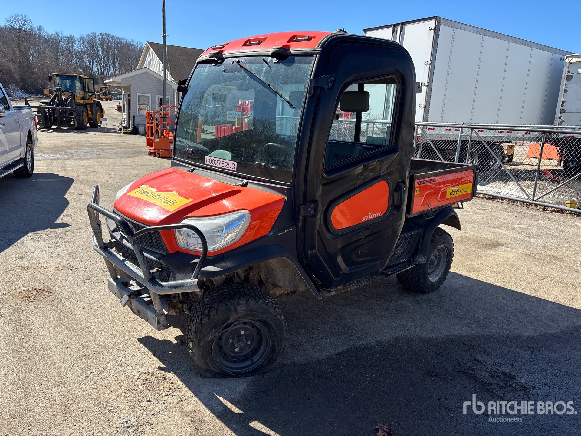 Cabine fermée, climatisation, 2 places, pare-brise, pare-buffle, benne basculante hydraulique, conforme aux normes Tier 4, étiquette EPA américaine 2022, conforme aux normes CARB, moteur diesel Kubota D1105 3 cylindres 1,1 L, équipement fourni par Herc Rentals