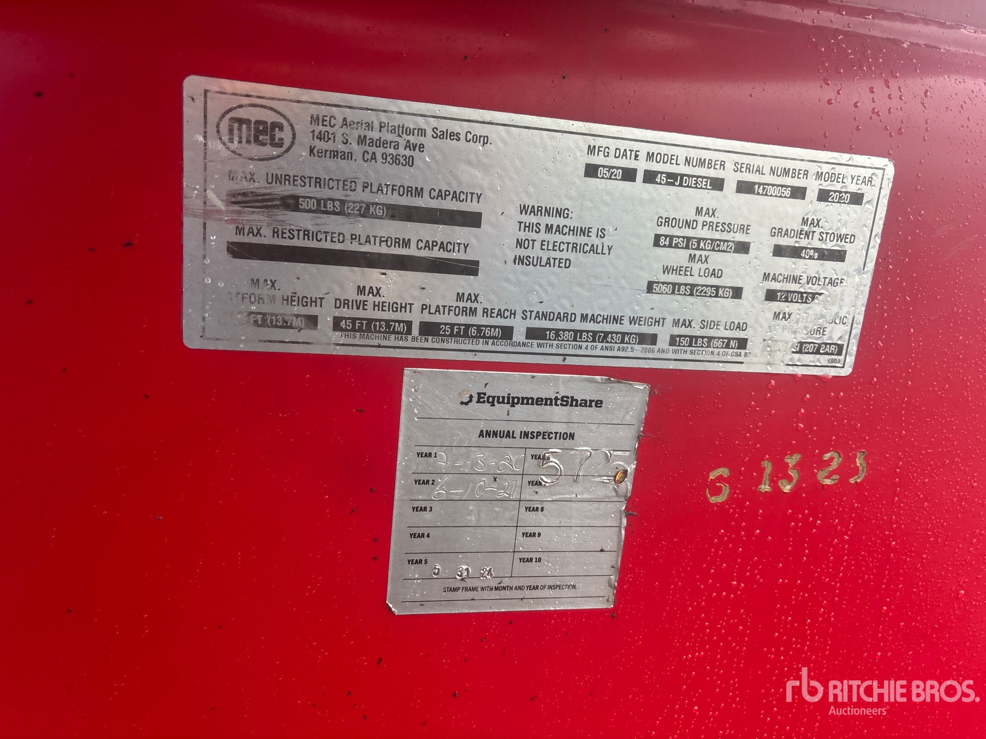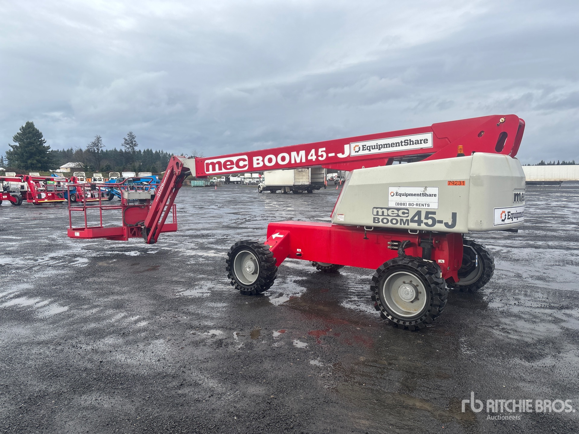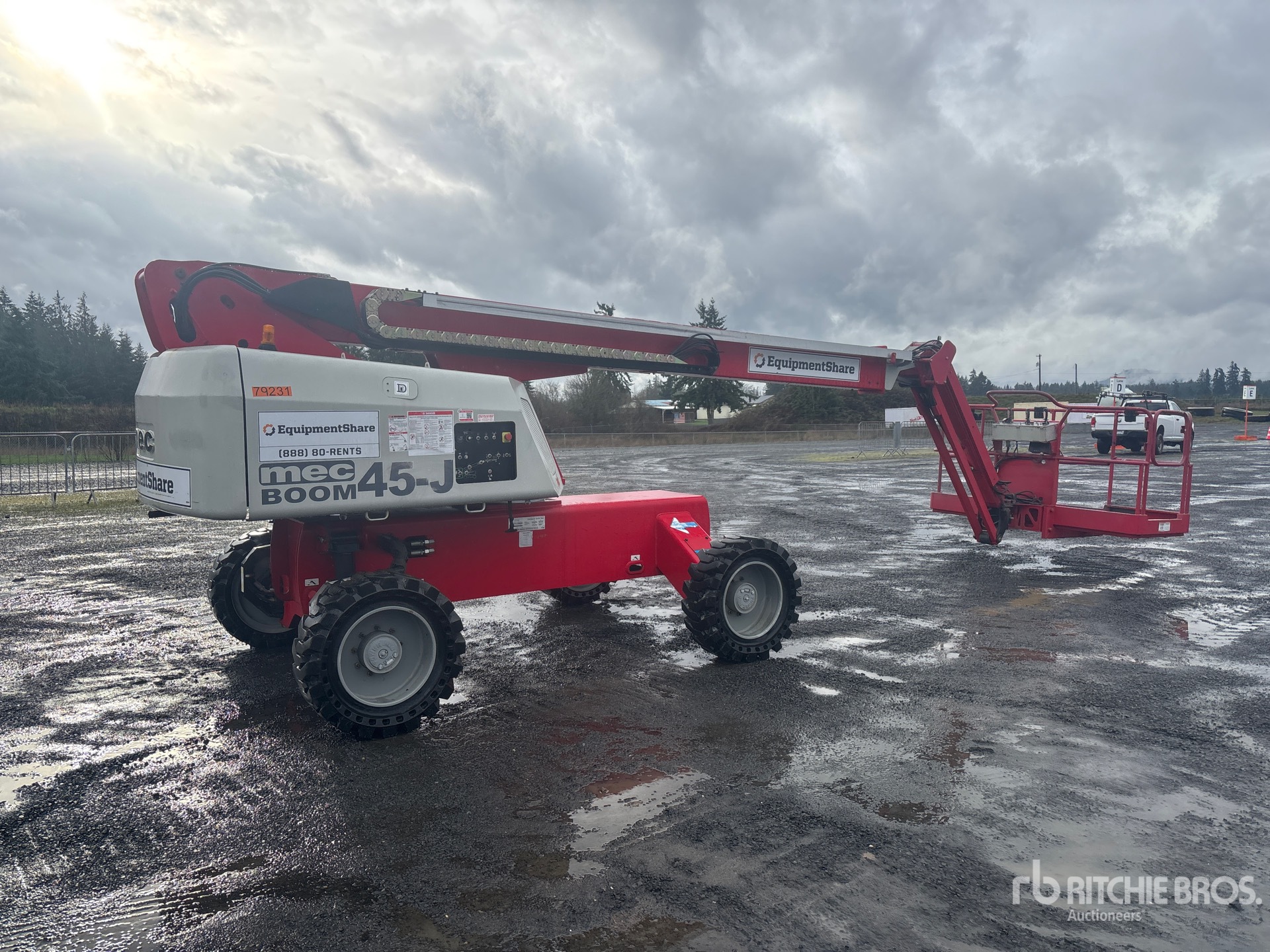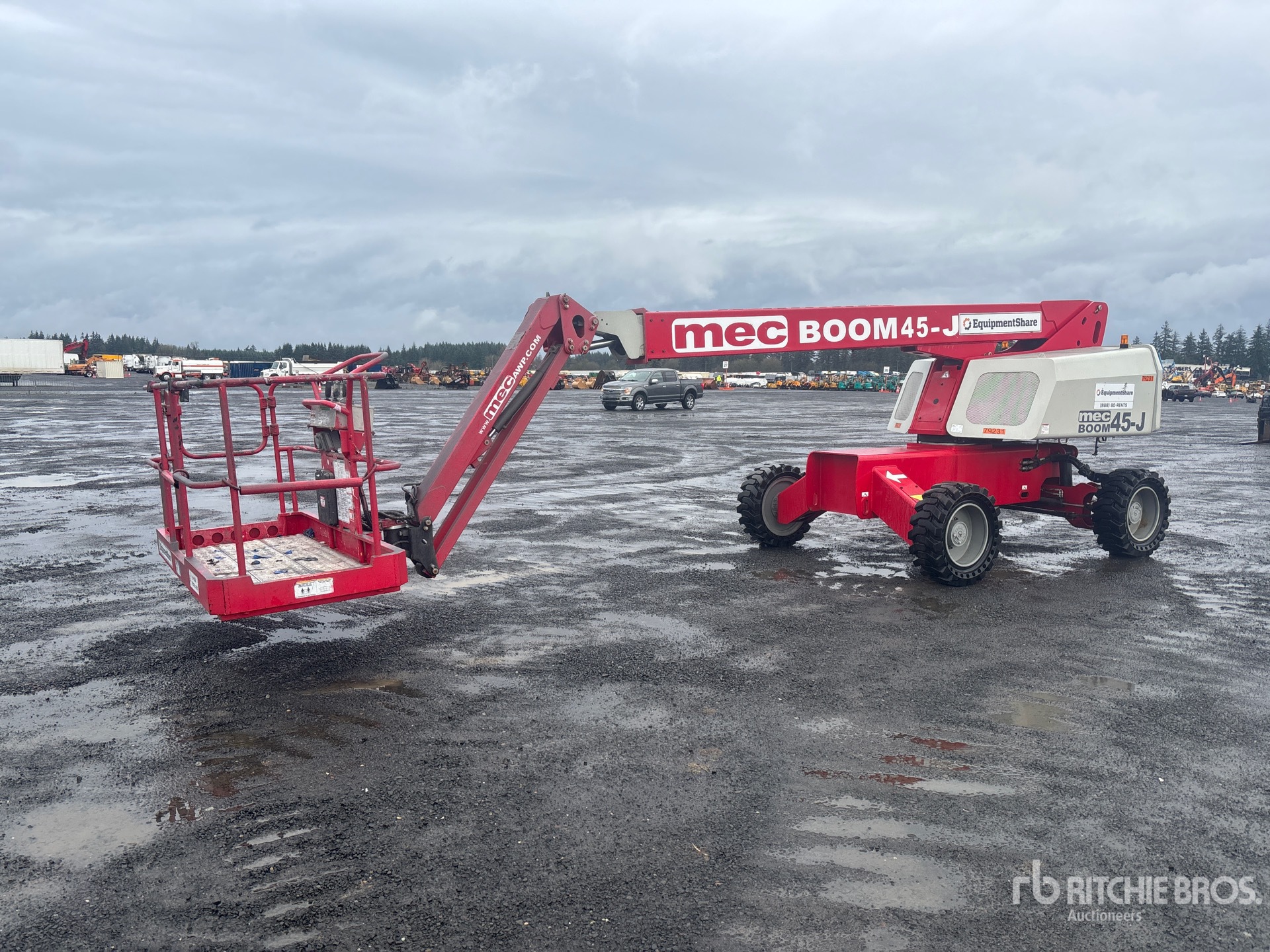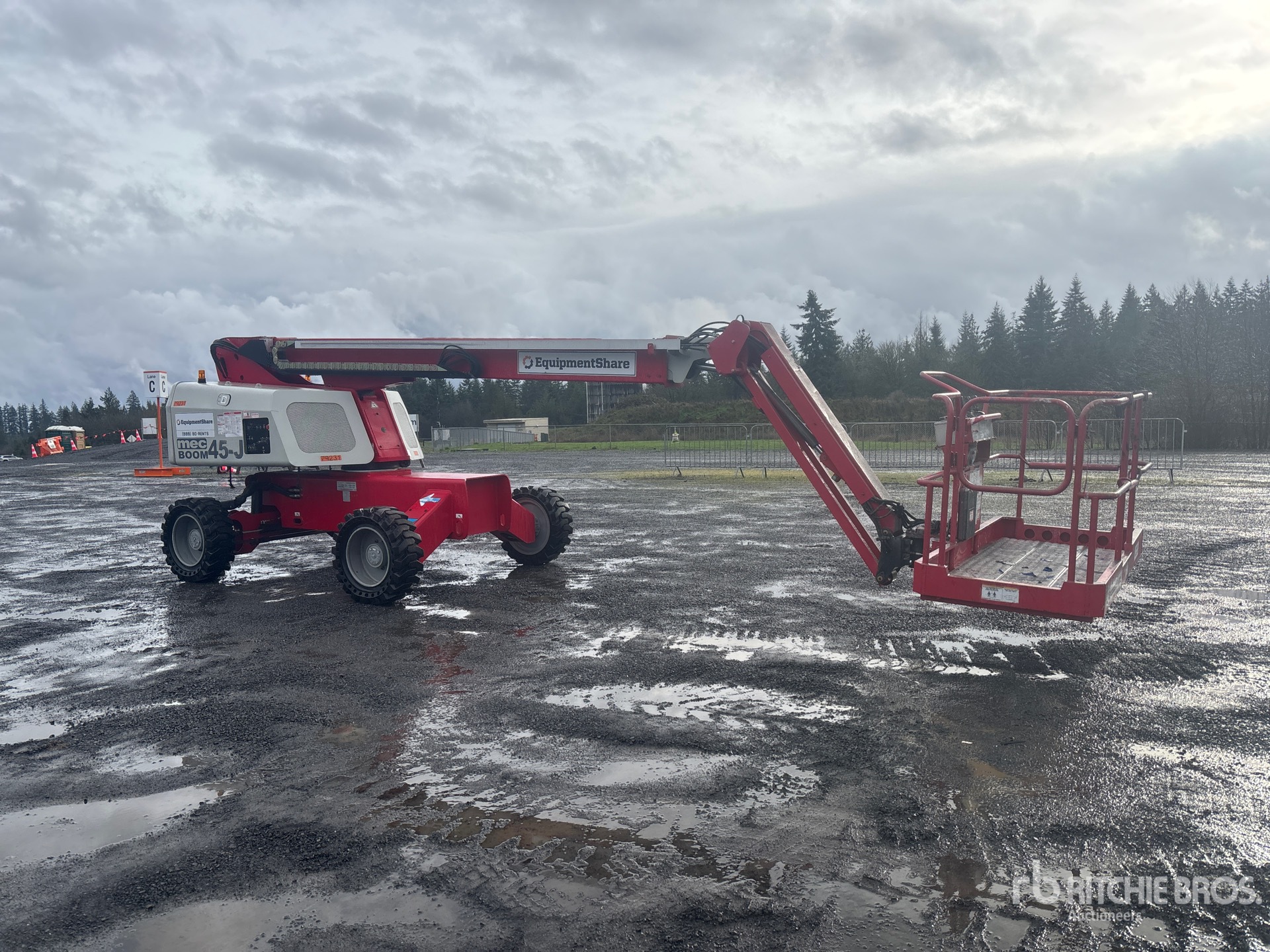 Hauteur de plateforme maximale de 13,7 m (45 pi), capacité de charge maximale de 227 kg (500 lb), flèche, alimentation électrique de la plateforme, générateur embarqué, moteur diesel Kubota à 4 cylindres, pneus à ouverture 33x12-20