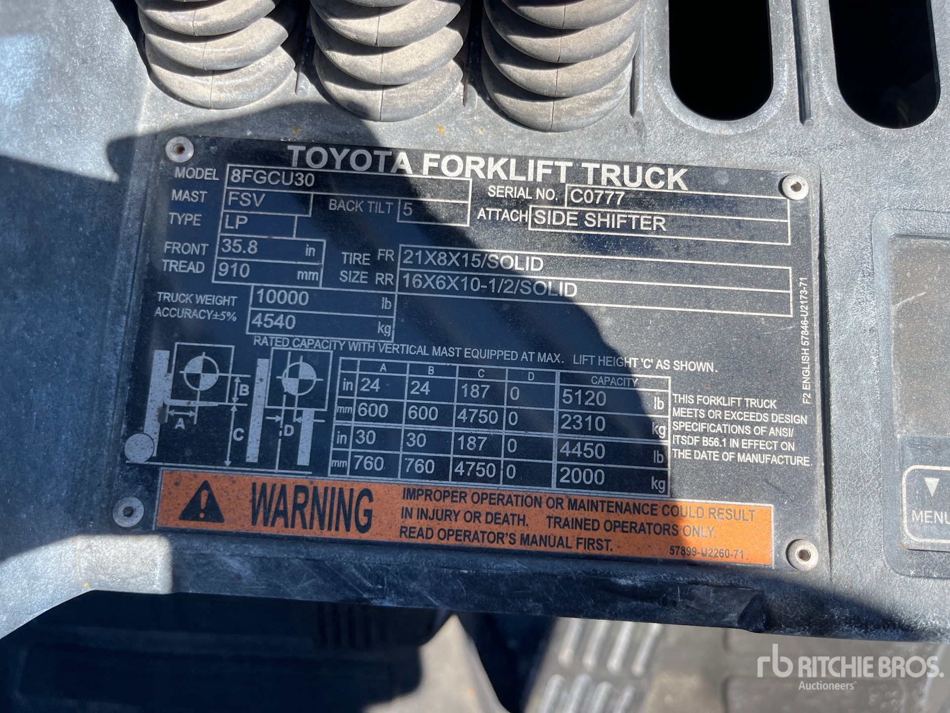 Les Informations détaillées de l’équipement sont d’une portée limitée, et les Encans Ritchie Bros. n’ont inspecté aucun autre aspect ou composant de l’équipement que ceux présentés expressément. Sauf indication précise, nous n’offrons aucune représentation ou garantie, officielle ou implicite, sur l’équipement ou ses composants, sans aucune limite de représentation ou de garantie en ce qui concerne la fonctionnalité, la conformité à toute norme de sécurité ou l’exigence de toute autorité ou agence de régulation en vigueur, l’adaptation à un quelconque usage, ou la valeur commerciale. Il vous est fortement conseillé d’effectuer votre propre inspection détaillée de l’équipement avant d’enchérir.