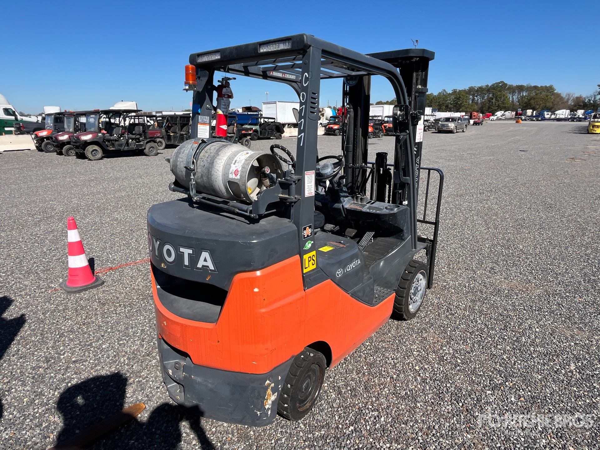 Mât à 3 sections, levage libre total, hauteur de levage maximale de 4,75 m (187 po), hauteur de mât abaissée de 2,18 m (86 po), déplacement latéral, pneus pleins, homologation EPA américaine 2020, moteur GPL ECS LTIE 4 cylindres 38 kW 2,237 L