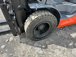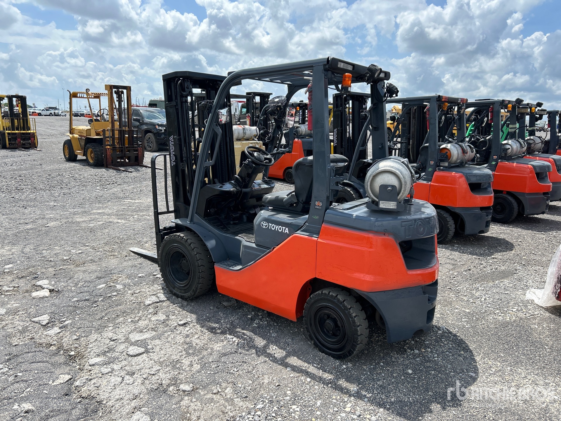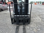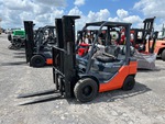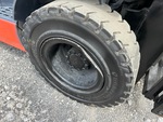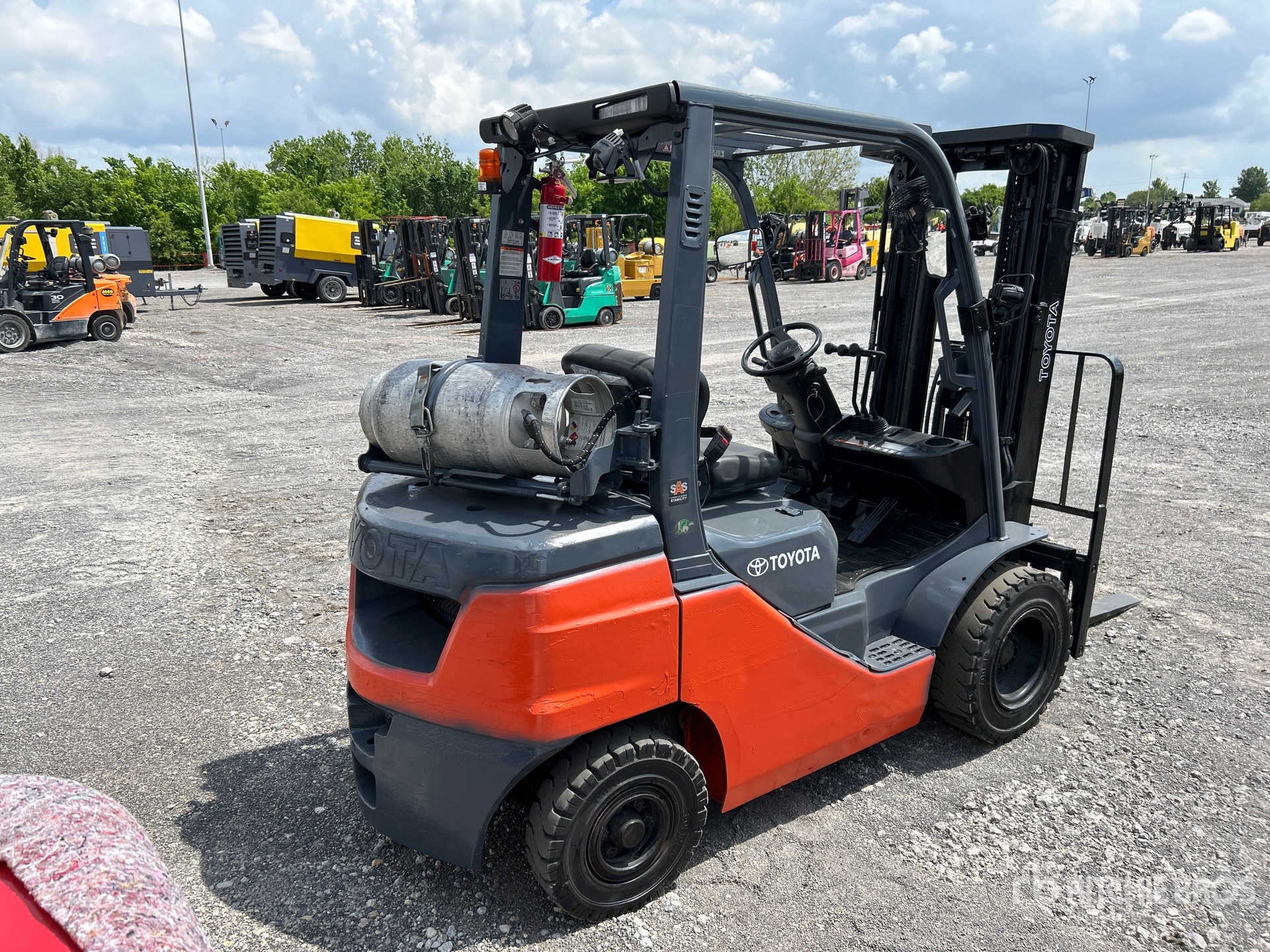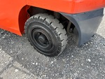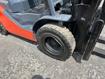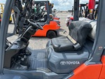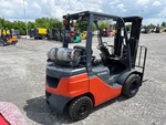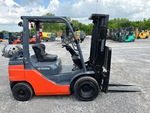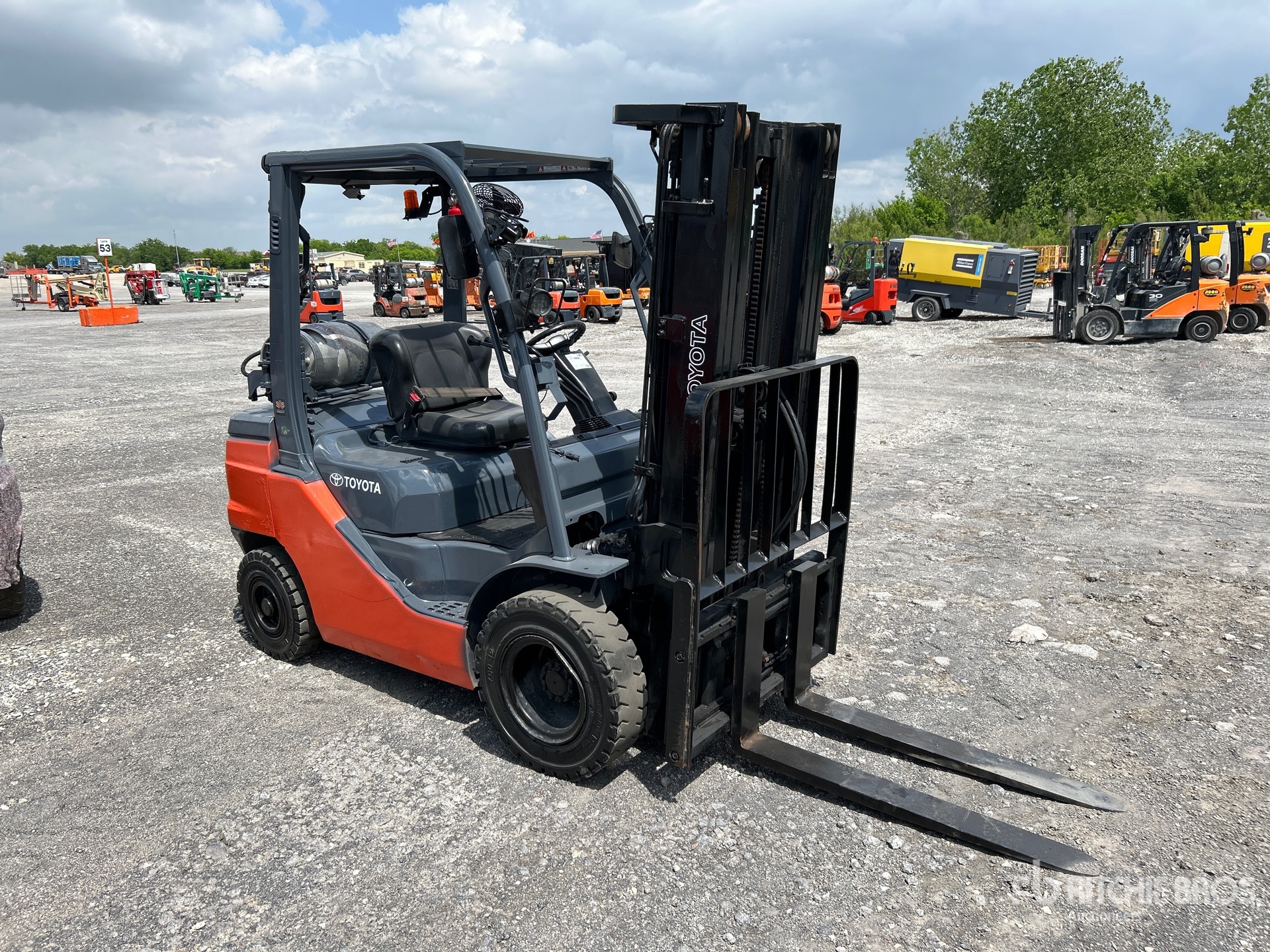 Située dans la voie 52, cette grue à mât à 3 étages offre une levée libre totale, une hauteur de levage maximale de 4,80 m (189 po), une hauteur de mât abaissée de 2,08 m (82 po), des fourches de 1,07 m (42 po), un déplacement latéral, des pneus pneumatiques pleins, et est conforme aux normes EPA américaines de 2020. Elle est équipée d'un moteur Toyota 4YECS à 4 cylindres de 38 kW et 2,2 L GPL.