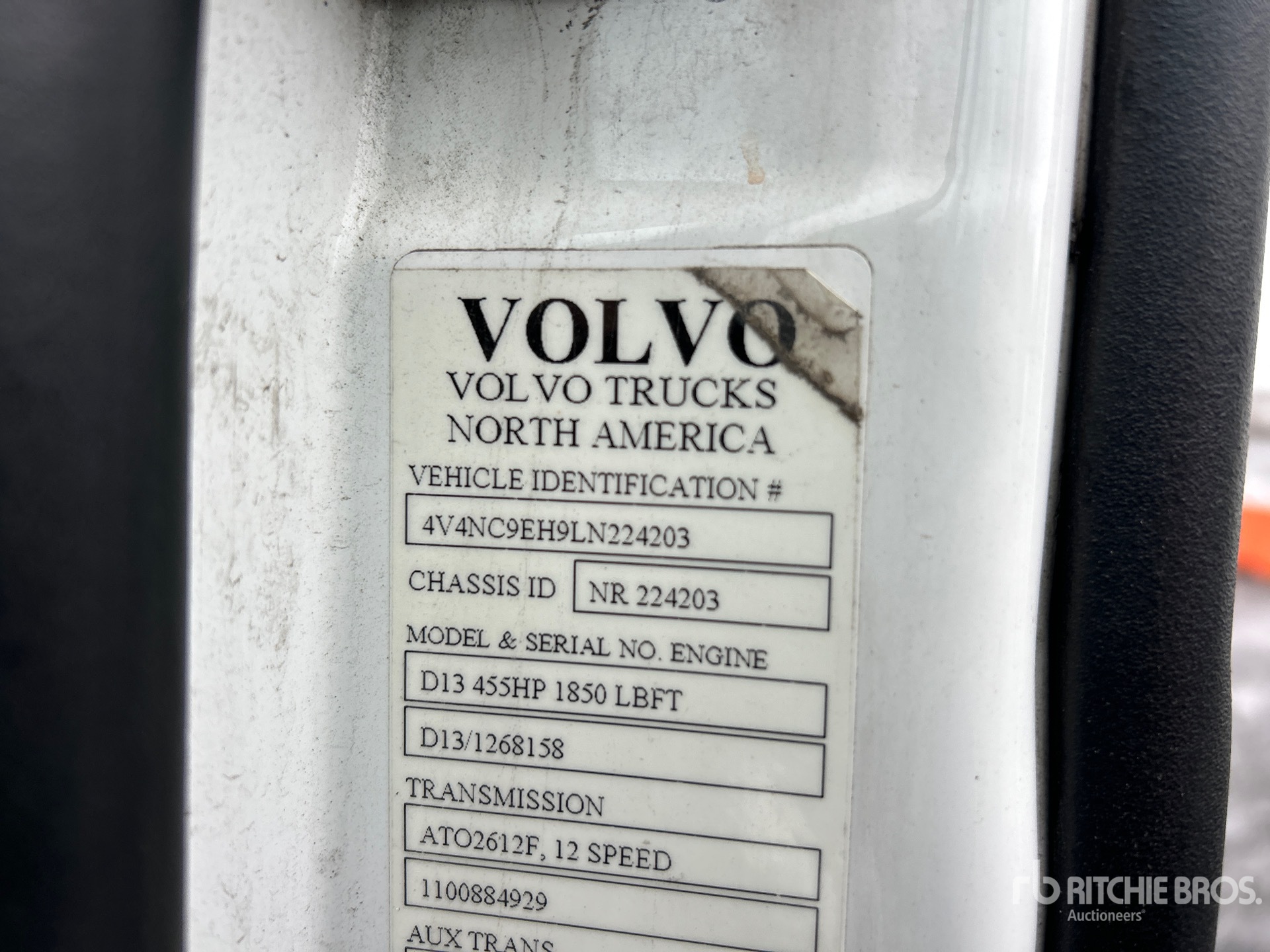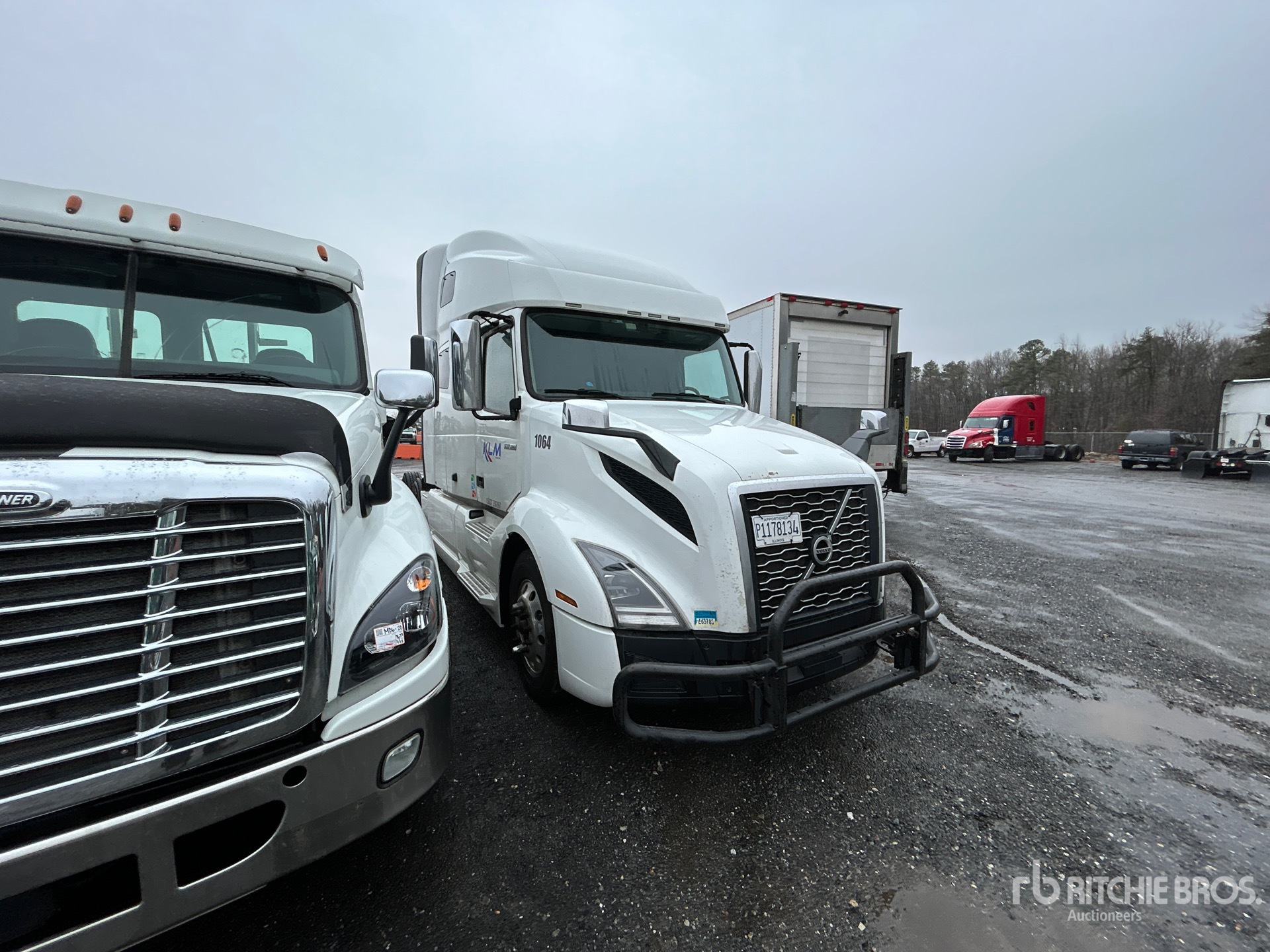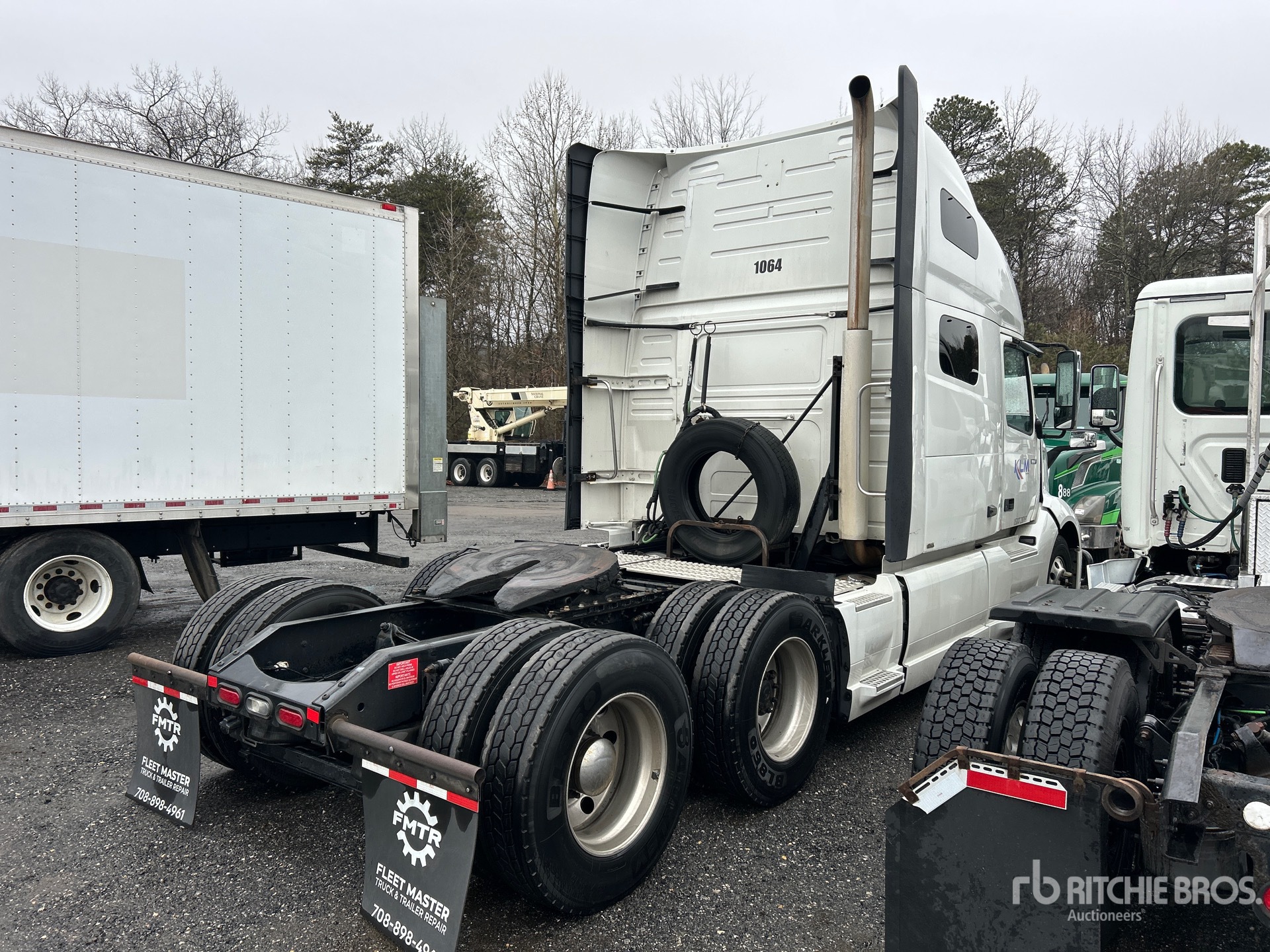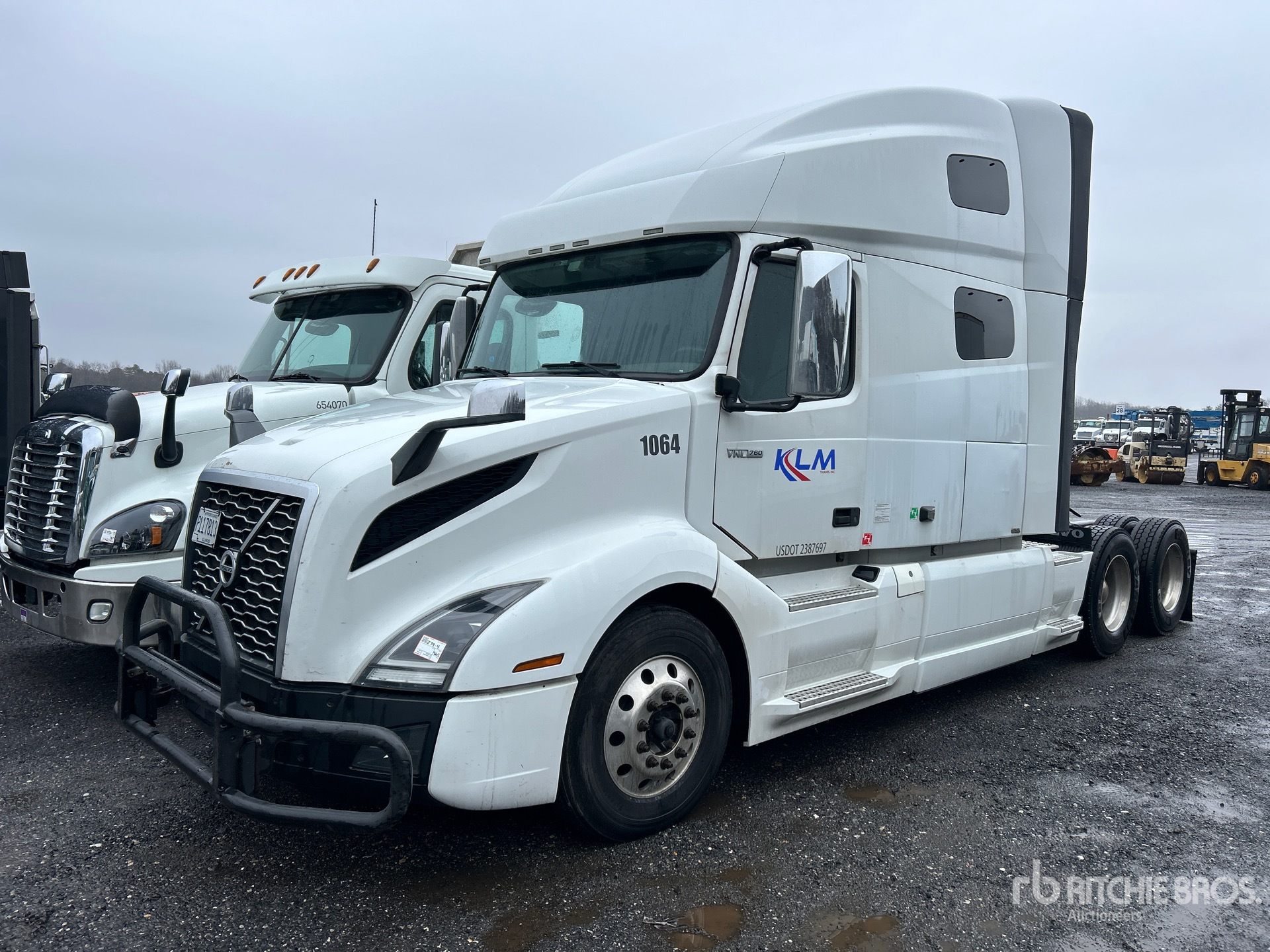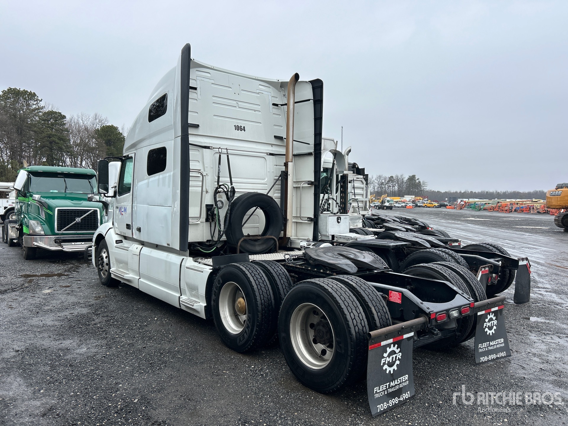 Situé sur la voie 41, emplacement 27, ce camion est équipé d'un moteur Volvo D13M de 455 ch, homologué EPA (États-Unis) 2019, d'une transmission automatisée Volvo ATO2612F à 12 rapports, d'un essieu avant de 5 987 kg (13 200 lb), d'essieux arrière de 17 137 kg (38 000 lb), d'un PTAC de 23 230 kg (51 200 lb), d'une cabine couchette surélevée de 178 cm (70 po), d'un empattement de 561 cm (221 po), d'une suspension pneumatique, de jantes en aluminium, de pneus 295/75R22.5 et d'une sellette d'attelage coulissante pneumatique.