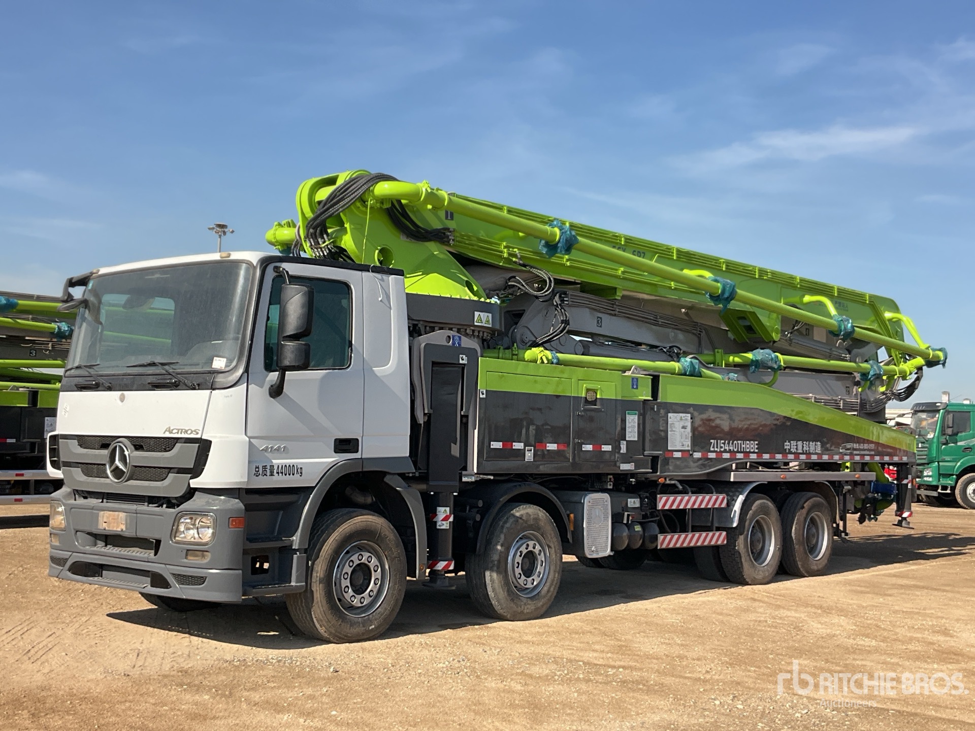 Moteur diesel Mercedes-Benz V6, nécessite AdBlue, frein moteur, boîte de vitesses manuelle à 16 rapports, double blocage de différentiel, pneus avant 385/55R22.5, pneus arrière 12R22.5, suspension à ressorts, prise de force, 848 heures de fonctionnement de la pompe, commandes radio à distance