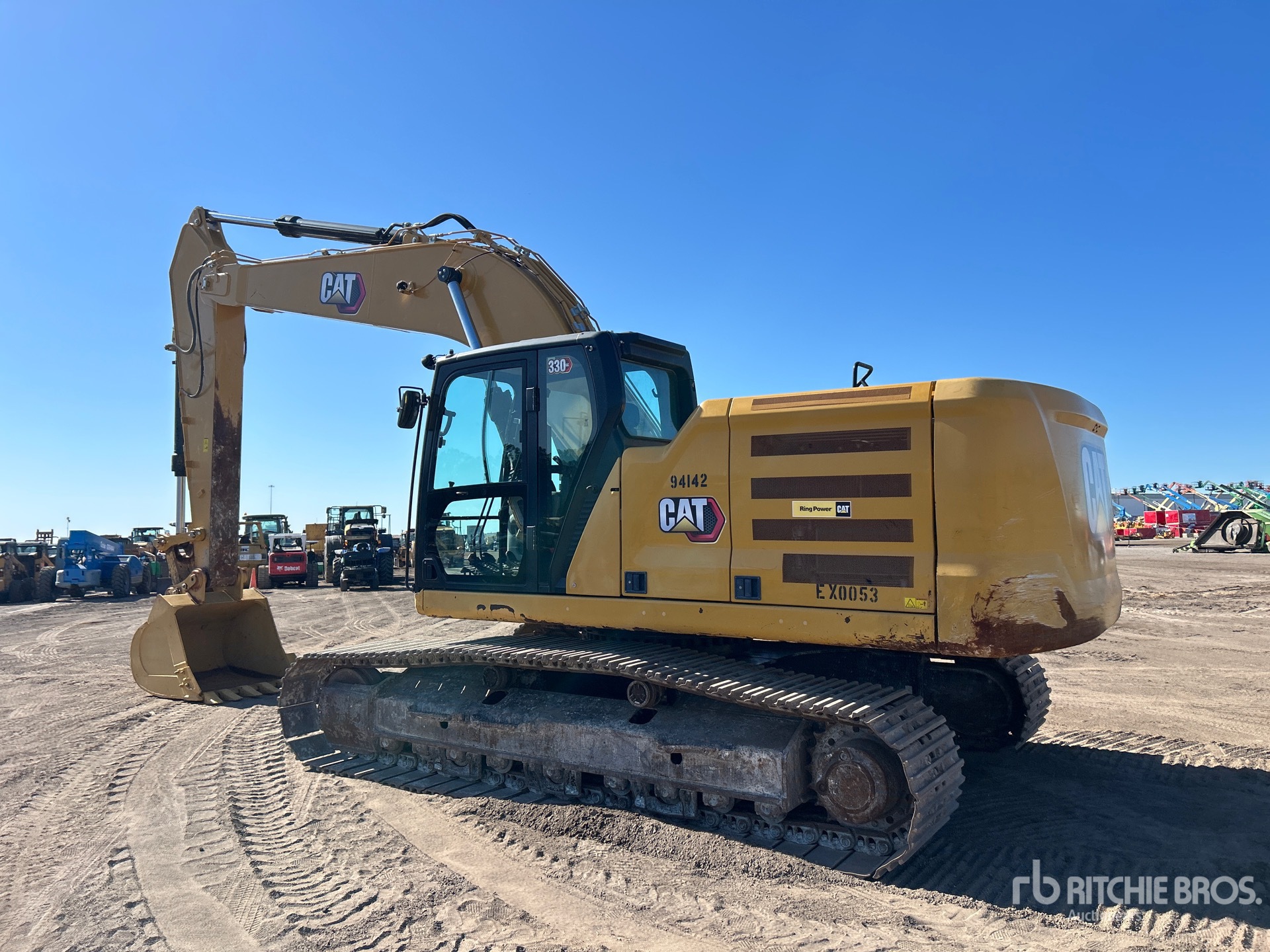 Climatisation, pédale de déplacement droite, sélecteur de mode de commande, caméras de recul et latérales, homologation EPA américaine 2020, bras de 3 m, chenilles à triple crampon de 81 cm, godet de creusement de 117 cm