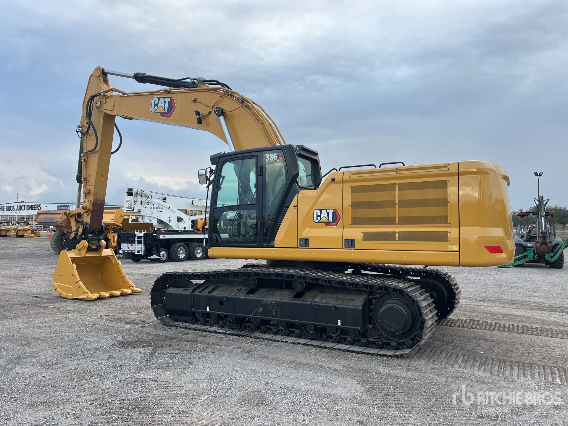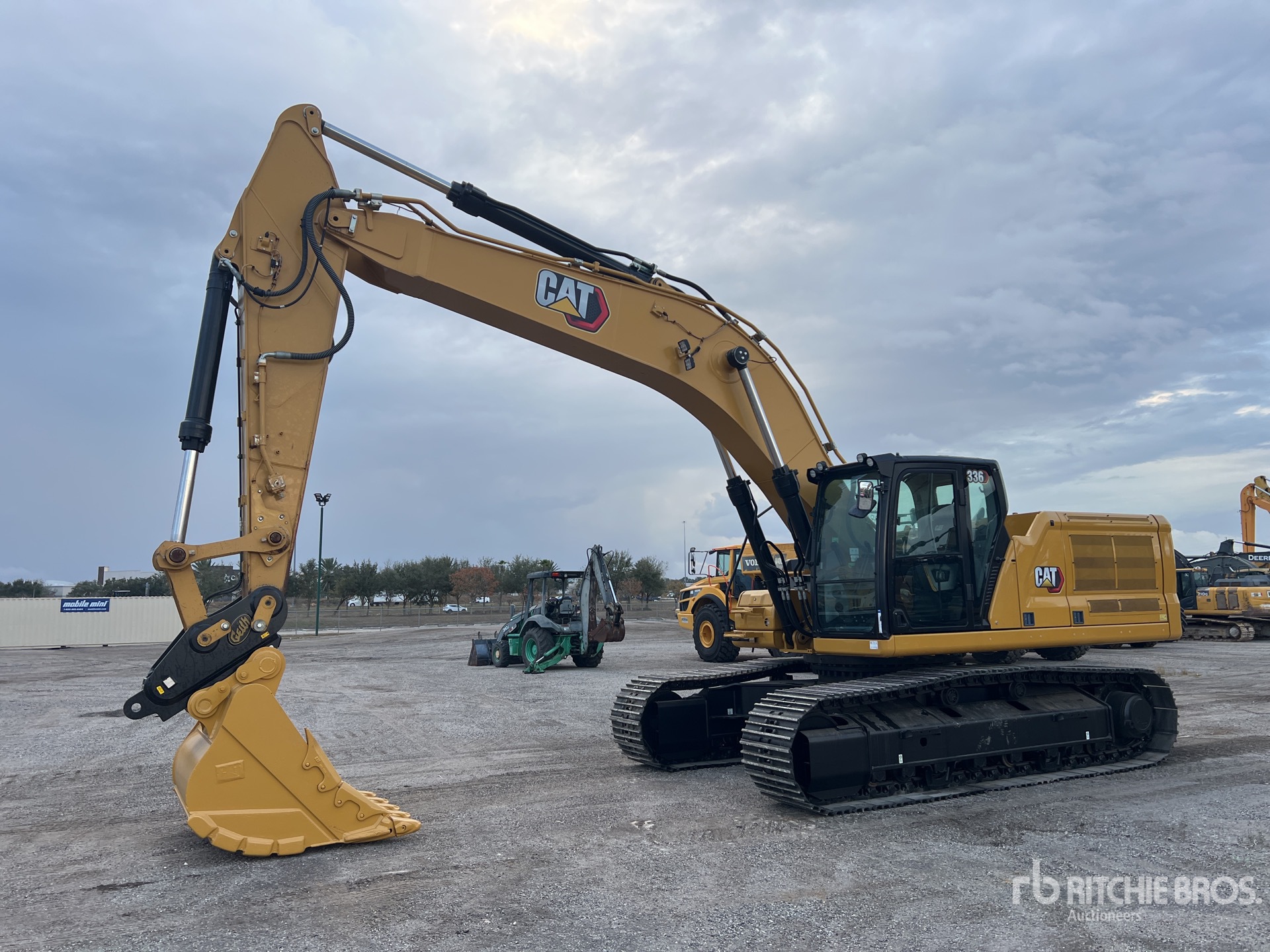 Climatisation, pédale de déplacement droite, sélecteur de mode de commande, caméras de recul et latérales, homologation EPA américaine 2021, nécessite du liquide d'échappement diesel, bras de 3,35 m, circuit hydraulique auxiliaire, chenilles à triple crampon de 70,5 cm, attache rapide hydraulique, godet de terrassement de 147 cm