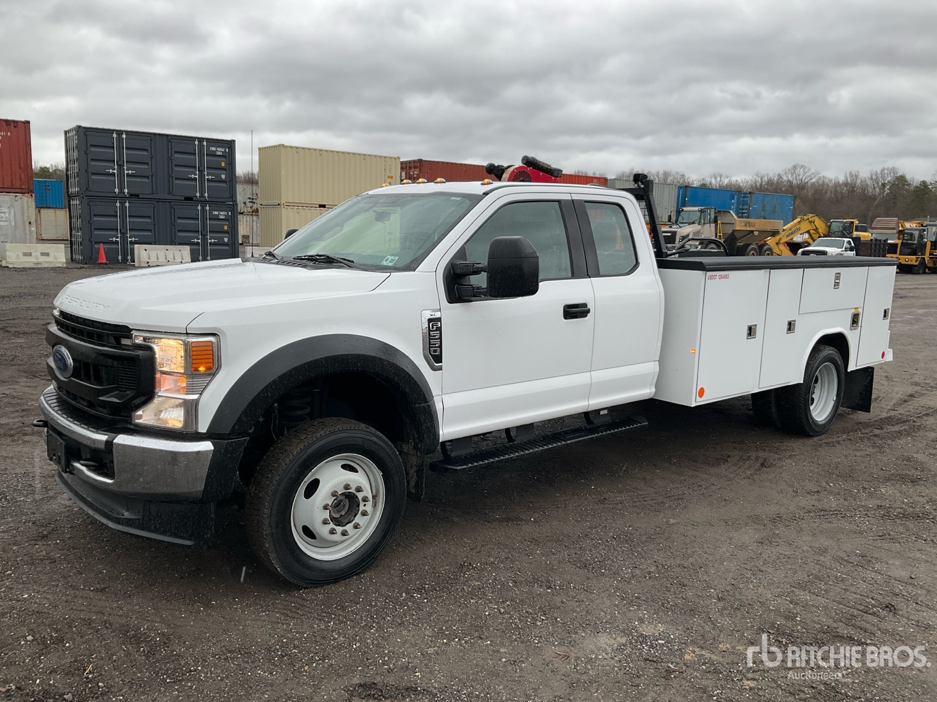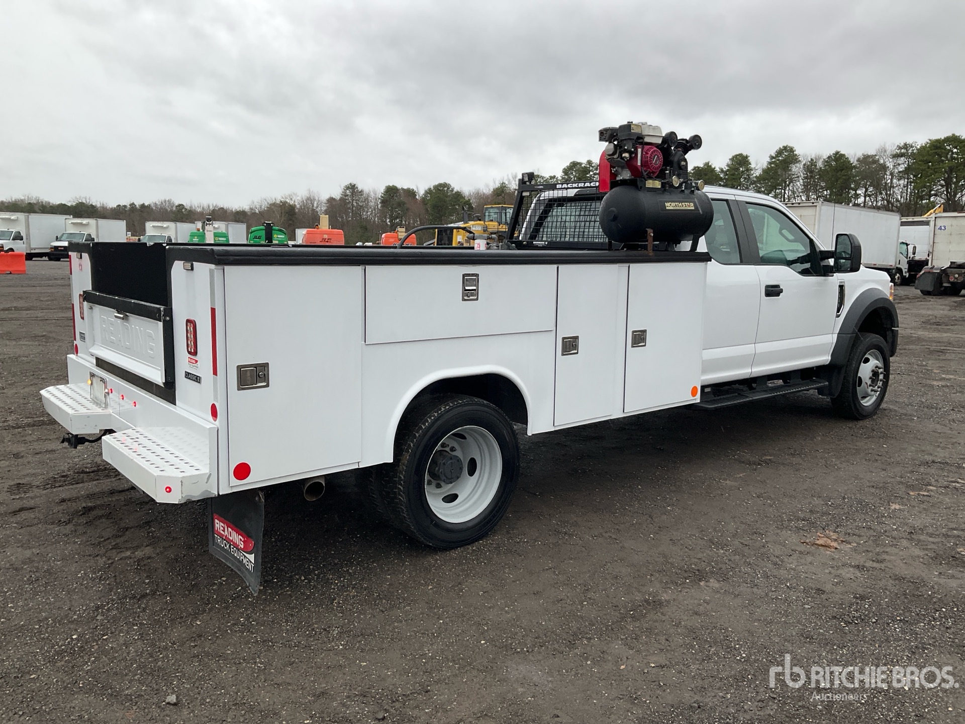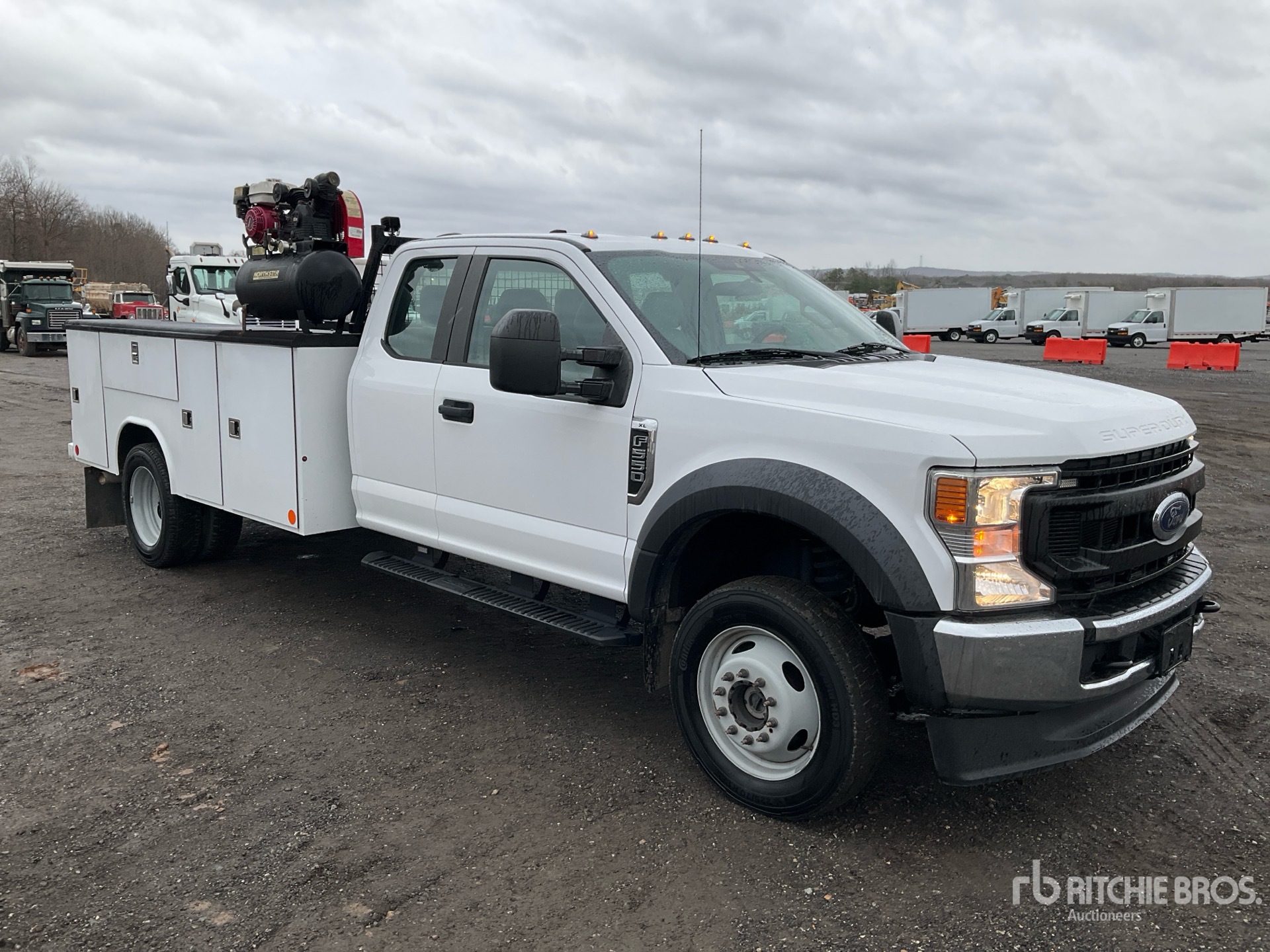 Situé sur la voie 46, emplacement 49, moteur Ford V8 7,3 L à essence, homologué EPA 2020, 1 618 heures moteur, transmission automatique, essieu avant de 3 175 kg, essieux arrière de 6 670 kg, PTAC de 8 845 kg, pneus 225/70R19.5, suspension à ressorts, empattement de 4 888 mm, carrosserie Reading Classic II de 3,35 m, compresseur d'air essence North Star de 0,39 m³/min