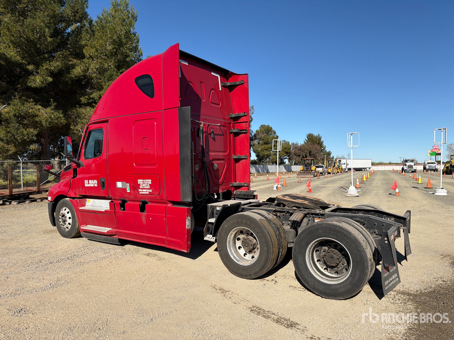 Moteur Detroit DD15 de 505 ch, homologué EPA 2020, 17 254 heures de fonctionnement, transmission automatisée Detroit DT12-1750-DH1 à 12 rapports, essieu avant de 5 670 kg, essieux arrière de 18 144 kg, PTAC de 23 830 kg, frein moteur, cabine couchette de 183 cm, lits superposés, chauffage dans les couchettes, empattement de 5,81 m, jantes en aluminium, pneus avant et arrière 295/75R22.5, sellette d'attelage coulissante pneumatique, deux réservoirs de carburant.