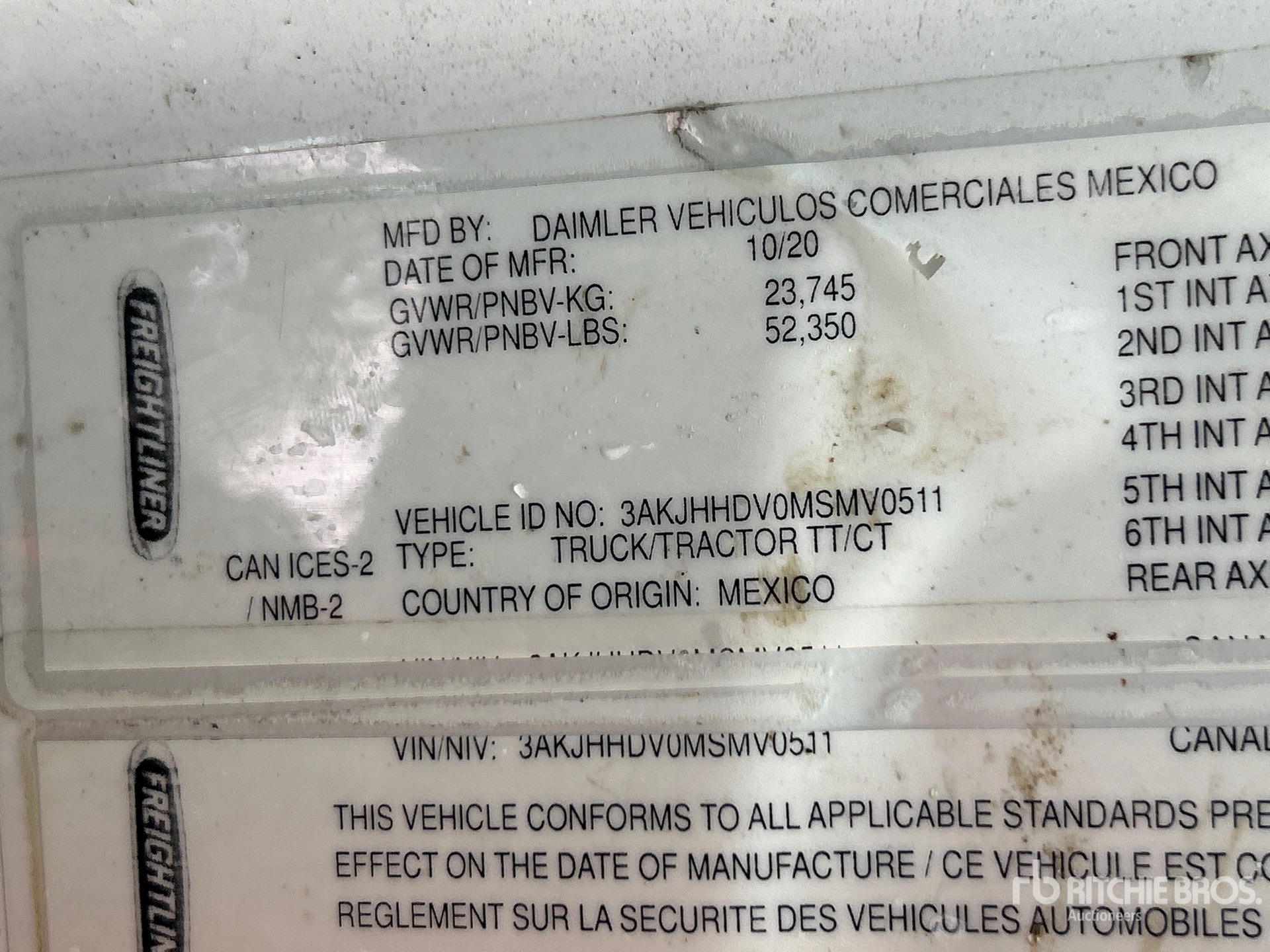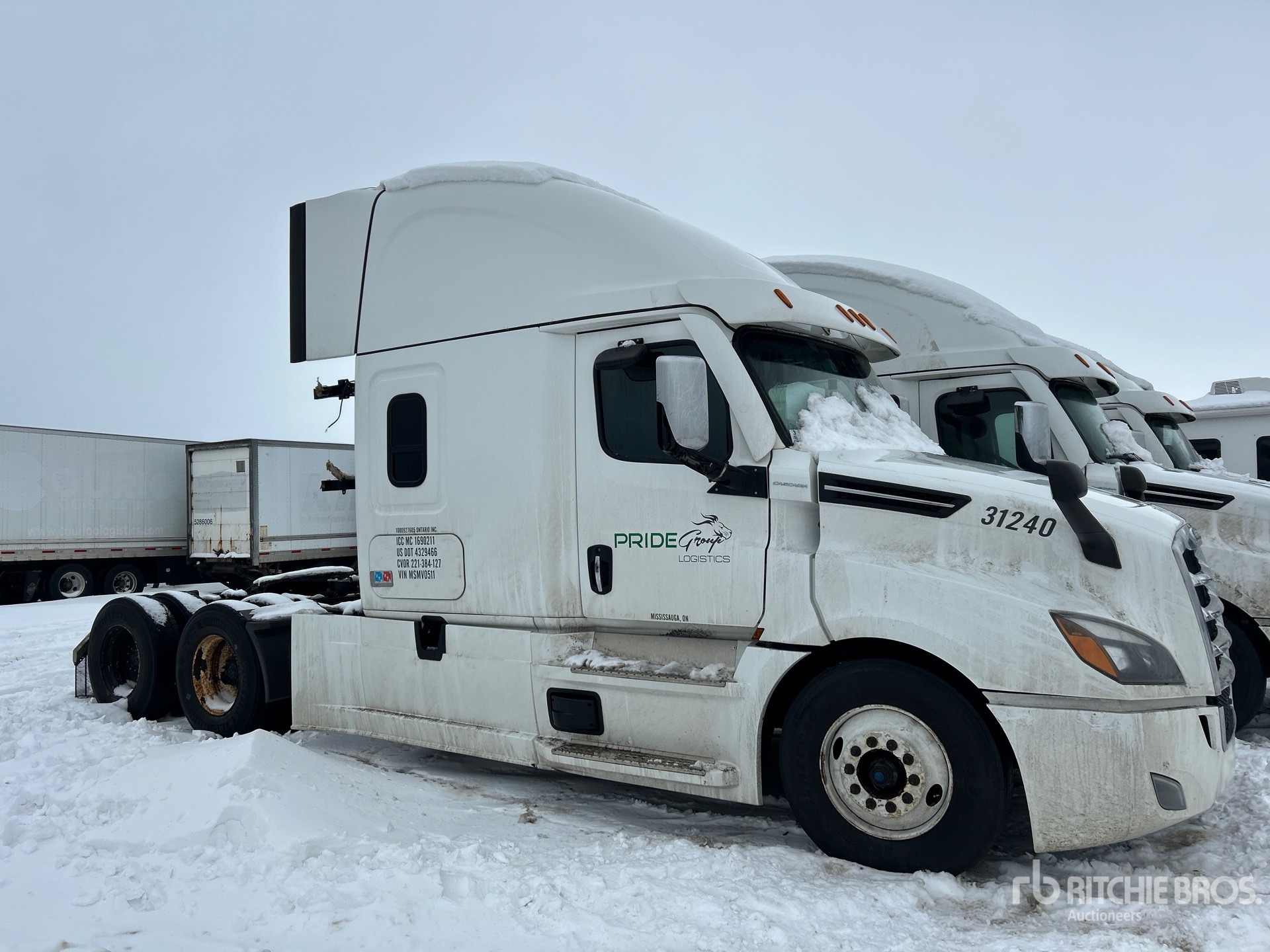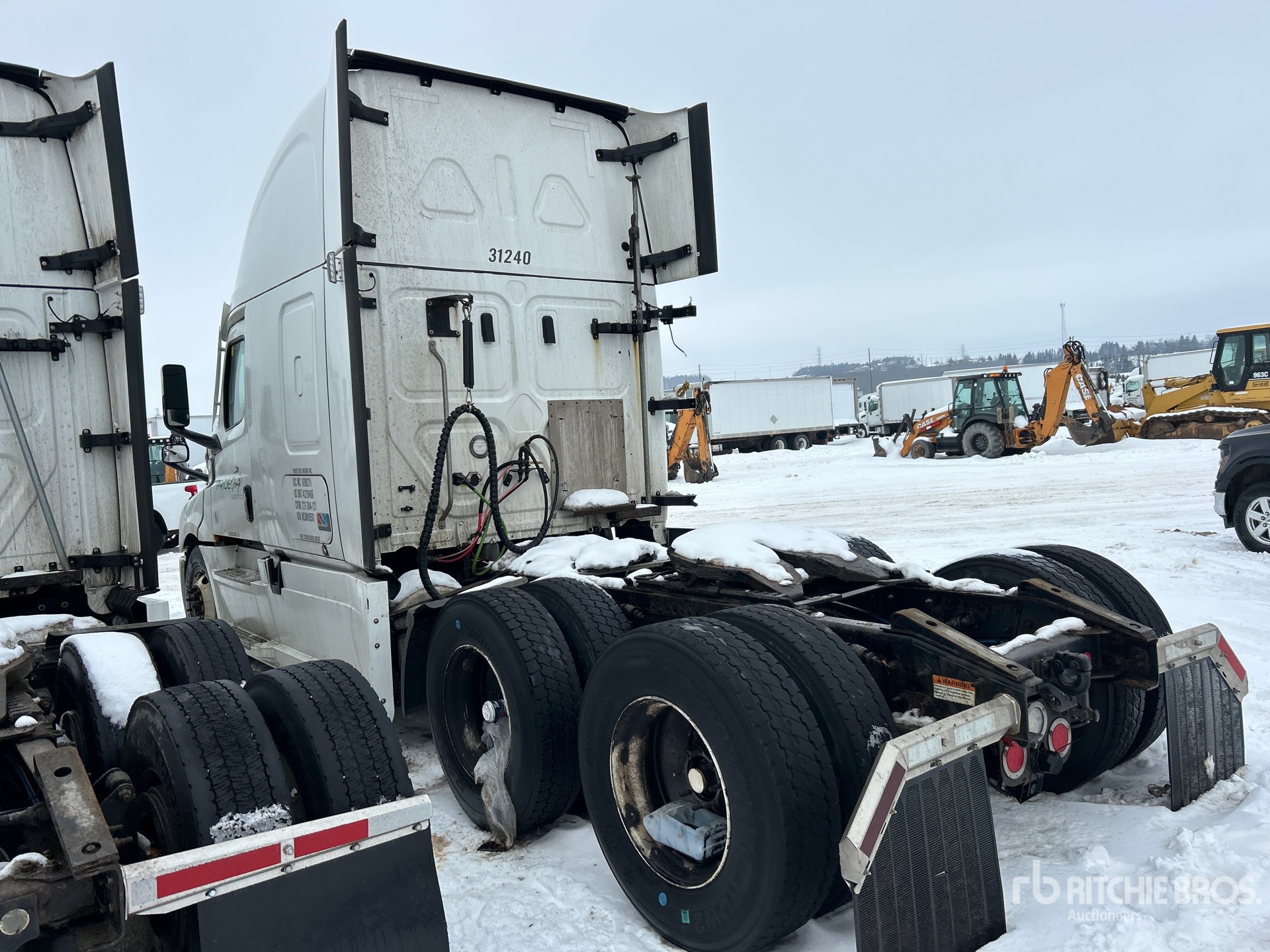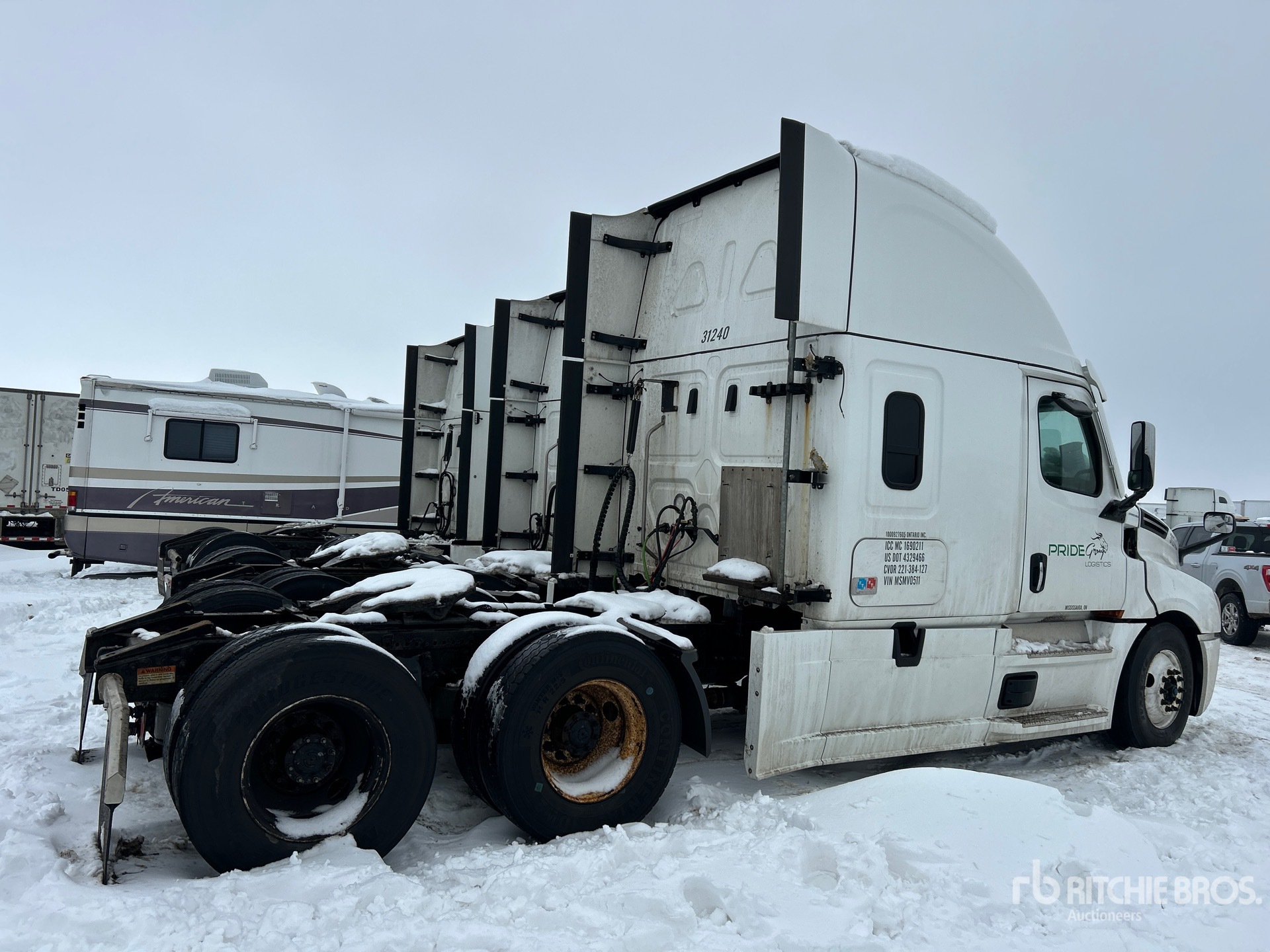 Situé dans la voie 18, moteur Detroit DD13 de 525 ch, homologué EPA 2020, essieu avant de 5 600 kg, essieux arrière de 18 144 kg, PTAC de 23 700 kg, frein moteur, double blocage de différentiel, cabine couchette surélevée de 178 cm, empattement de 561 cm, suspension pneumatique, jantes en aluminium, pneus 11R22.5, sellette d'attelage coulissante pneumatique, double réservoir de carburant.