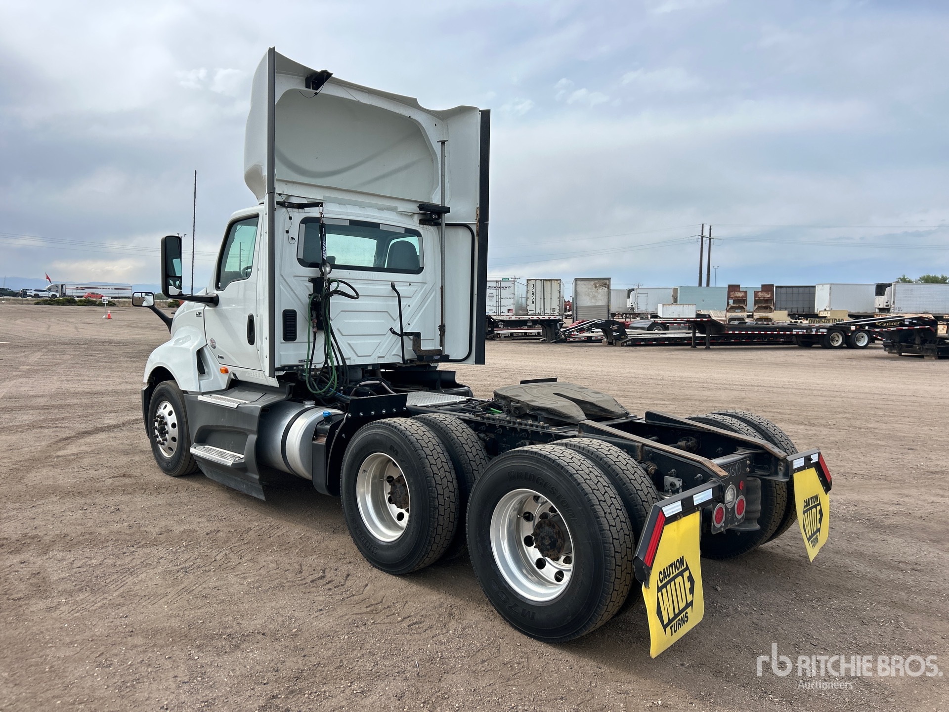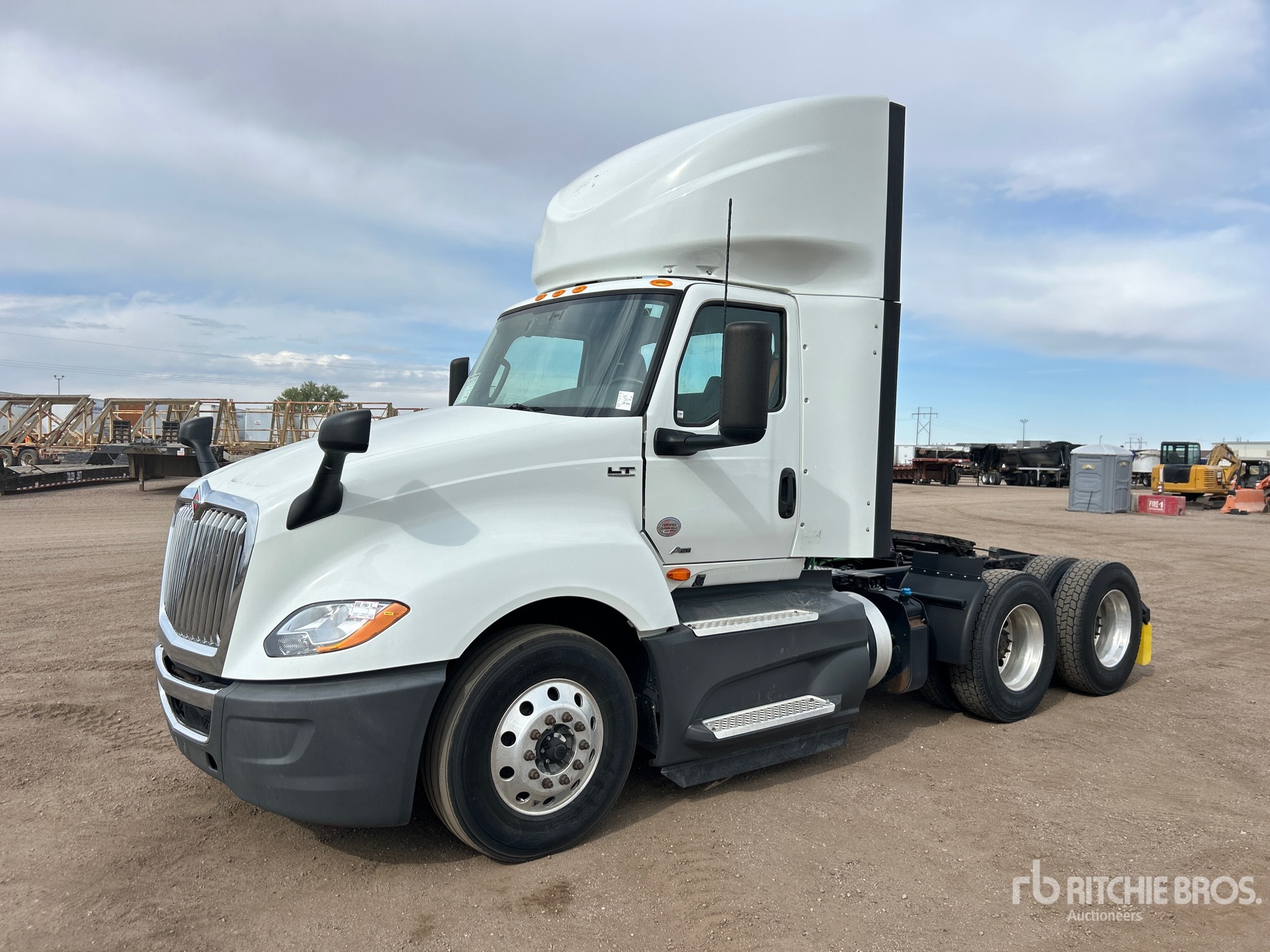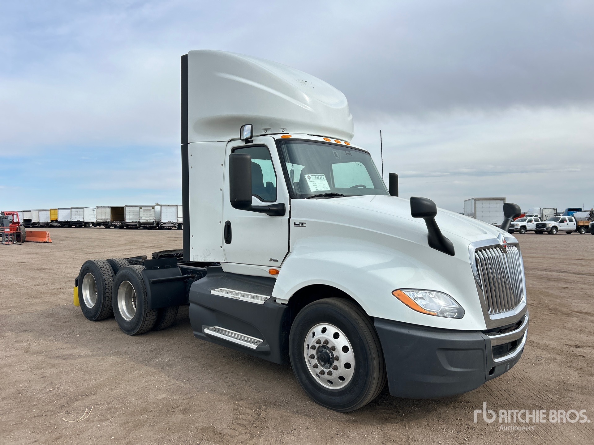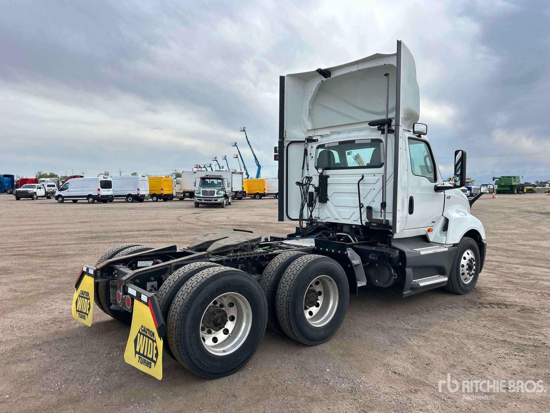 Moteur international A26 de 400 ch, homologué EPA 2020, 10 514 heures de fonctionnement, transmission automatique, essieu avant de 5 600 kg, essieux arrière de 18 144 kg, PTAC de 23 700 kg, frein moteur, empattement de 4,45 m, suspension pneumatique, jantes en aluminium, pneus 295/75R22.5, sellette d'attelage coulissante pneumatique