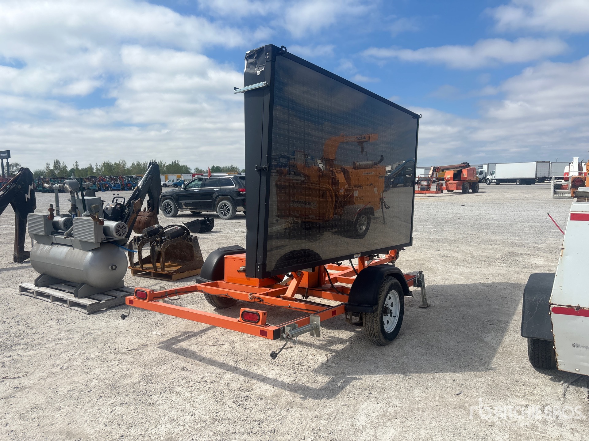 Éclairage DEL, alimentation solaire, levage et abaissement hydrauliques, remorque porte-engin à boule d'attelage, freins électriques