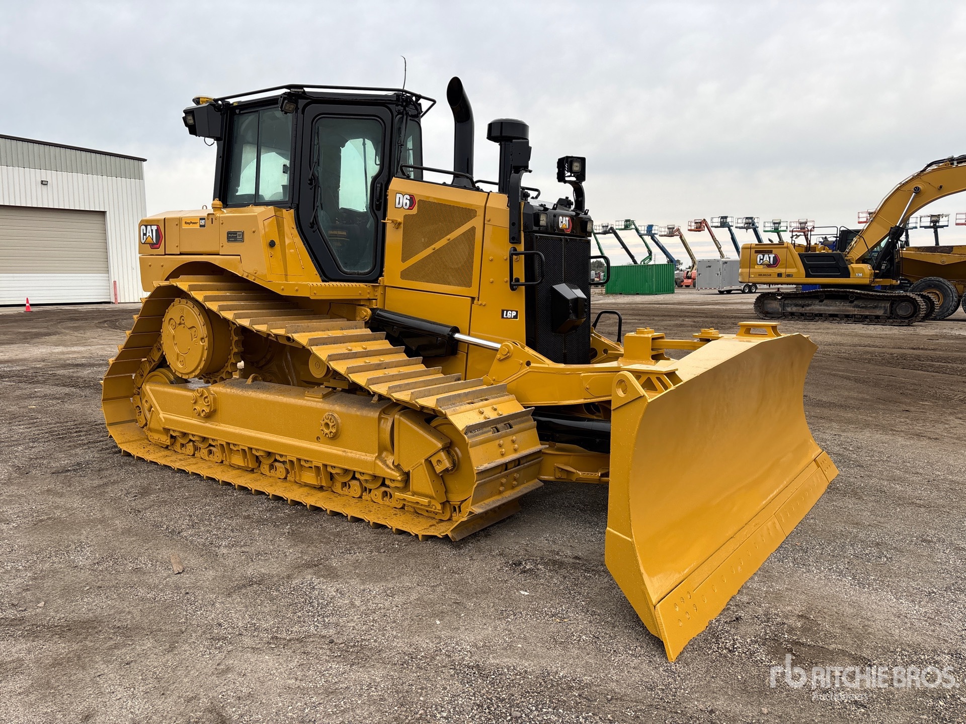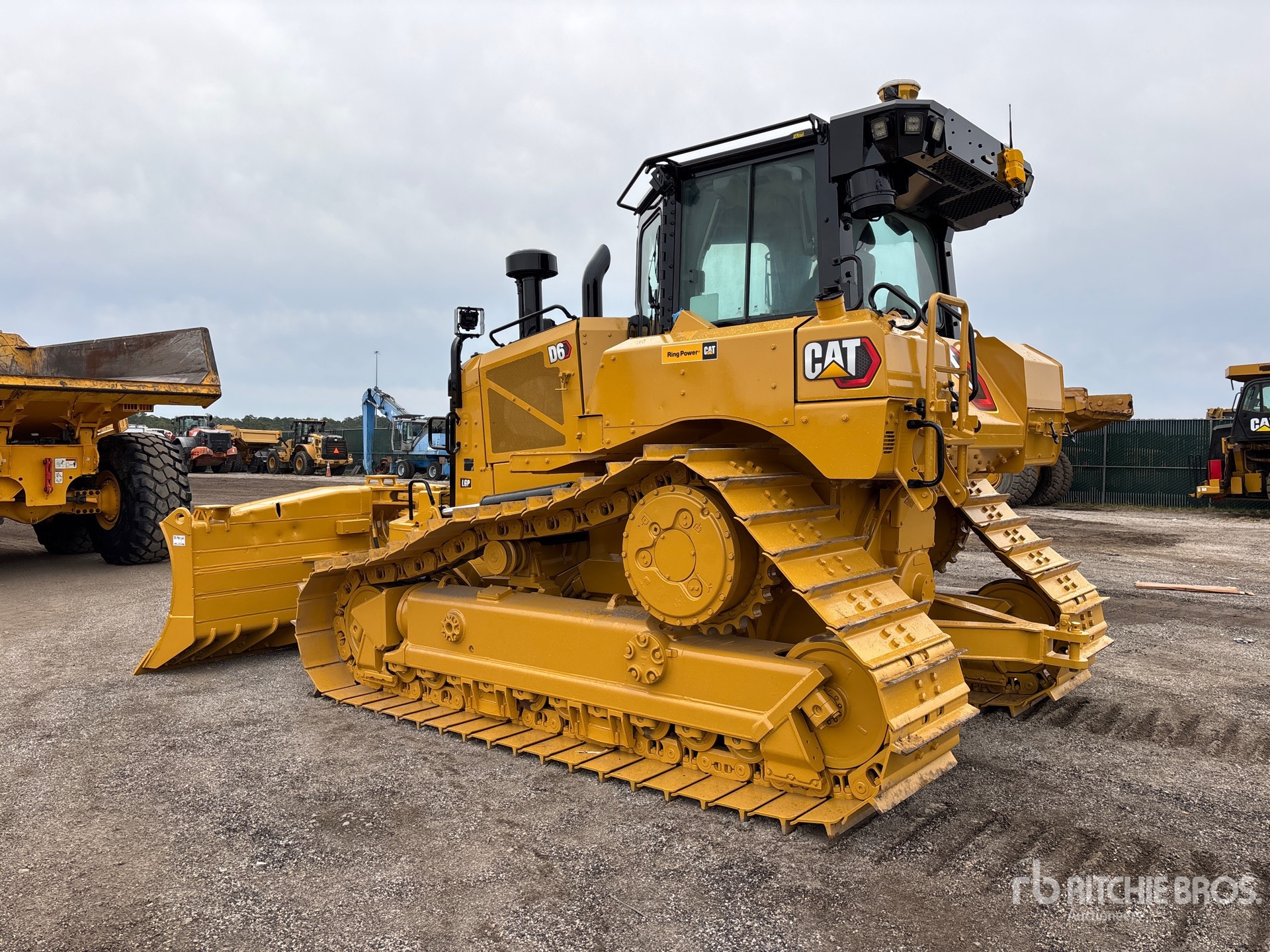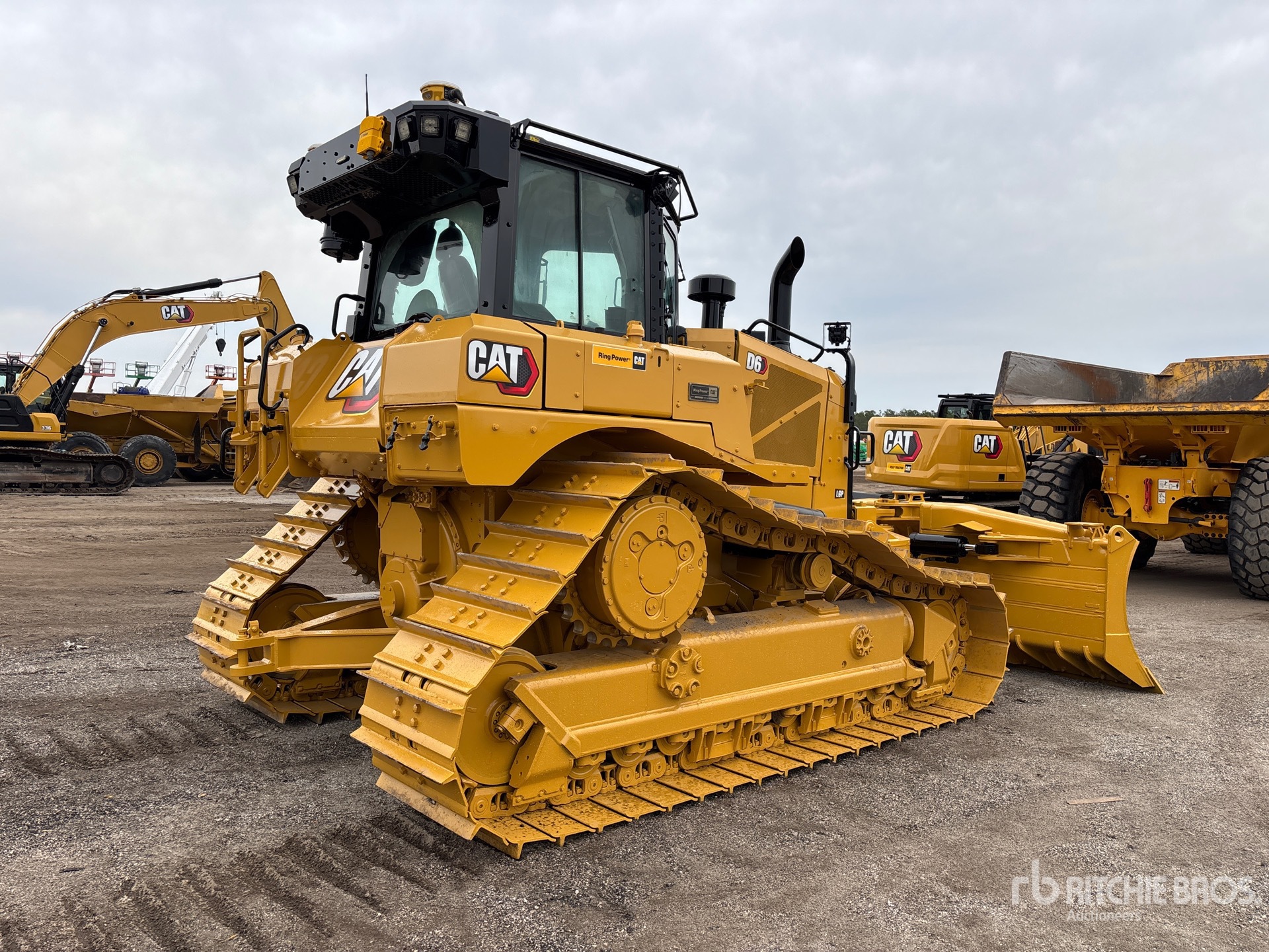 Cabine fermée, climatisation, GRADE avec 3D, nécessite du liquide d'échappement diesel, lame PAT de 149 pouces de large, chenilles à crampons simples de 30 pouces, train de roulement SystemOne, barre d'attelage, circuit hydraulique auxiliaire arrière, équipement de Ring Power Corporation