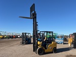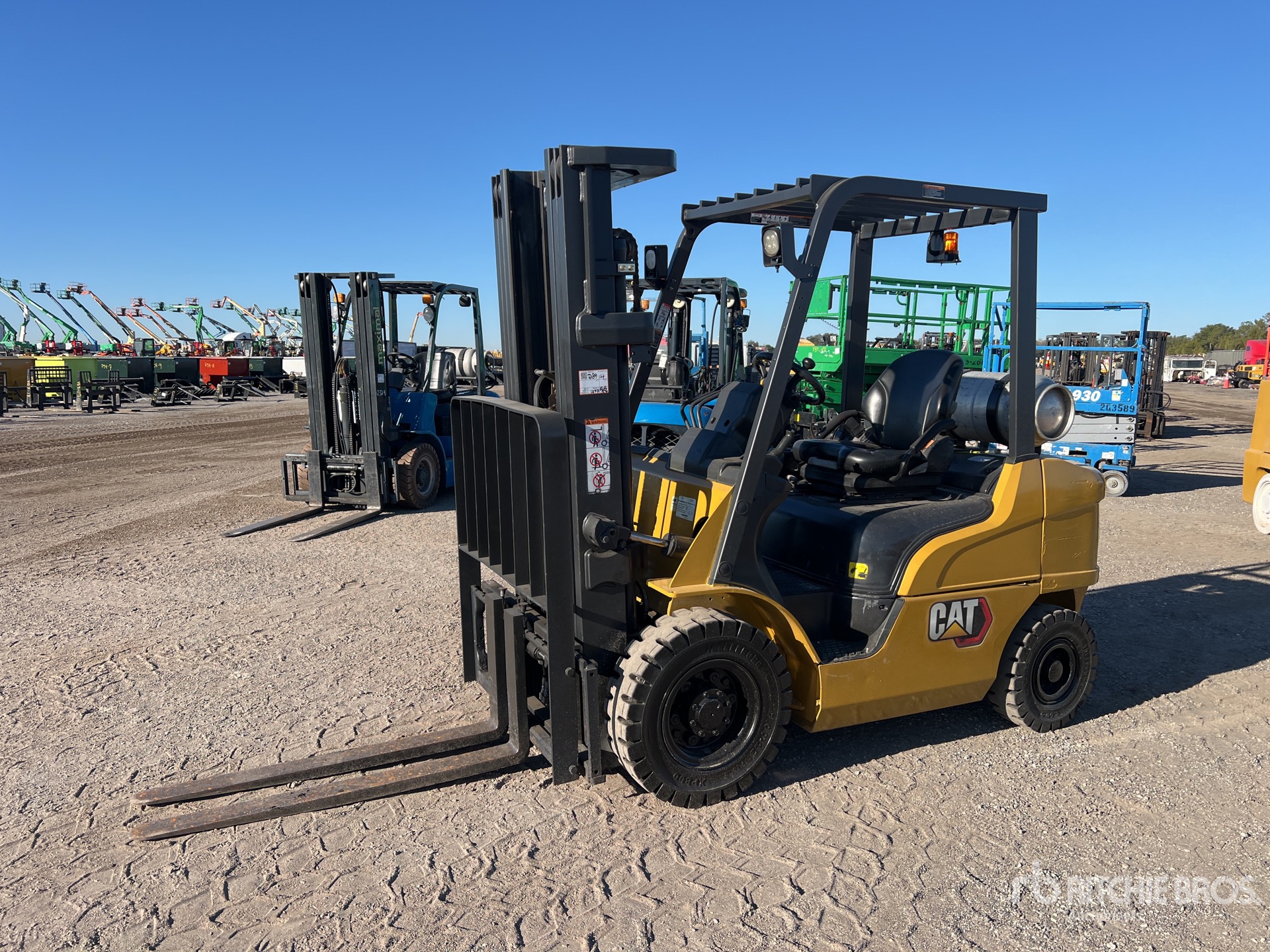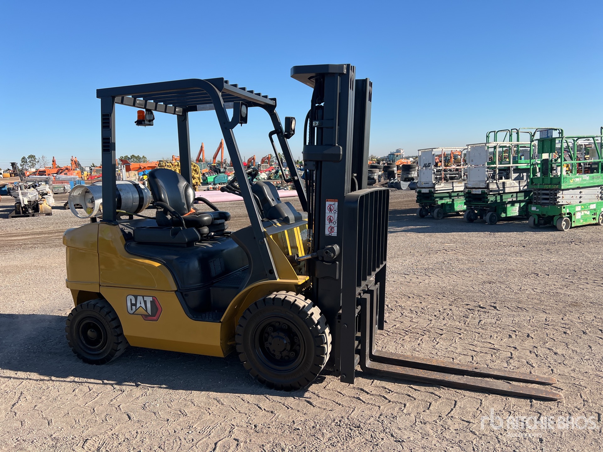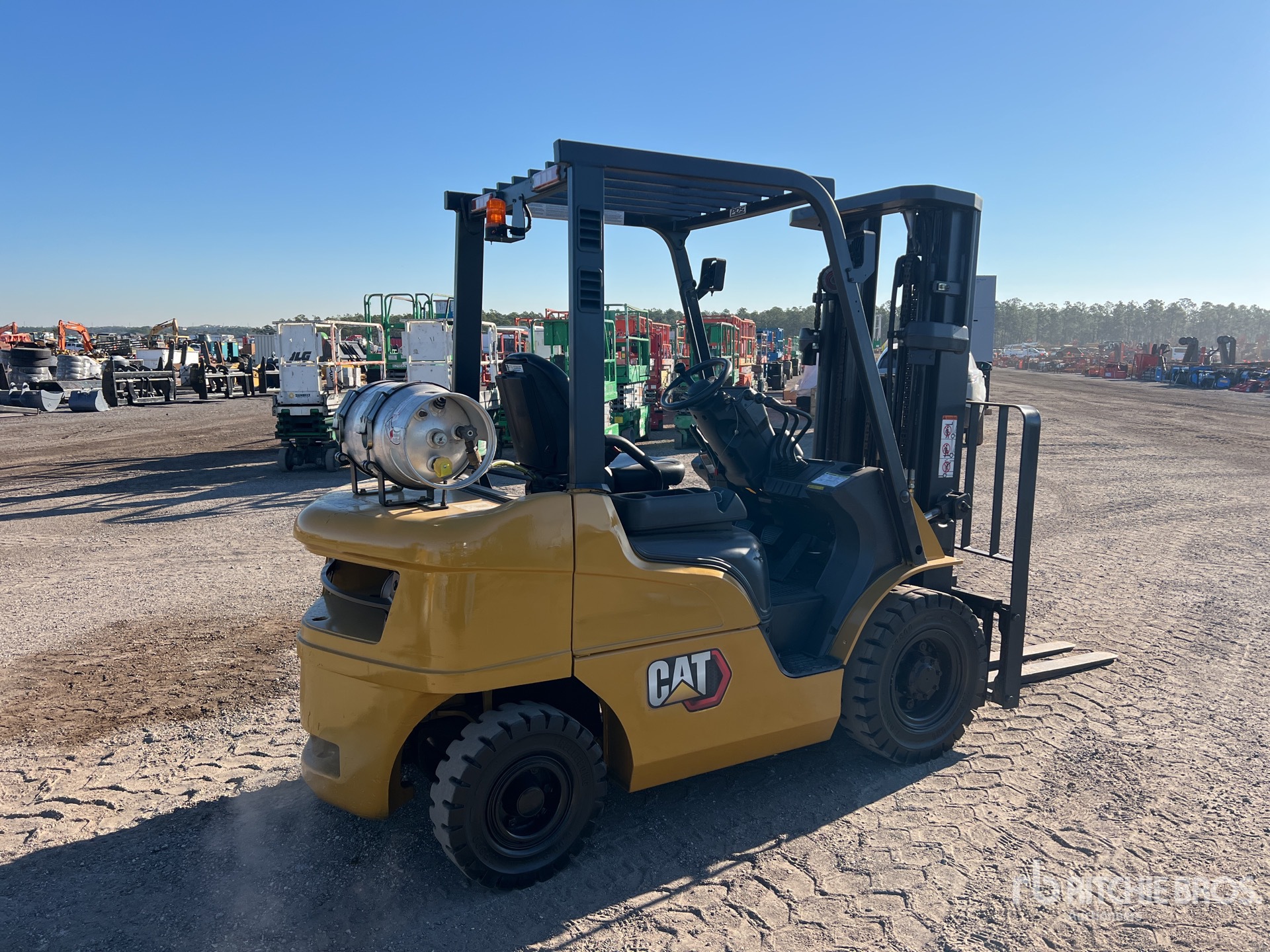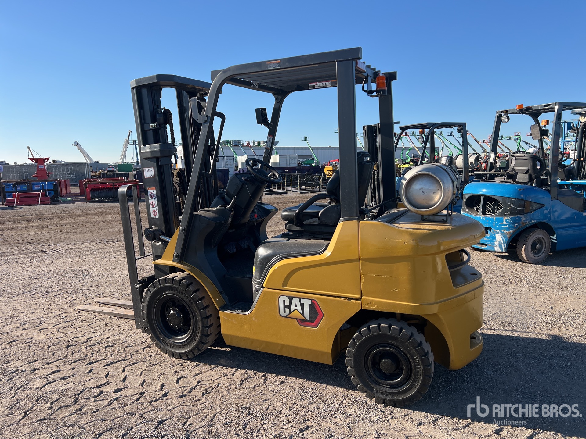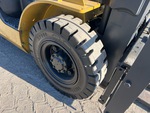 Mât à 3 sections, levage libre total, hauteur de levage maximale de 4,78 m, hauteur de mât abaissée de 2,13 m, fourches de 1,19 m, translation latérale, pneus pleins, moteur GPL 4 cylindres GCT