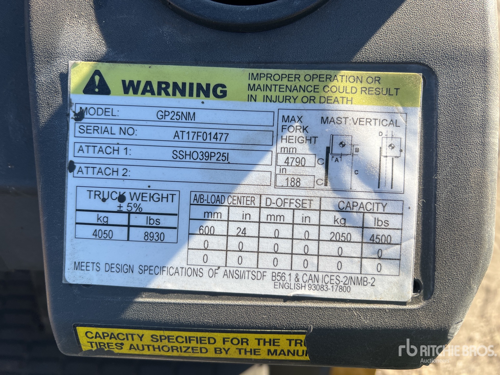 Les Informations détaillées de l’équipement sont d’une portée limitée, et les Encans Ritchie Bros. n’ont inspecté aucun autre aspect ou composant de l’équipement que ceux présentés expressément. Sauf indication précise, nous n’offrons aucune représentation ou garantie, officielle ou implicite, sur l’équipement ou ses composants, sans aucune limite de représentation ou de garantie en ce qui concerne la fonctionnalité, la conformité à toute norme de sécurité ou l’exigence de toute autorité ou agence de régulation en vigueur, l’adaptation à un quelconque usage, ou la valeur commerciale. Il vous est fortement conseillé d’effectuer votre propre inspection détaillée de l’équipement avant d’enchérir.