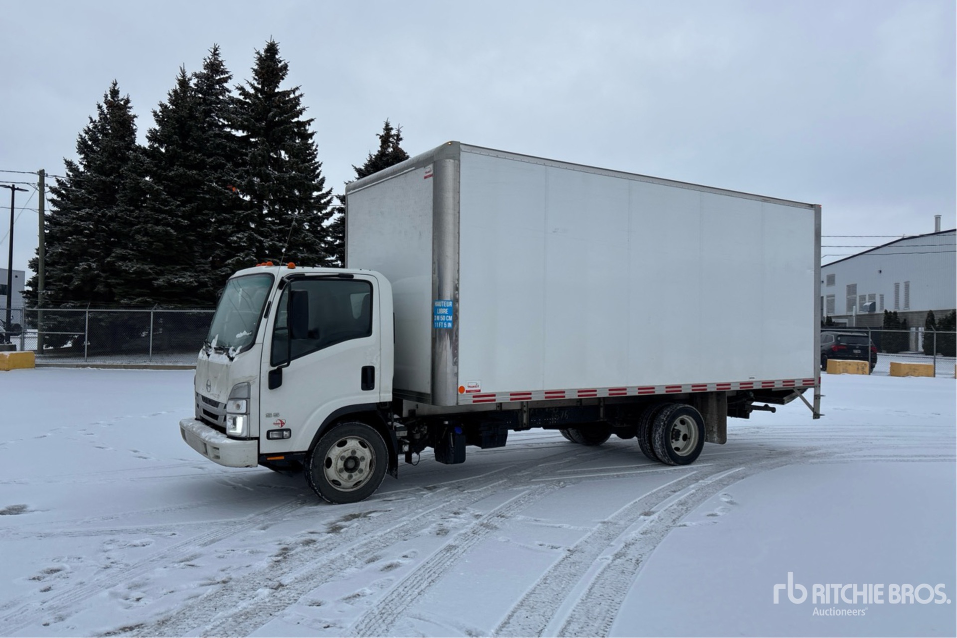 Isuzu 4HK1TC, moteur diesel 4 cylindres 5,2 L 210 ch, homologué EPA 2021, transmission automatique, essieu avant 3 300 kg, essieux arrière 6 170 kg, PTAC 8 845 kg, pneus avant et arrière 225/70R19.5, suspension à ressorts, empattement 4 470 mm, dimensions de la carrosserie : 6,10 m x 2,59 m x 2,49 m, hayon élévateur