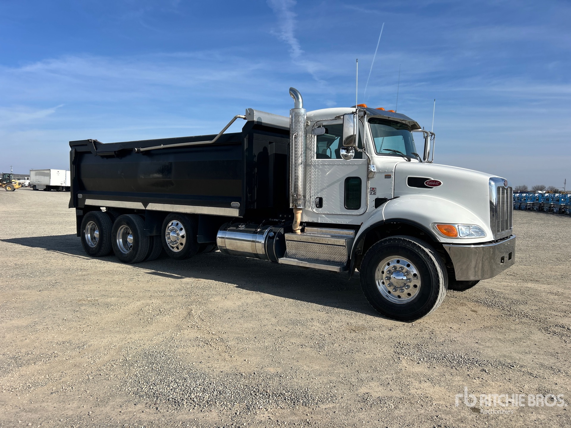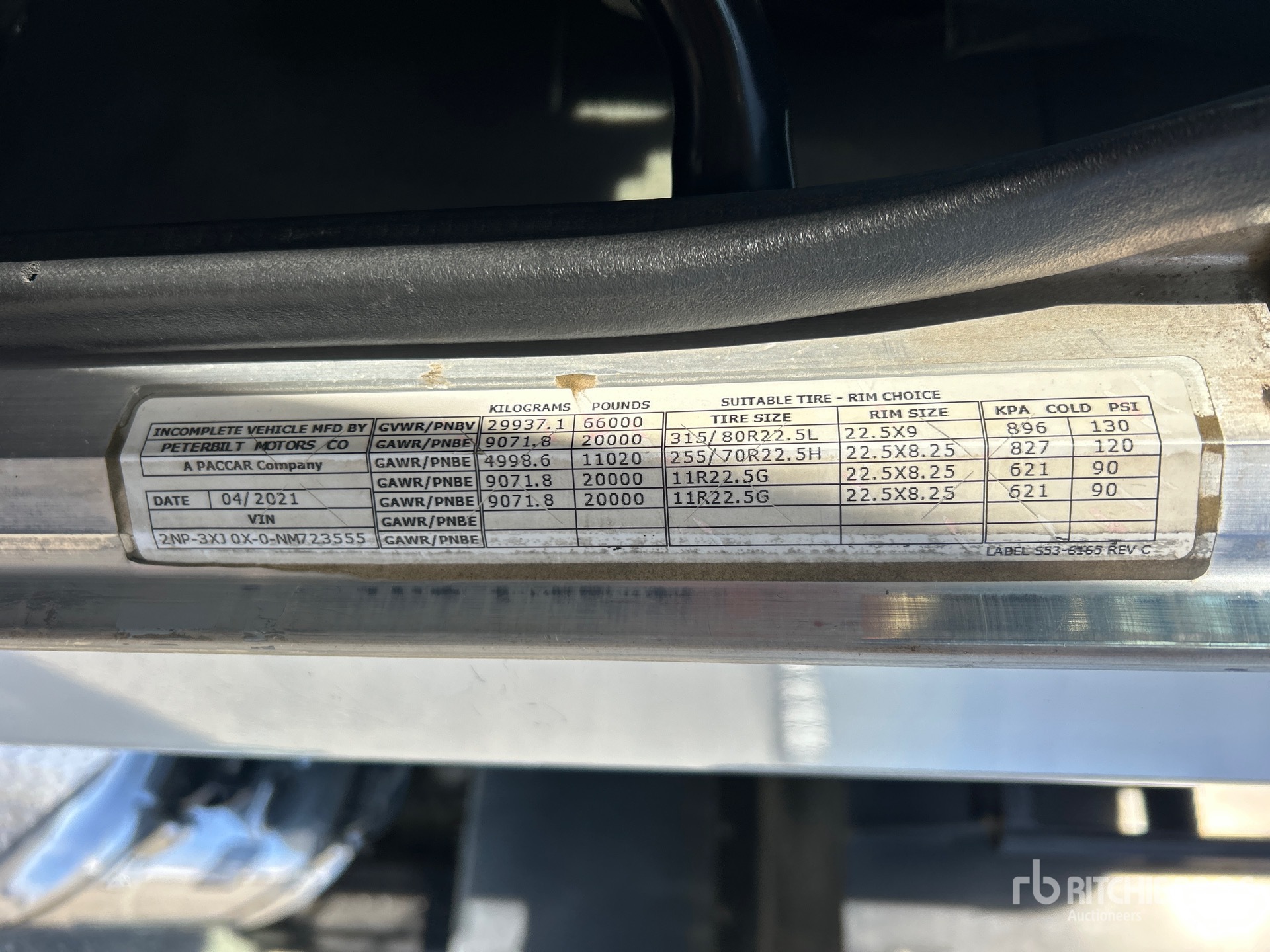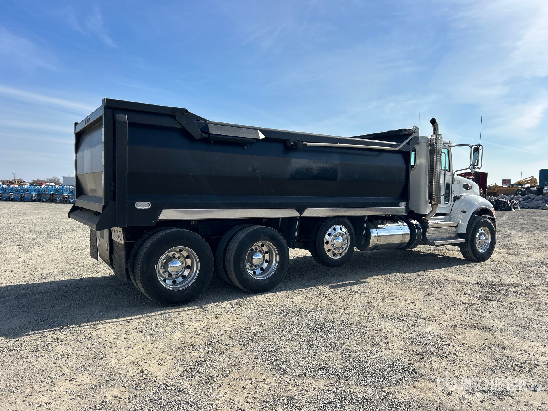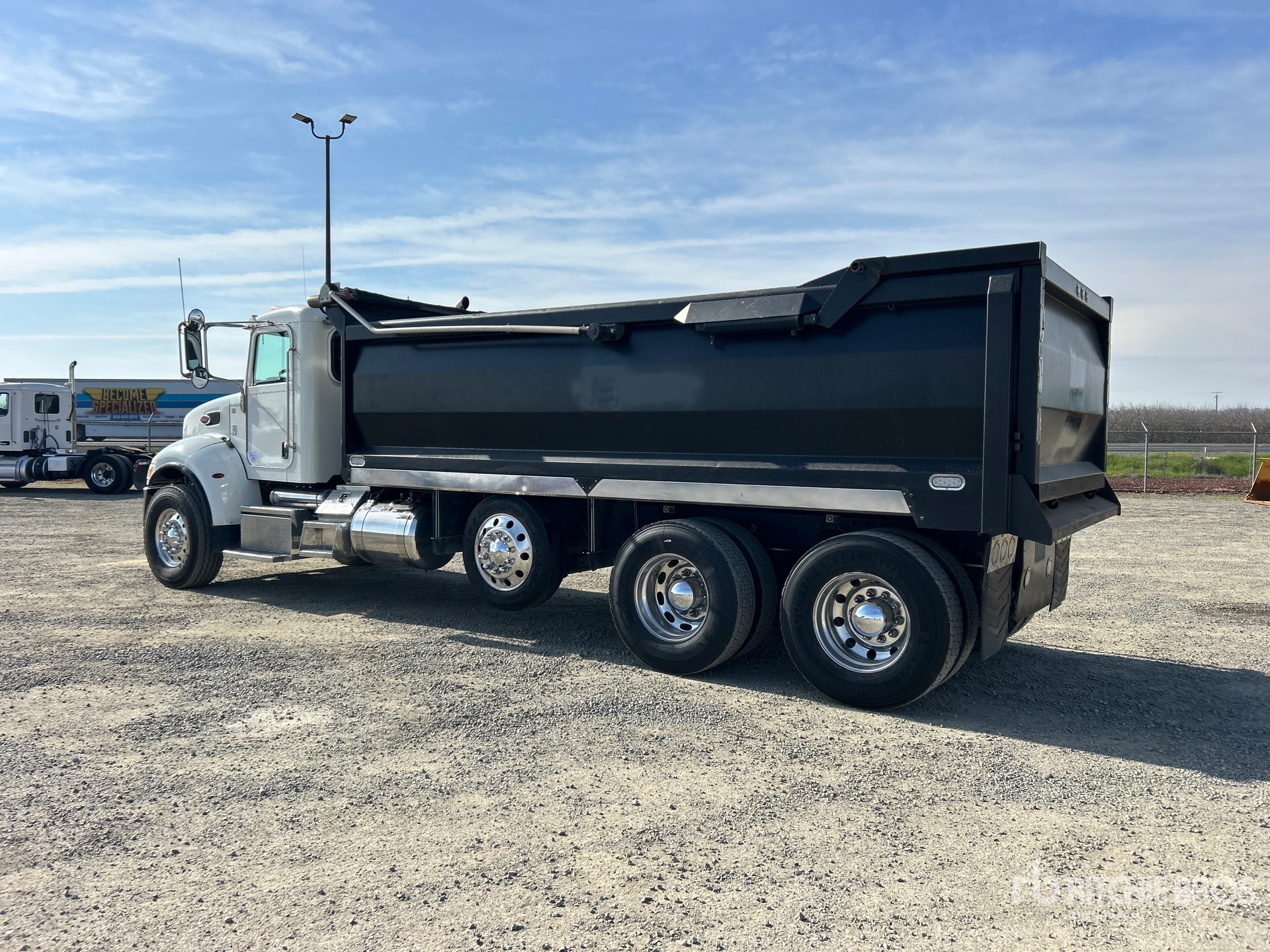 Situé dans la voie 9, ce camion Paccar L9 est équipé d'un moteur diesel 6 cylindres de 8,9 L développant 350 ch, conforme aux normes EPA américaines de 2021, nécessite l'utilisation d'un liquide d'échappement diesel (DES), affiche 7 029 heures de fonctionnement, un frein moteur, une transmission automatique Allison, un essieu avant de 9 072 kg (20 000 lb), des essieux arrière de 20 864 kg (46 000 lb), un essieu porteur à suspension pneumatique, une double direction, un châssis renforcé, une suspension pneumatique Air Trac, un empattement de 6,55 m (258 po), une prise de force (PTO), une caisse en acier de 5,49 m (18 pi) de long x 1,20 m (3 pi 11 po) de hauteur, un fond arrondi, une bâche à enroulement électrique et un hayon élévateur.
