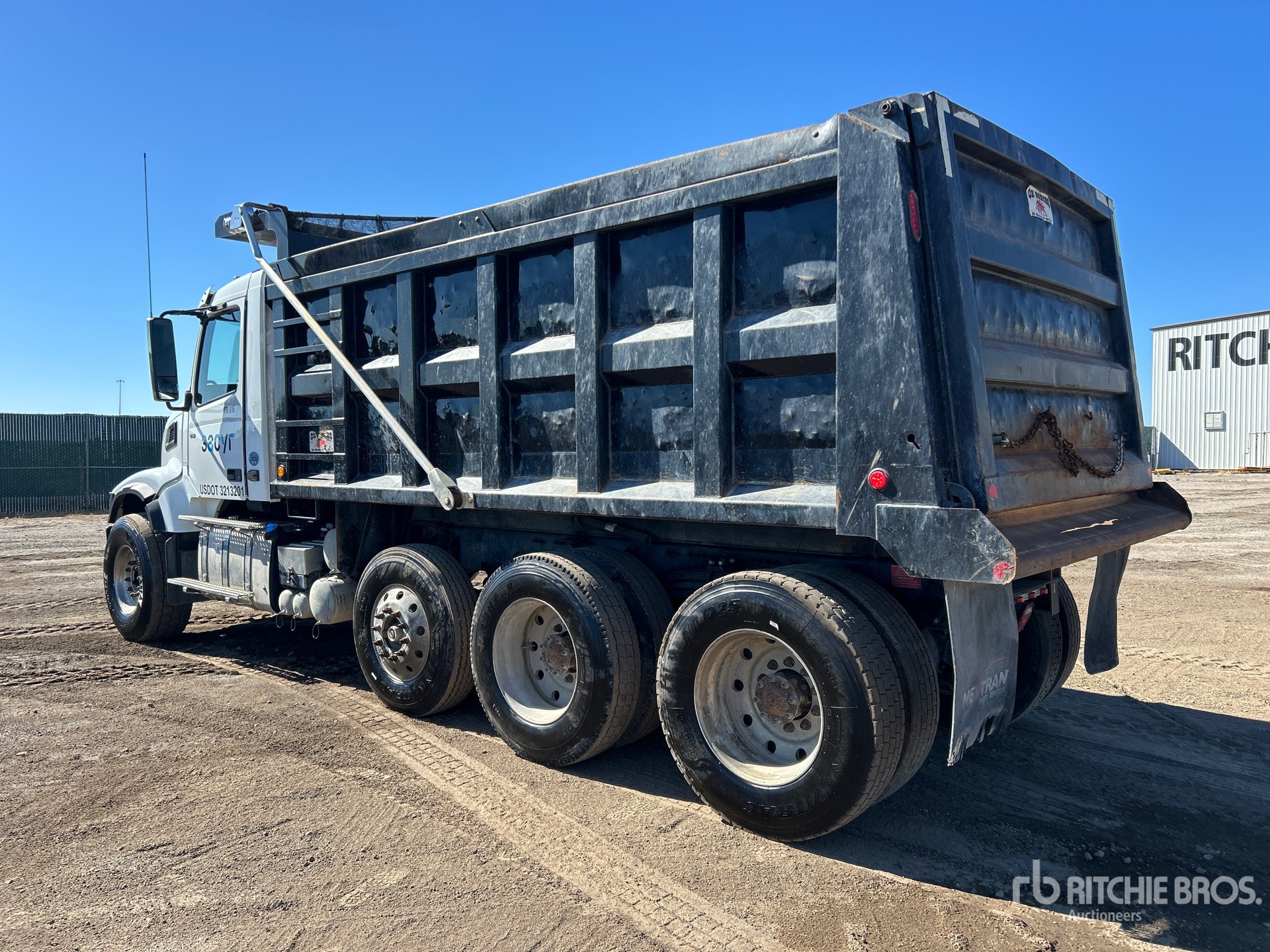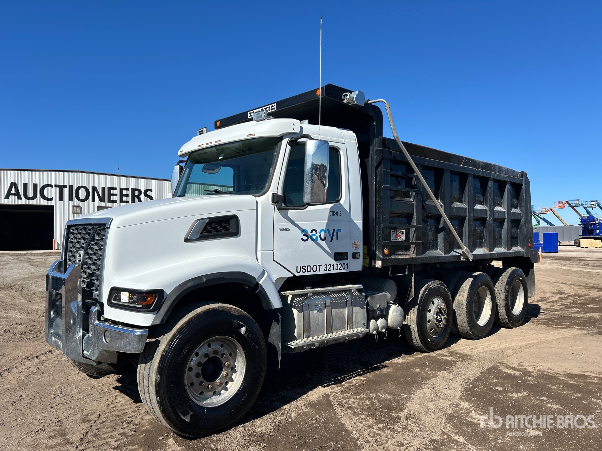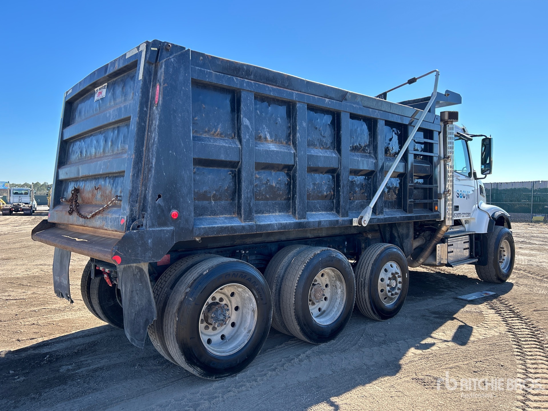 Situé sur la voie 62, emplacement 10, ce camion est équipé d'un moteur diesel Volvo D13 6 cylindres de 12,8 L développant 435 ch, conforme aux normes EPA américaines 2021 et CARB. Il nécessite l'utilisation d'un liquide d'échappement diesel (DES). Il affiche 5 764 heures de fonctionnement et dispose d'un frein moteur, d'une transmission automatisée Volvo ATO2612F à 12 rapports, d'un essieu avant de 9 072 kg (20 000 lb) et d'essieux arrière de 26 816 kg (59 000 lb). Il est équipé d'essieux moteurs Meritor RT-46-160, d'un rapport de pont de 3,73:1, d'un PTAC de 23 590 kg (52 000 lb), d'une cabine à suspension pneumatique, de jantes en aluminium, de pneus avant 425/65R22.5 et de pneus arrière 11R24.5. Il est équipé d'un essieu porteur pneumatique directionnel, de deux boîtiers de direction, d'une suspension à ressorts, d'un empattement de 5,73 m (226 po), d'une prise de force (PTO), d'une caisse en acier OX de 4,88 m (16 pi) de long x 1,52 m (5 pi) de haut et d'une bâche à enroulement électrique.