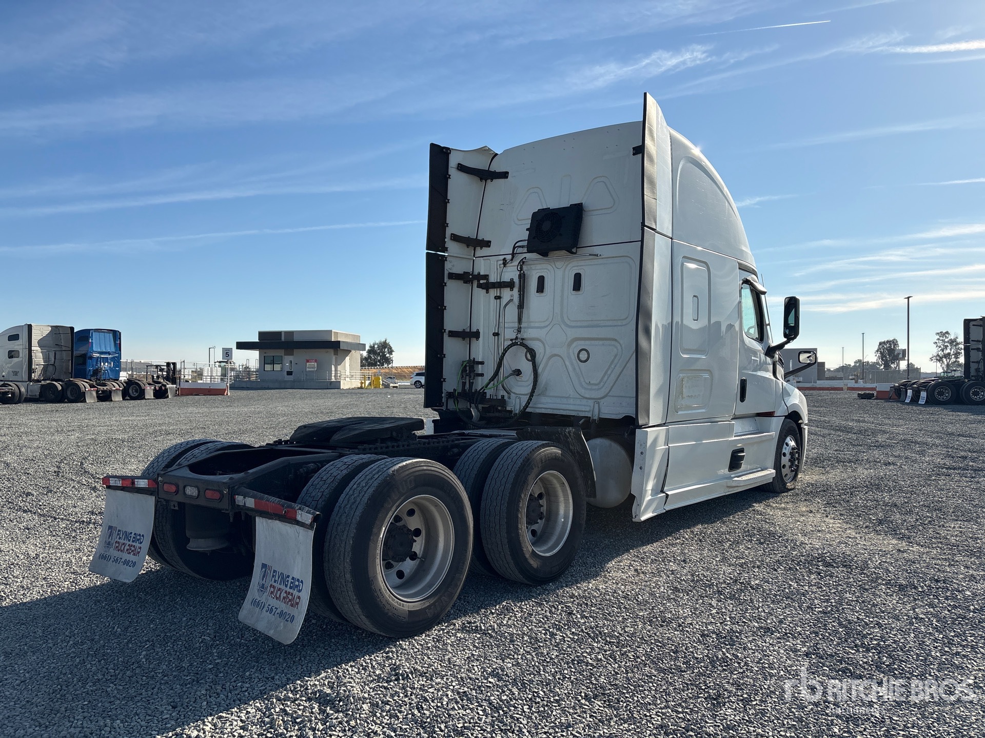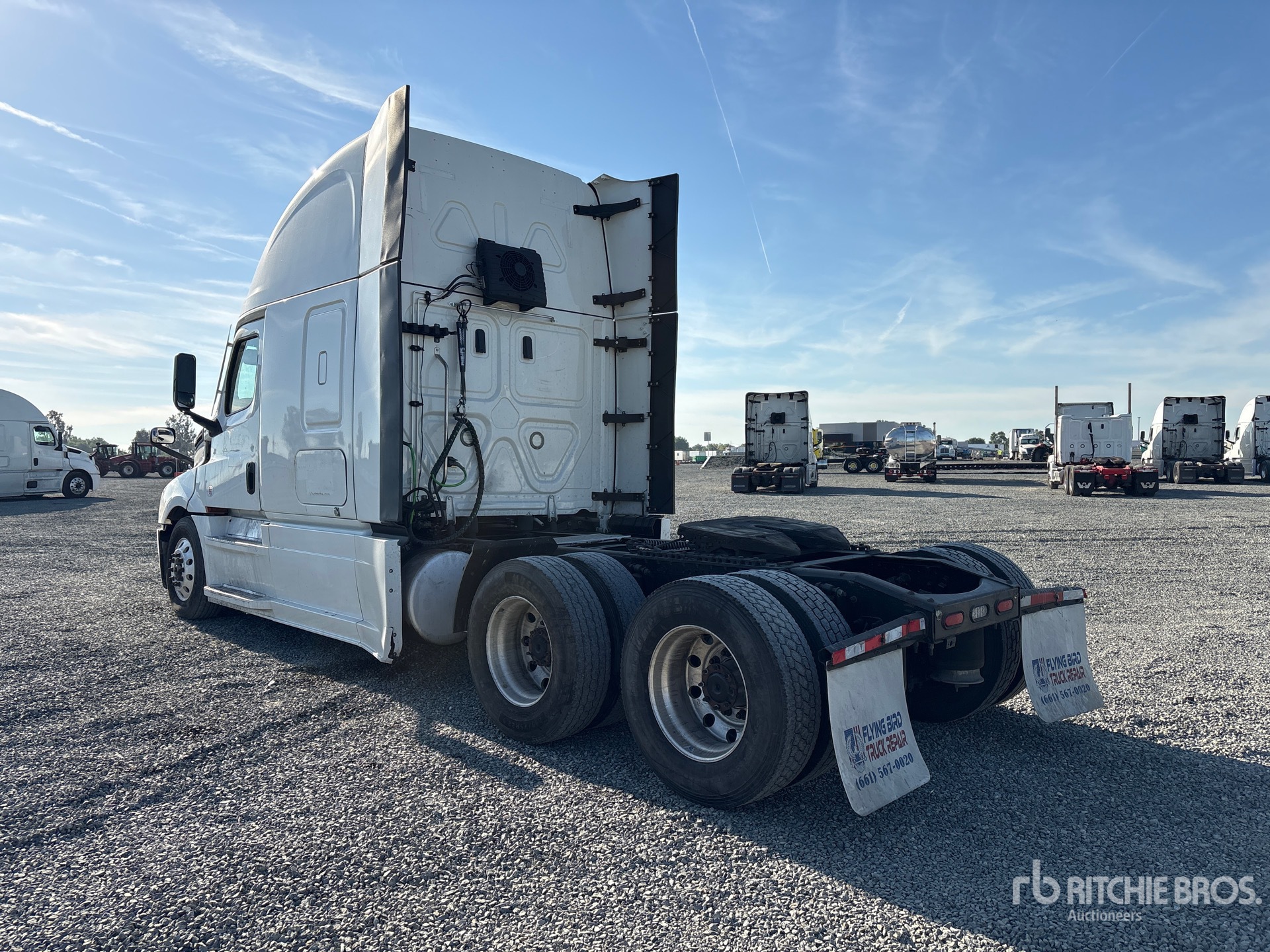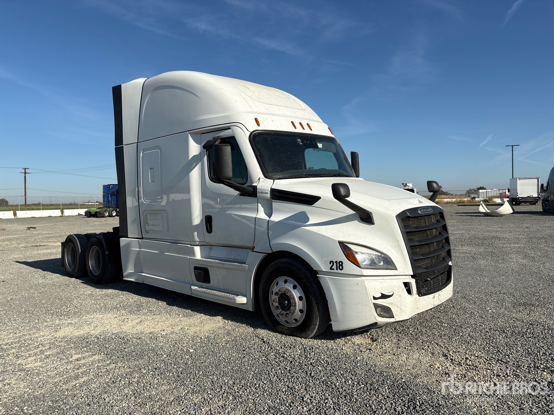Moteur Detroit DD15 de 455 ch, homologué EPA 2022, transmission automatisée Detroit DT12-1750-OHE à 12 rapports, essieu avant de 6 034 kg, essieu arrière de 18 144 kg, PTAC de 24 235 kg, frein moteur, cabine couchette surélevée de 1,78 m, lits superposés, chauffage de couchette, empattement de 5,97 m, suspension pneumatique, jantes en aluminium, pneus 295/75R22.5, sellette d'attelage coulissante pneumatique