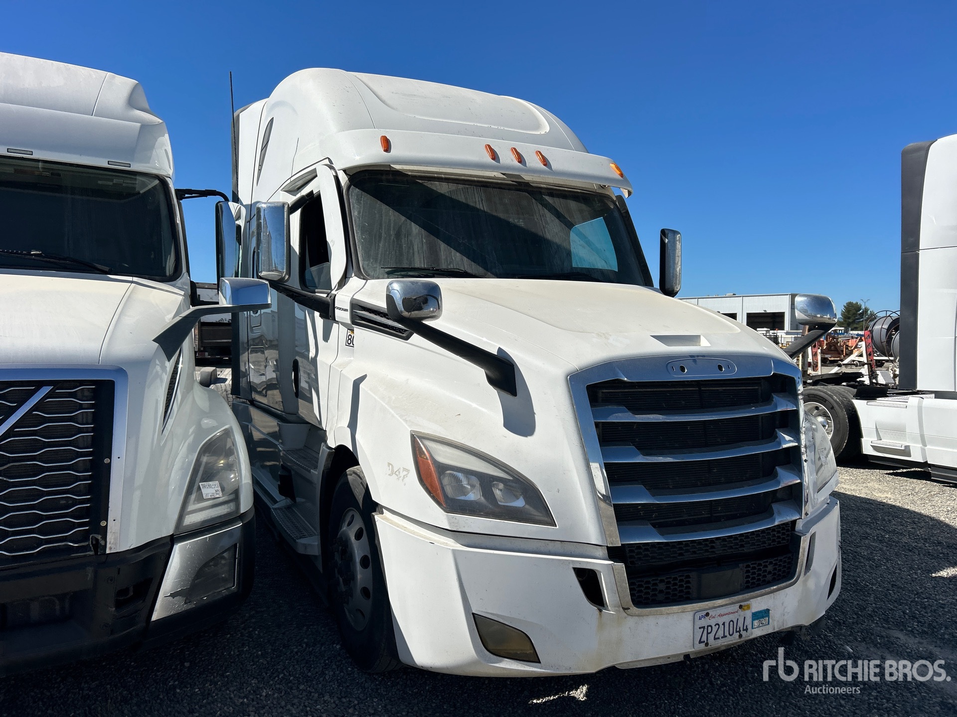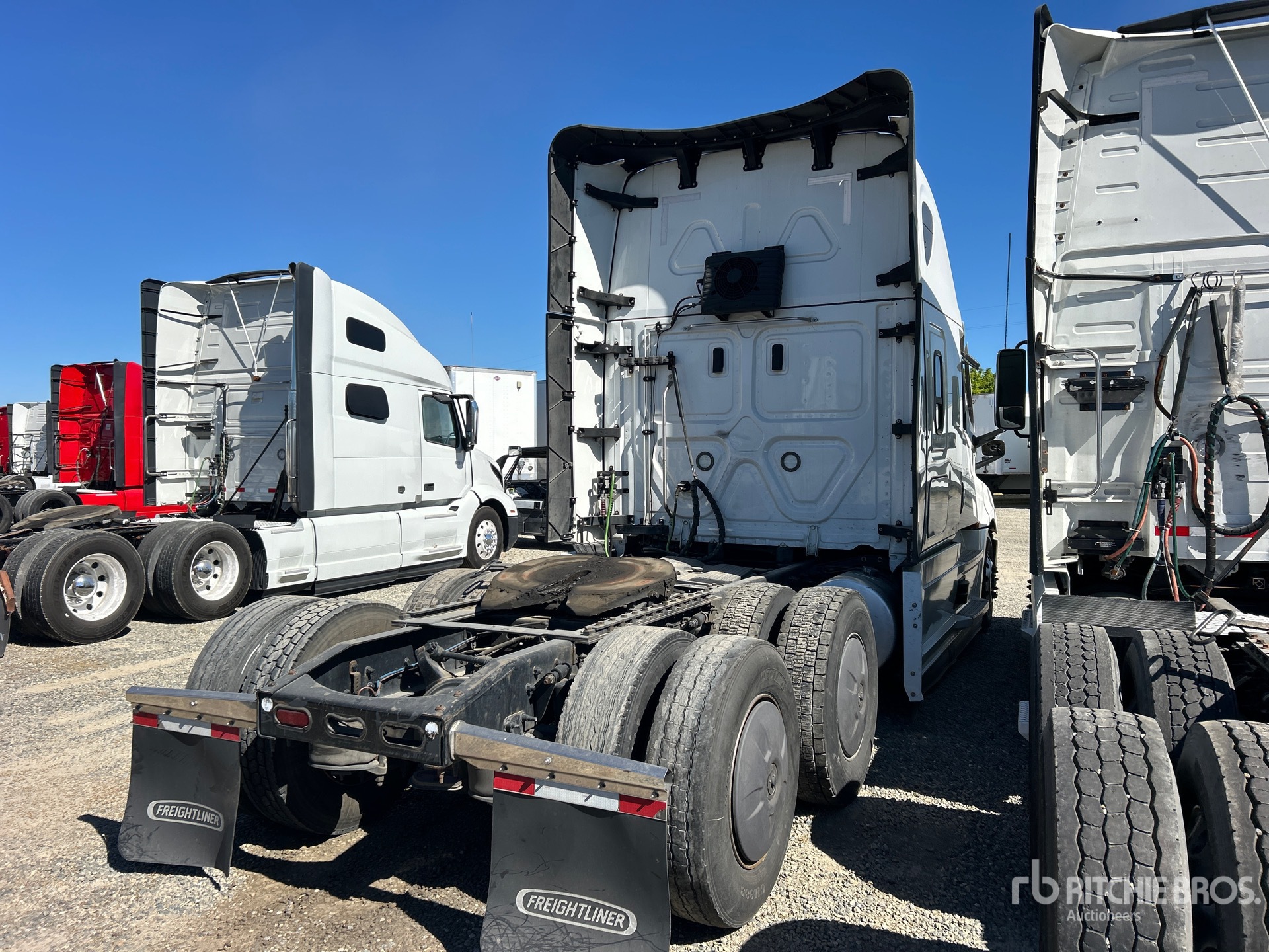 Moteur Detroit DD15 de 505 ch, transmission automatisée Detroit DT12-1650-OHE à 12 vitesses, essieu avant de 5670 kg, essieu arrière de 1814 kg, PTAC de 2383 kg, frein moteur, cabine couchette surélevée de 183 cm, lits superposés, empattement de 597 cm, suspension pneumatique, jantes extérieures en aluminium, pneus 295/75R22.5, sellette d'attelage coulissante pneumatique, deux réservoirs de carburant.