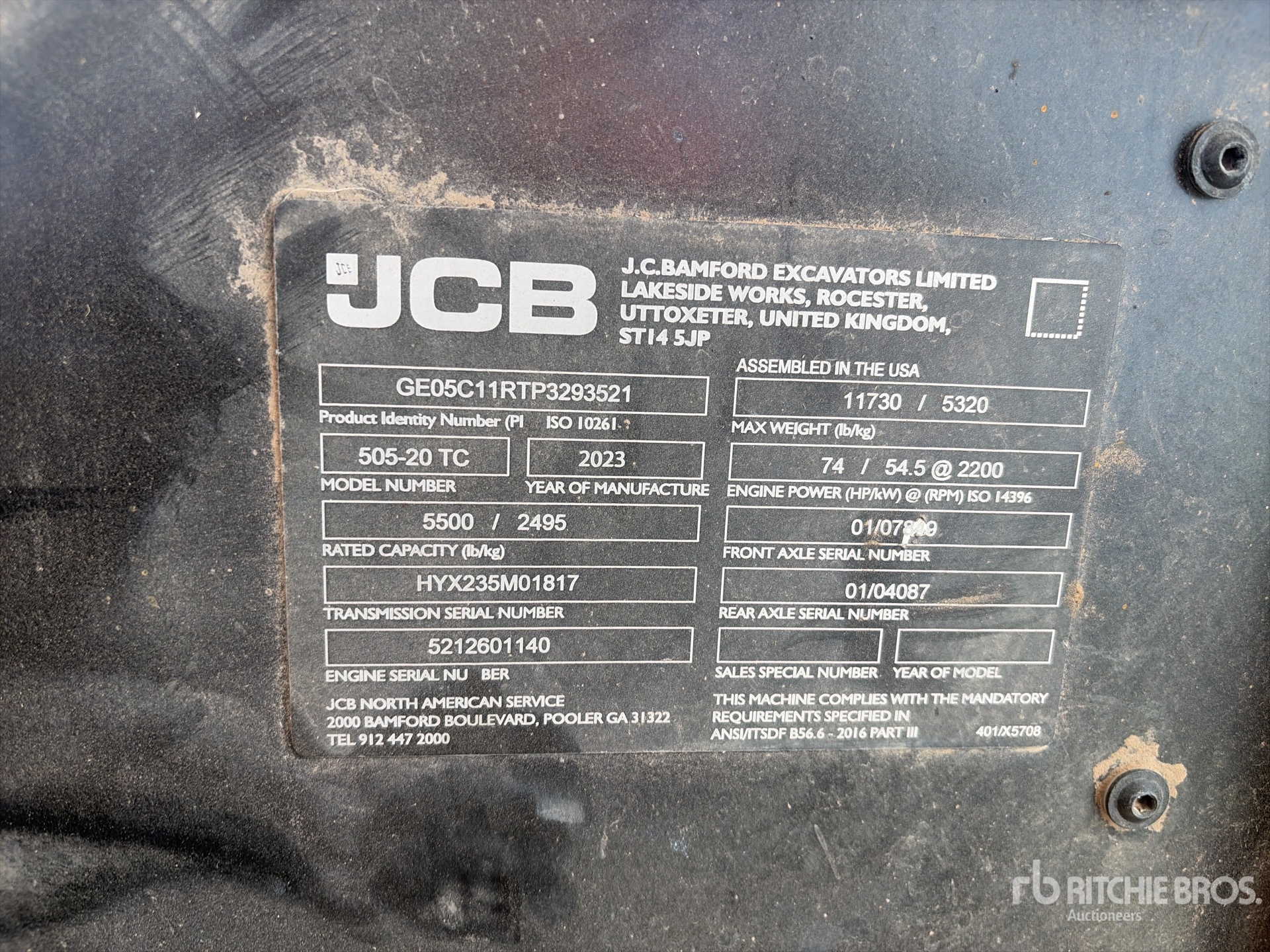 Cabine fermée, climatisation, hauteur de levage maximale de 6 m, capacité de levage maximale de 2500 kg, étiquette EPA américaine 2022, fourches de 122 cm, coupleur hydraulique, circuit hydraulique auxiliaire, pneus 33x12-20