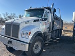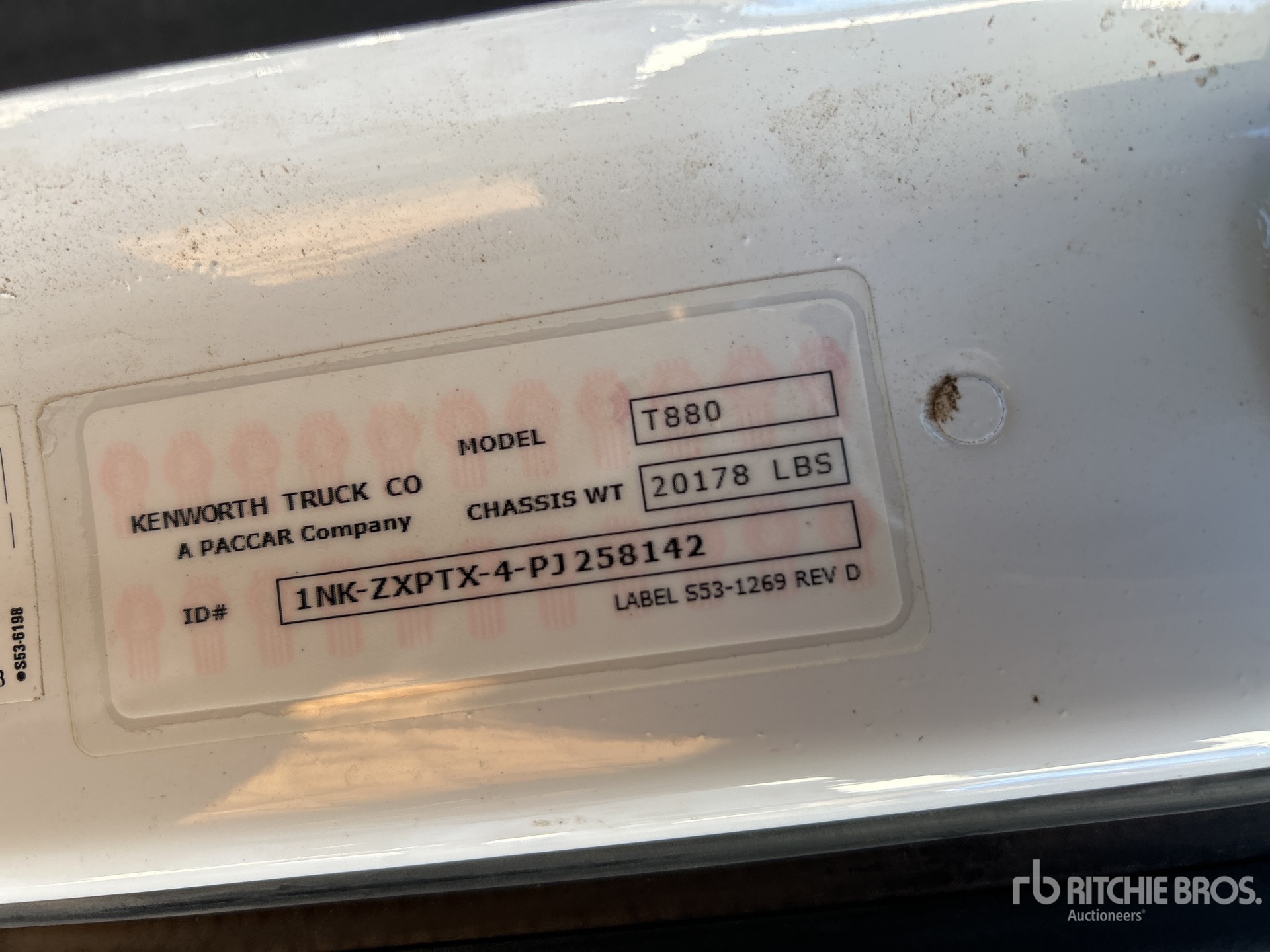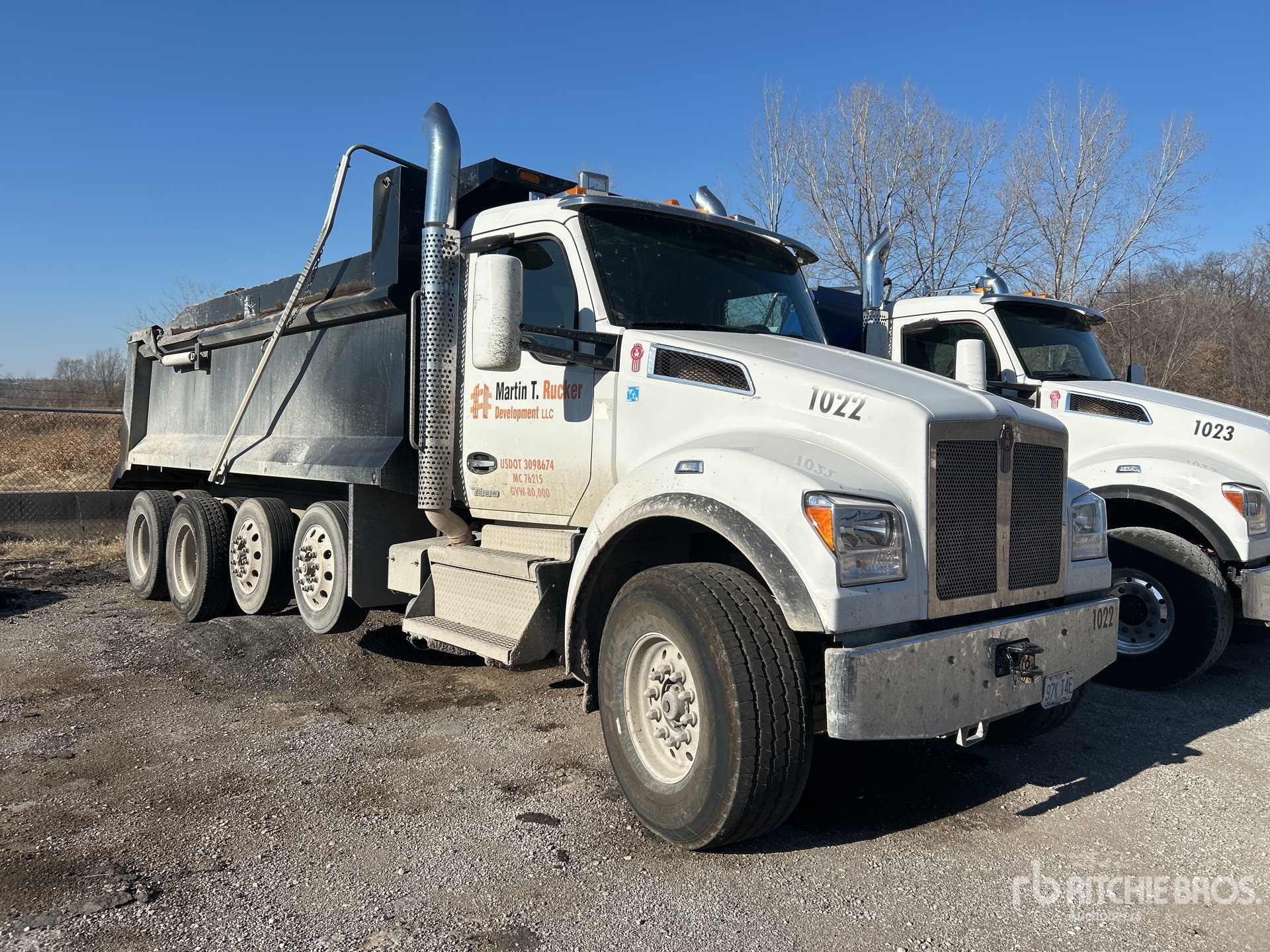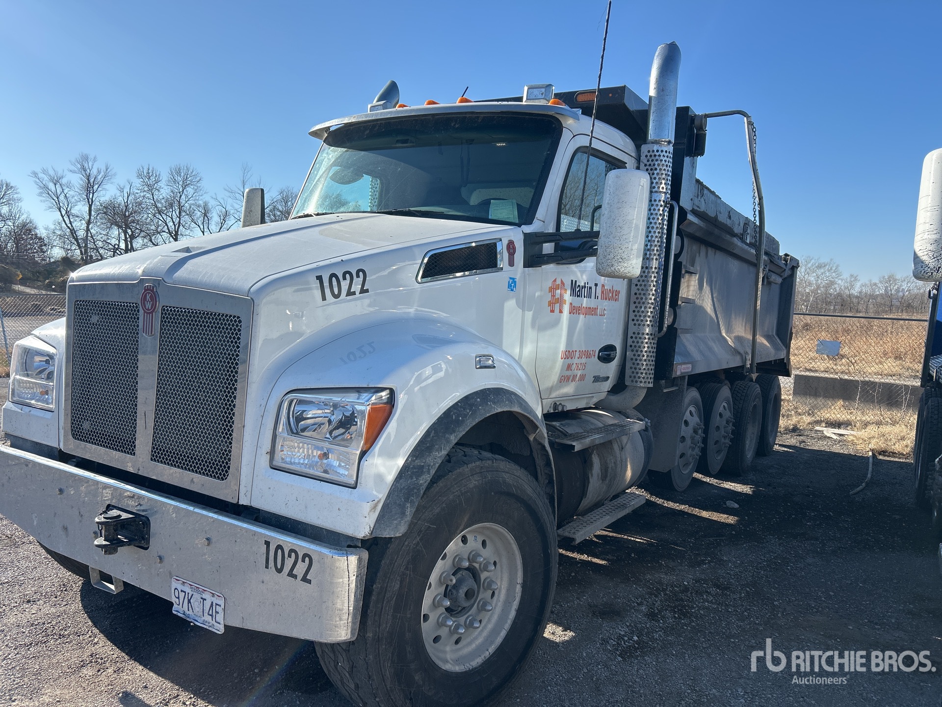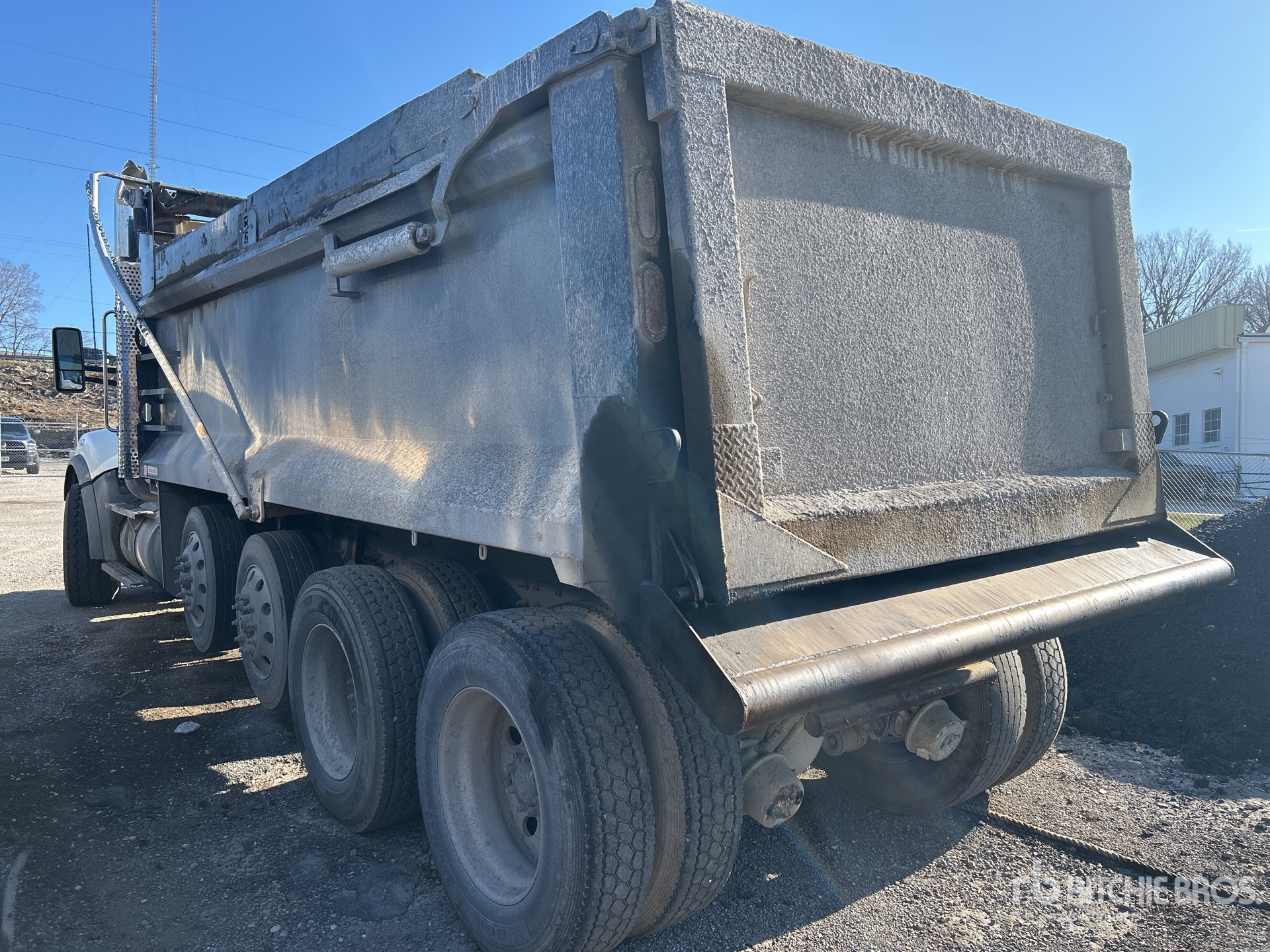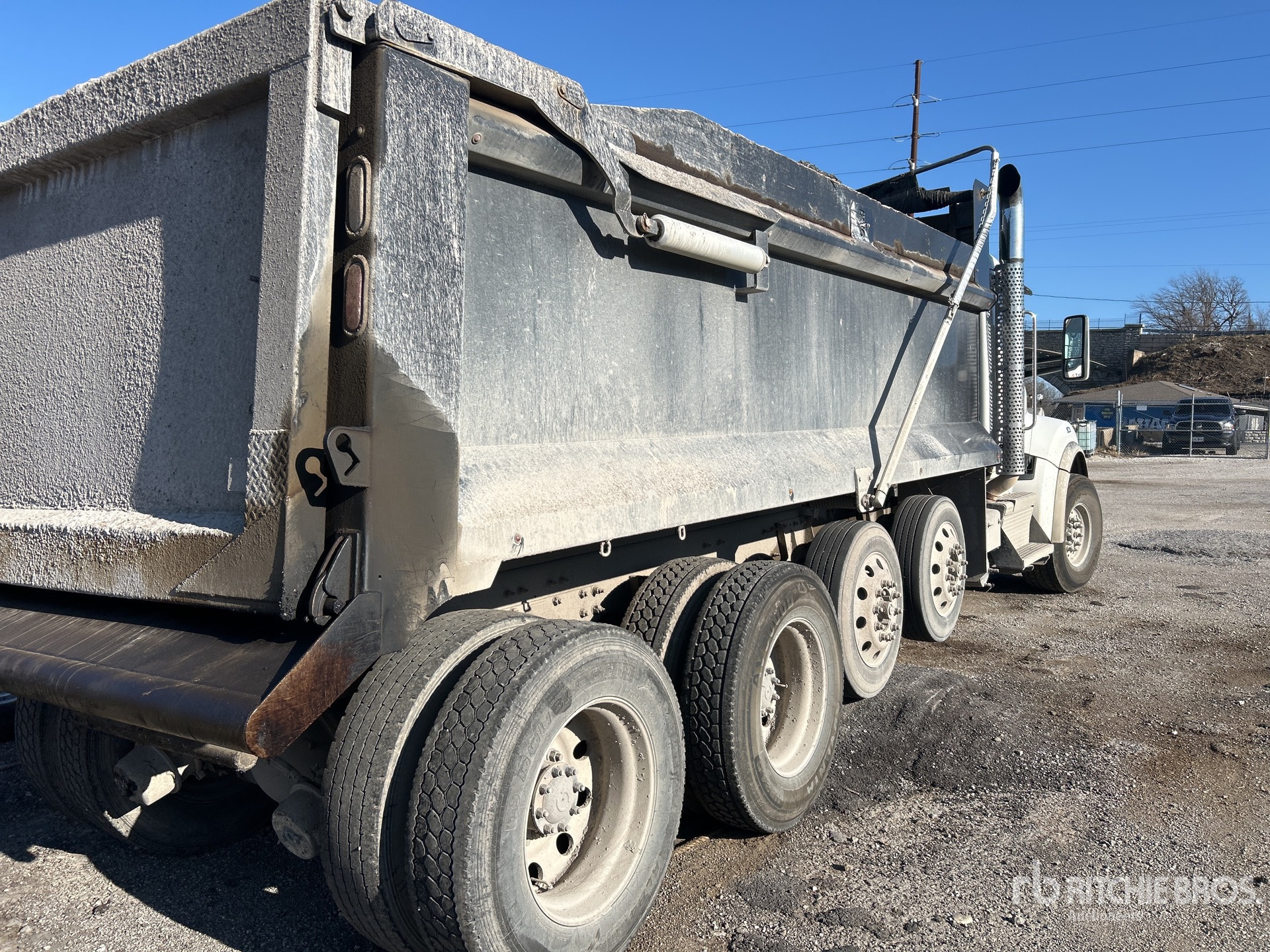 Camion Paccar MX-13, moteur diesel 6 cylindres 12,9 L de 405 ch, transmission automatique Allison, double blocage de différentiel, cabine à suspension pneumatique, jantes en aluminium, 2 essieux porteurs à suspension pneumatique, châssis double, suspension avant assistée par air, benne en acier de 6,7 m de long, capacité de 25 m³, bâche à enroulement électrique, hayon élévateur