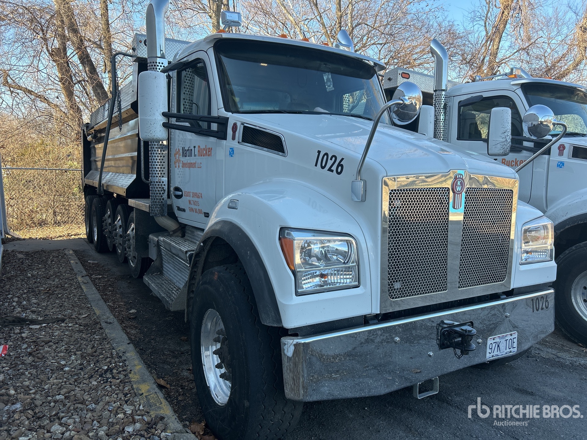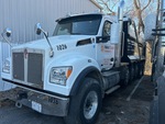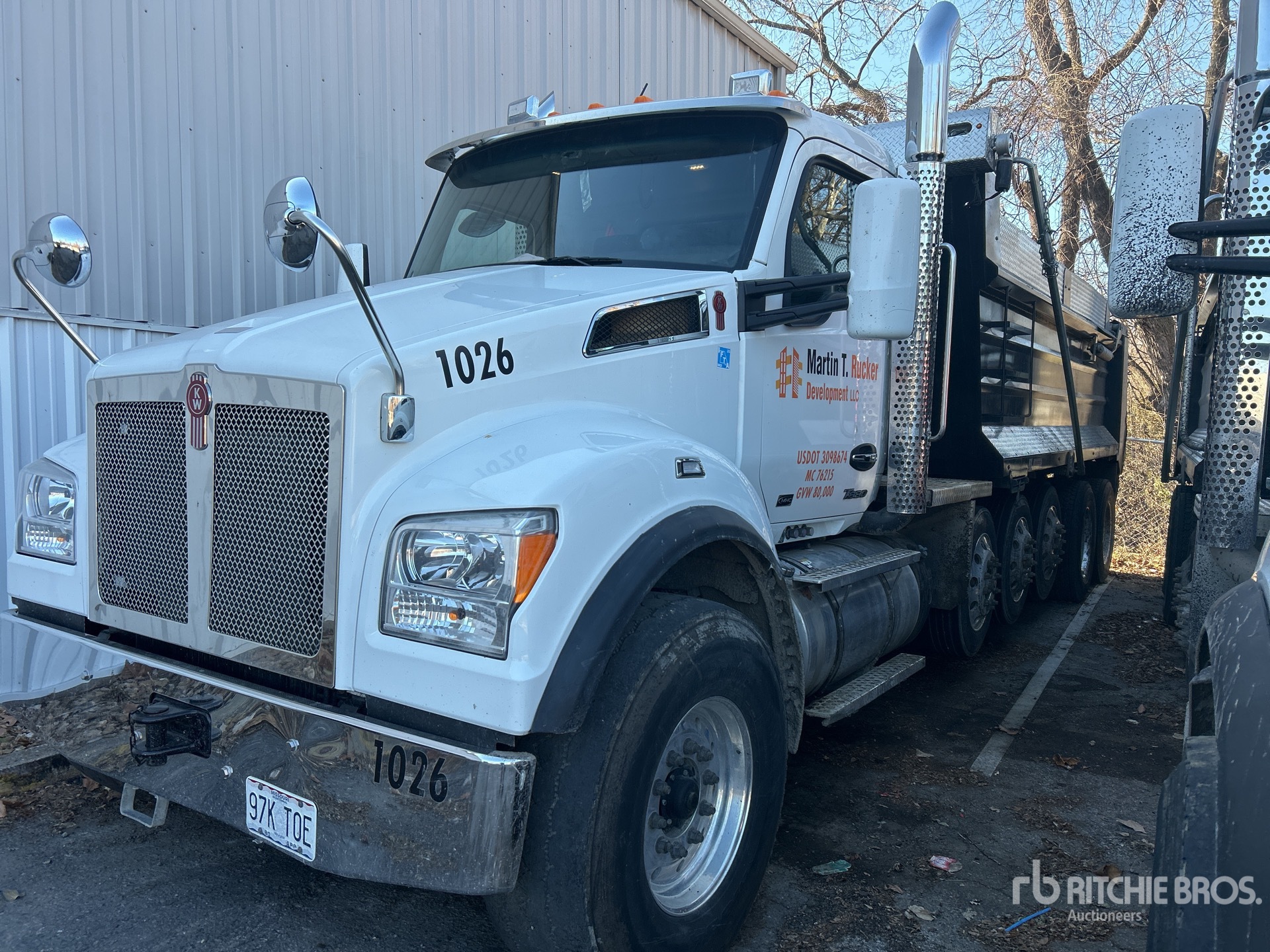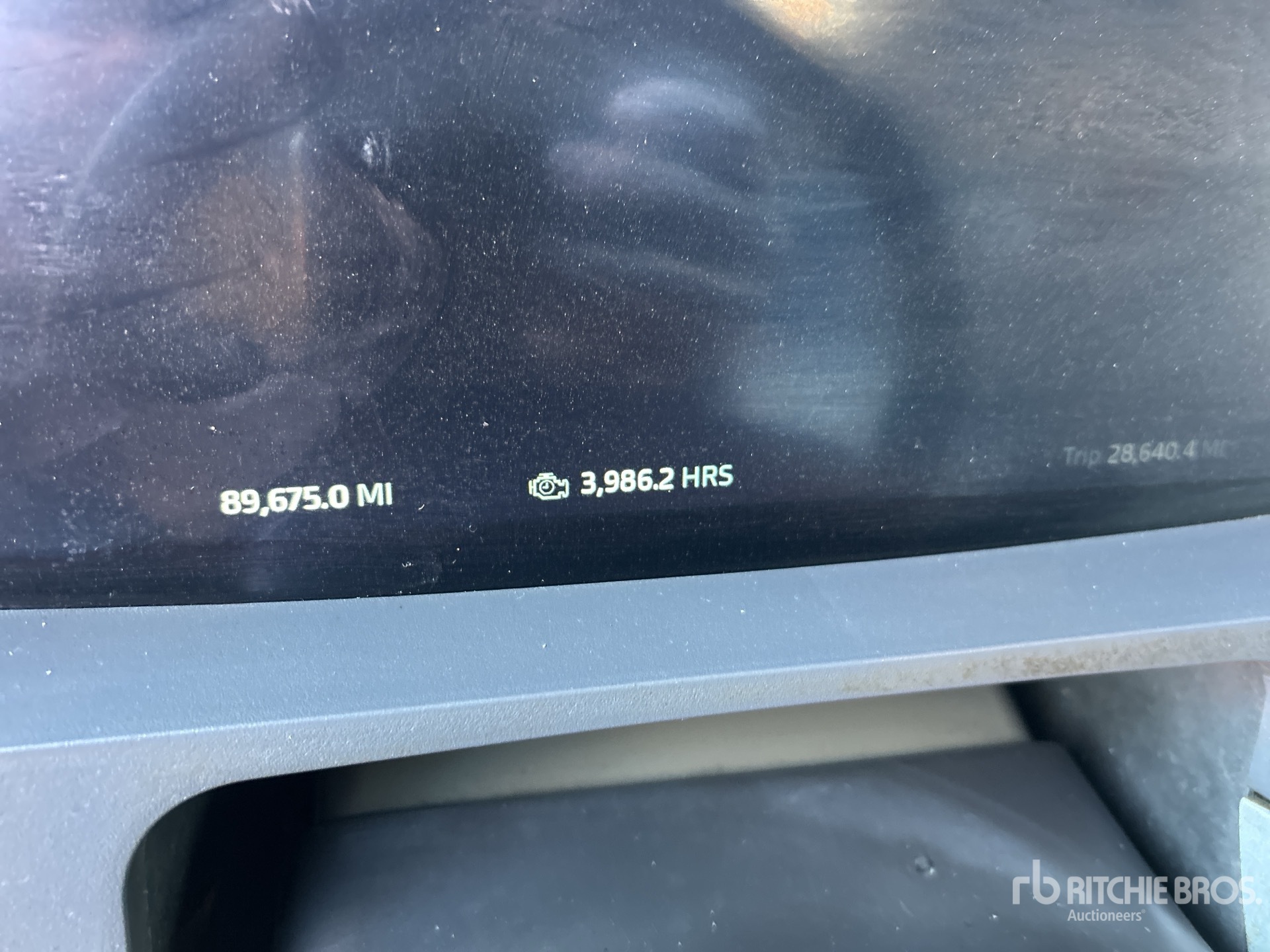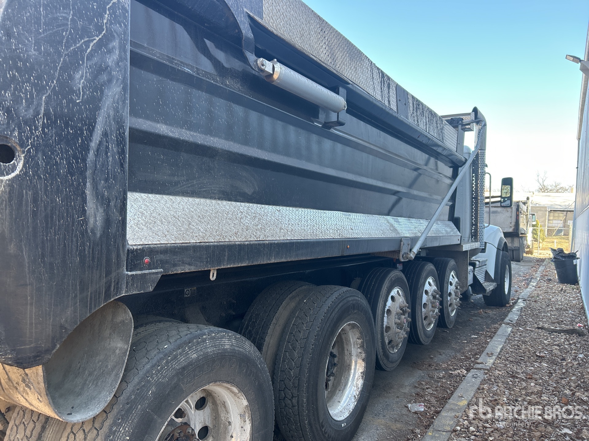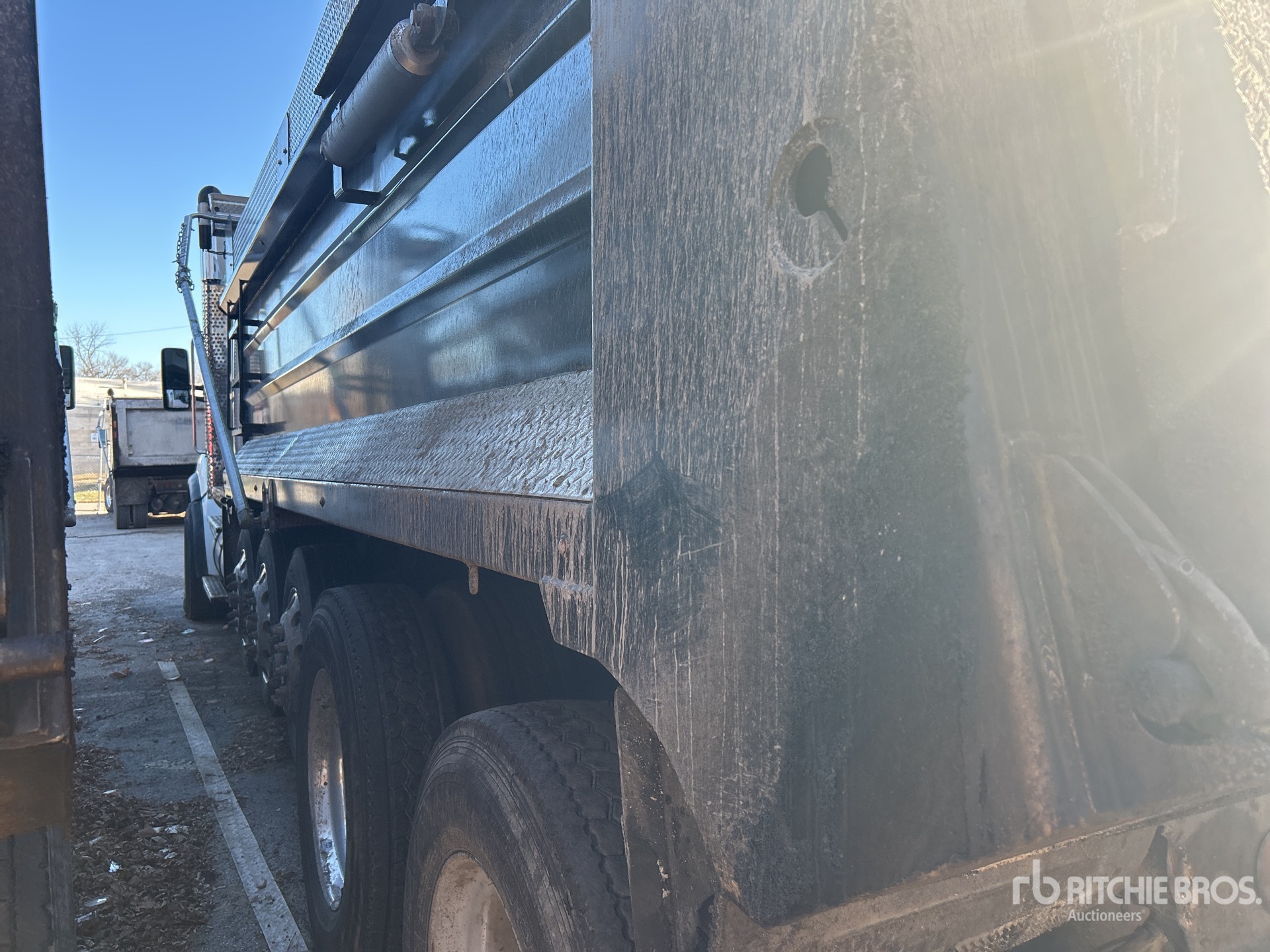 Camion Paccar MX-13, moteur diesel 6 cylindres 12,9 L de 405 ch, transmission automatique Allison, double blocage de différentiel, jantes en aluminium, 3 essieux porteurs à suspension pneumatique, châssis double, suspension avant assistée par air, caisse en acier de 7,9 m de long, capacité de 27 m³, bâche à enroulement électrique, hayon élévateur