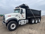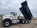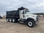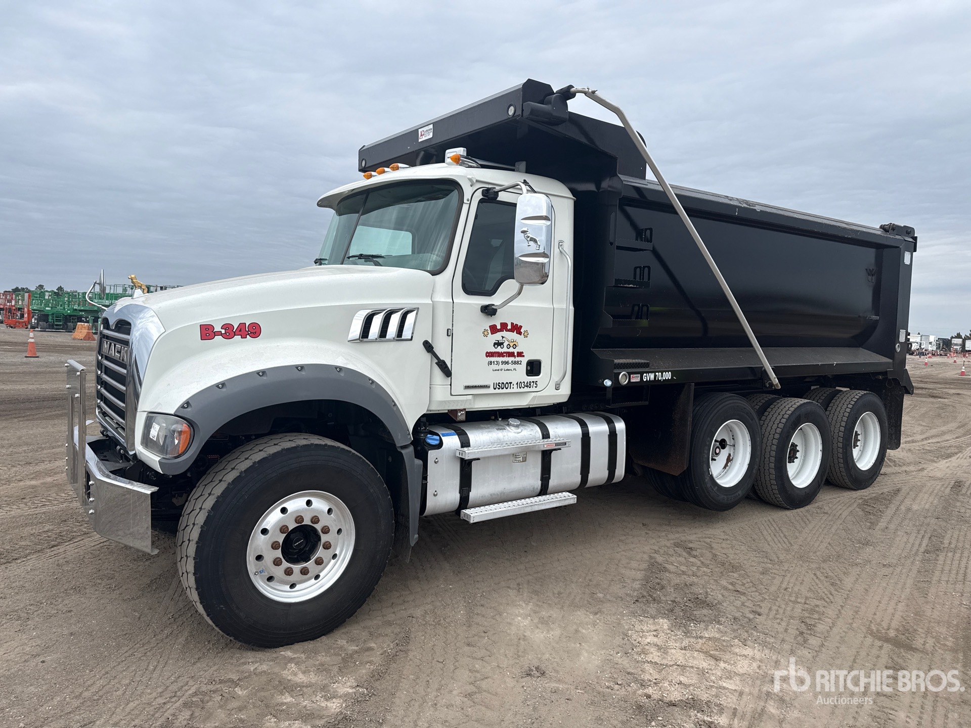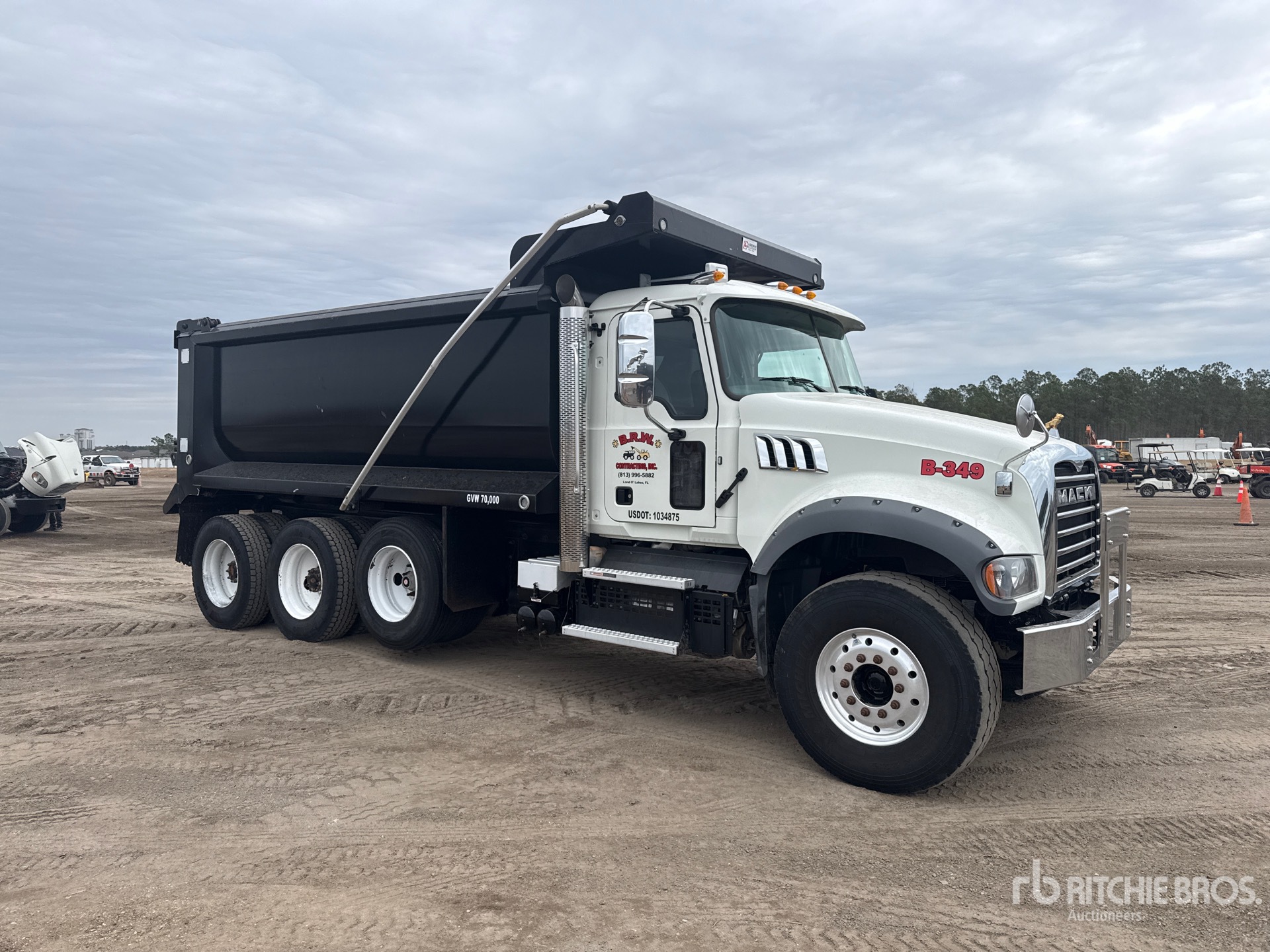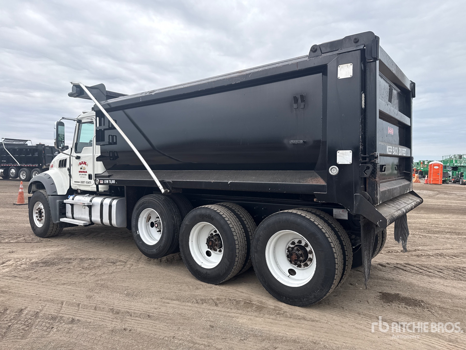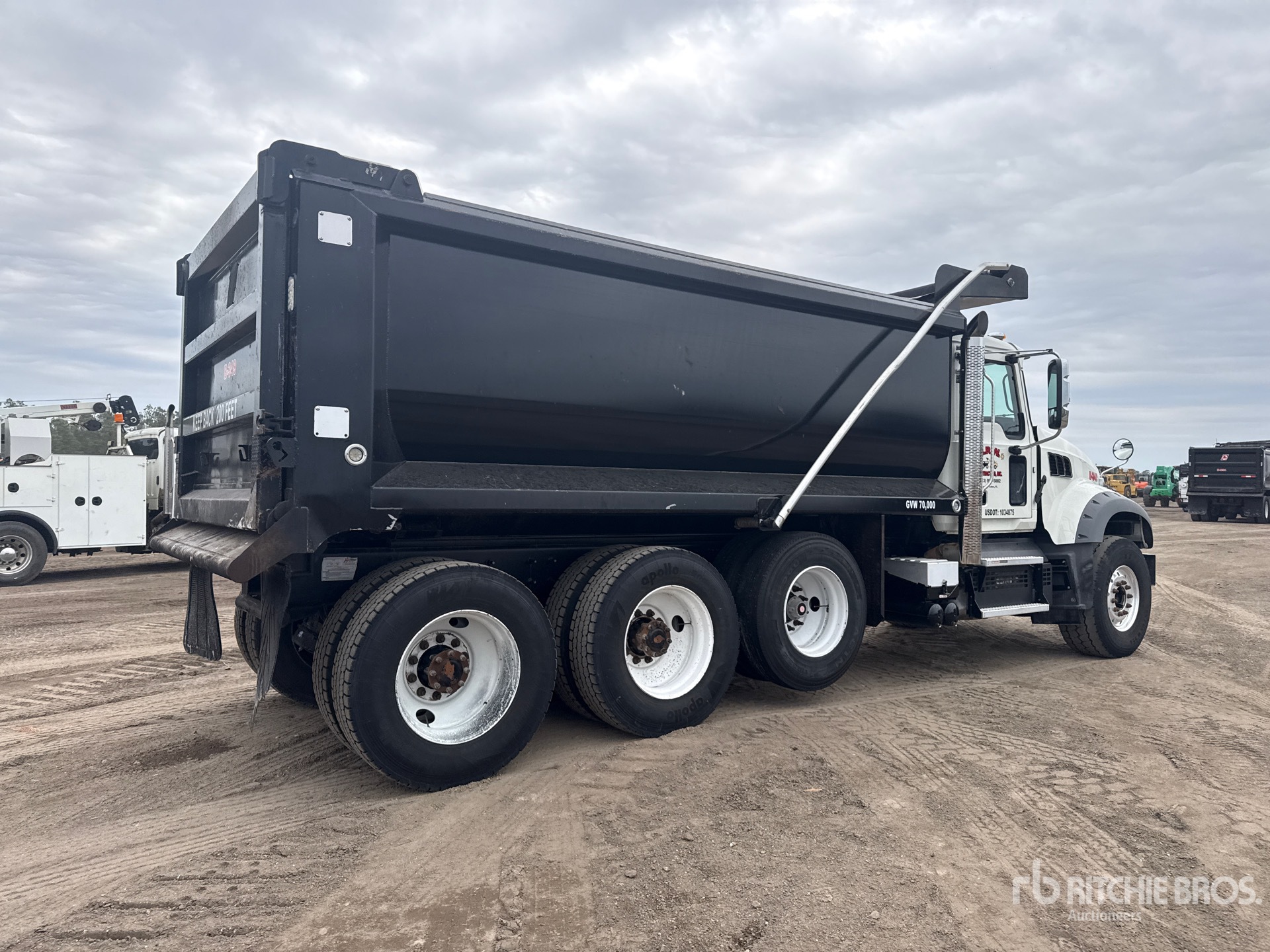 Moteur diesel Mack MP8 12,7 L 455 ch, homologué EPA 2022, 7 321,7 heures de fonctionnement, frein moteur, transmission automatisée Mack mDrive, essieu avant de 9 072 kg, essieux arrière de 29 037 kg, PTAC de 38 116 kg, cabine à suspension pneumatique, roues avant en aluminium, pneus avant 425/65R22.5, pneus arrière 11R24.5, essieu porteur pneumatique directionnel, double direction, suspension à ressorts sur balancier, empattement de 5,73 m, prise de force, benne en acier Logan de 4,88 m de long x 1,37 m de haut, fond arrondi, bâche à enroulement électrique