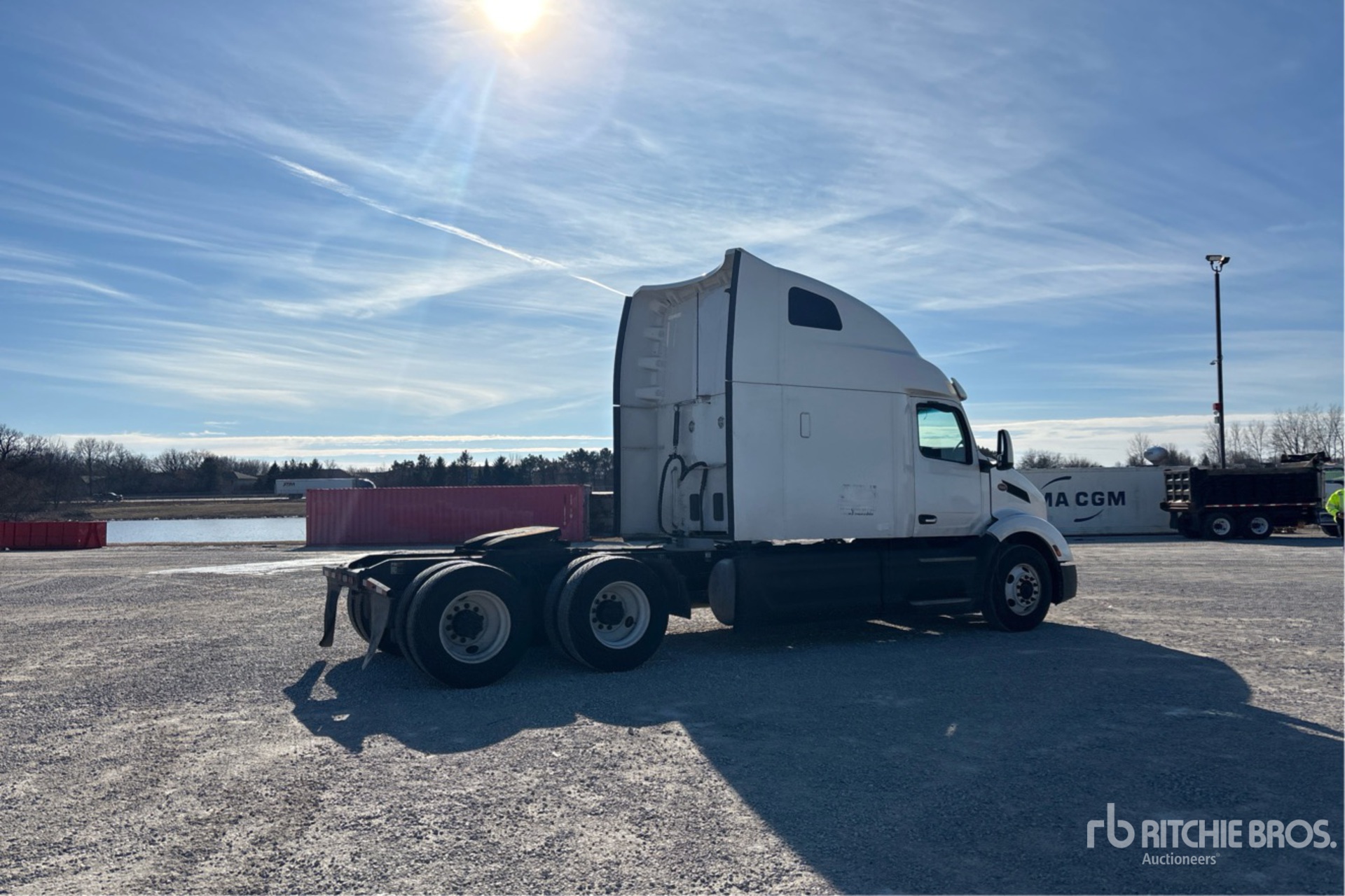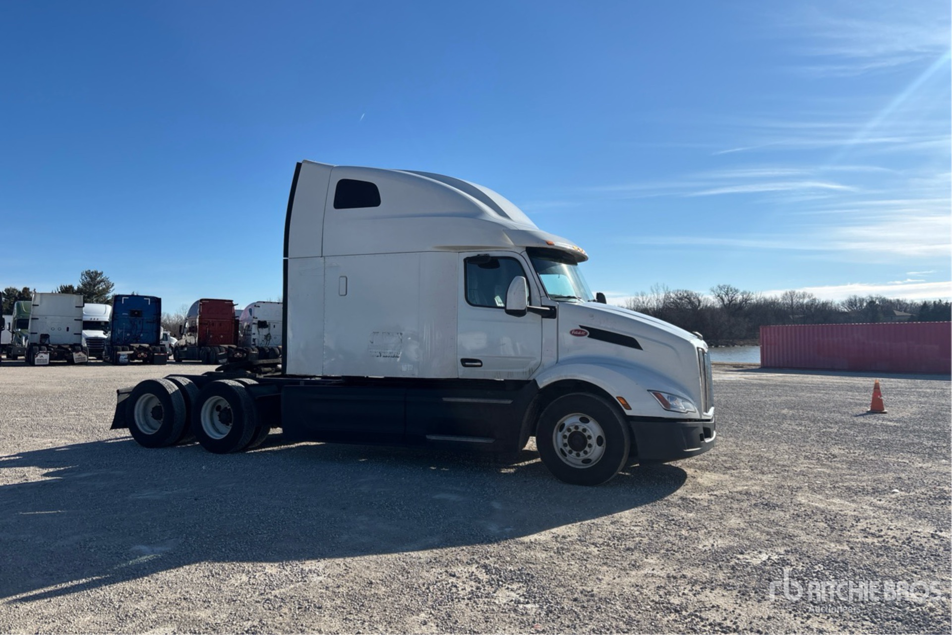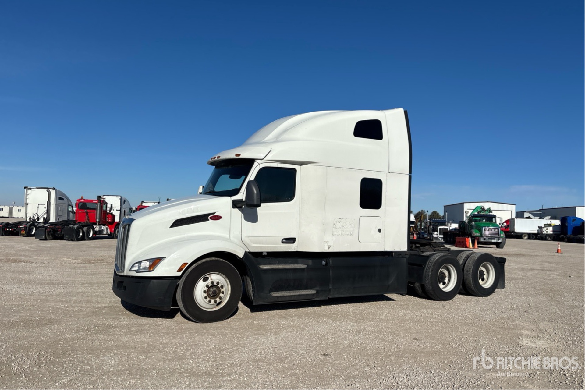 Moteur Paccar MX-13 de 456 ch, homologué EPA 2022, 12 953,5 heures de fonctionnement, transmission automatisée, essieu avant de 5 443 kg, essieu arrière de 18 144 kg, PTAC de 23 590 kg, frein moteur, cabine couchette surélevée de 183 cm, lits superposés, empattement de 592 cm, suspension pneumatique, pneus 295/75R22.5, attelage coulissant pneumatique, double réservoir de carburant