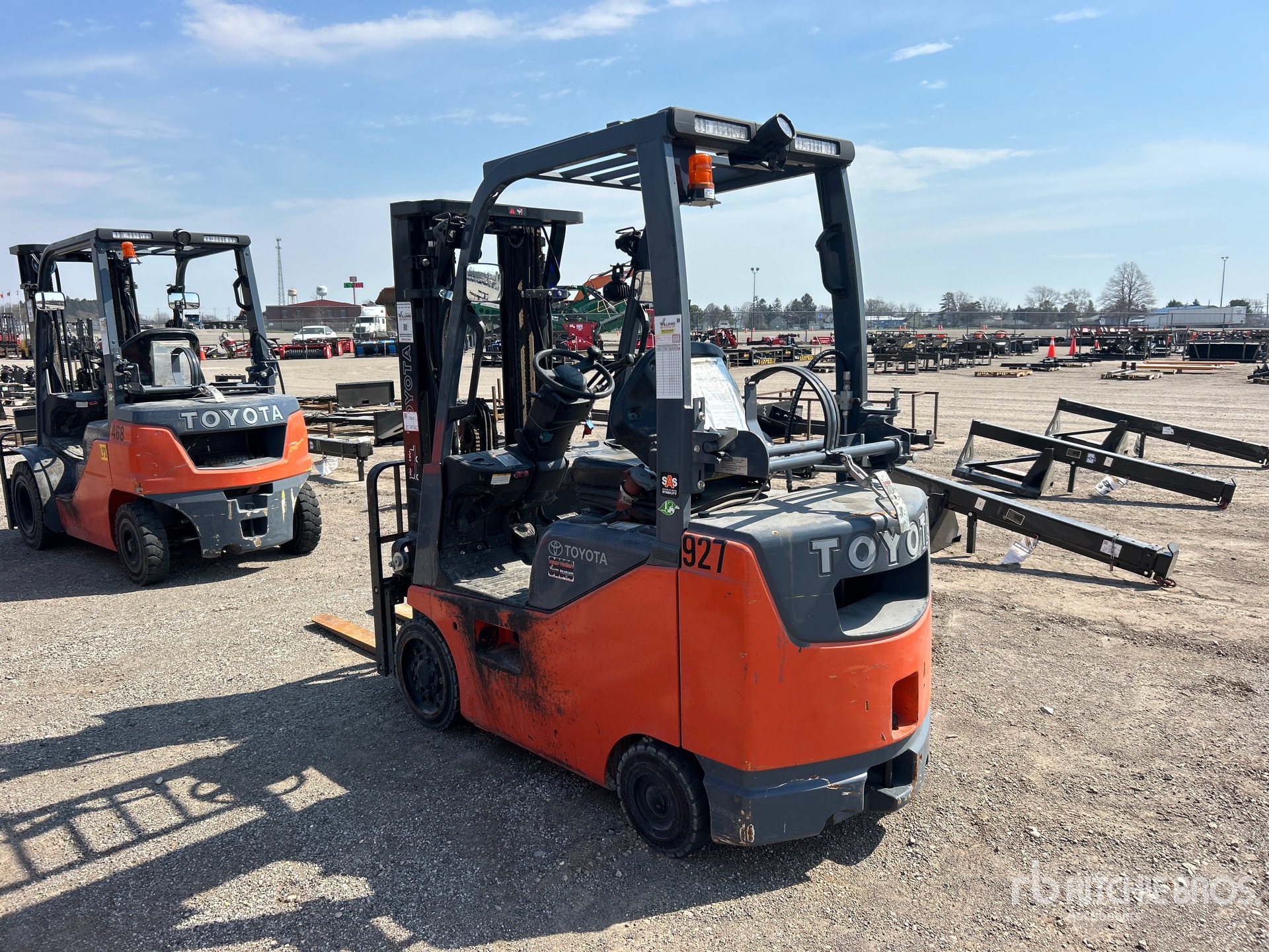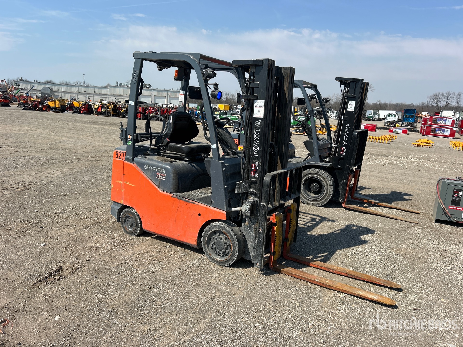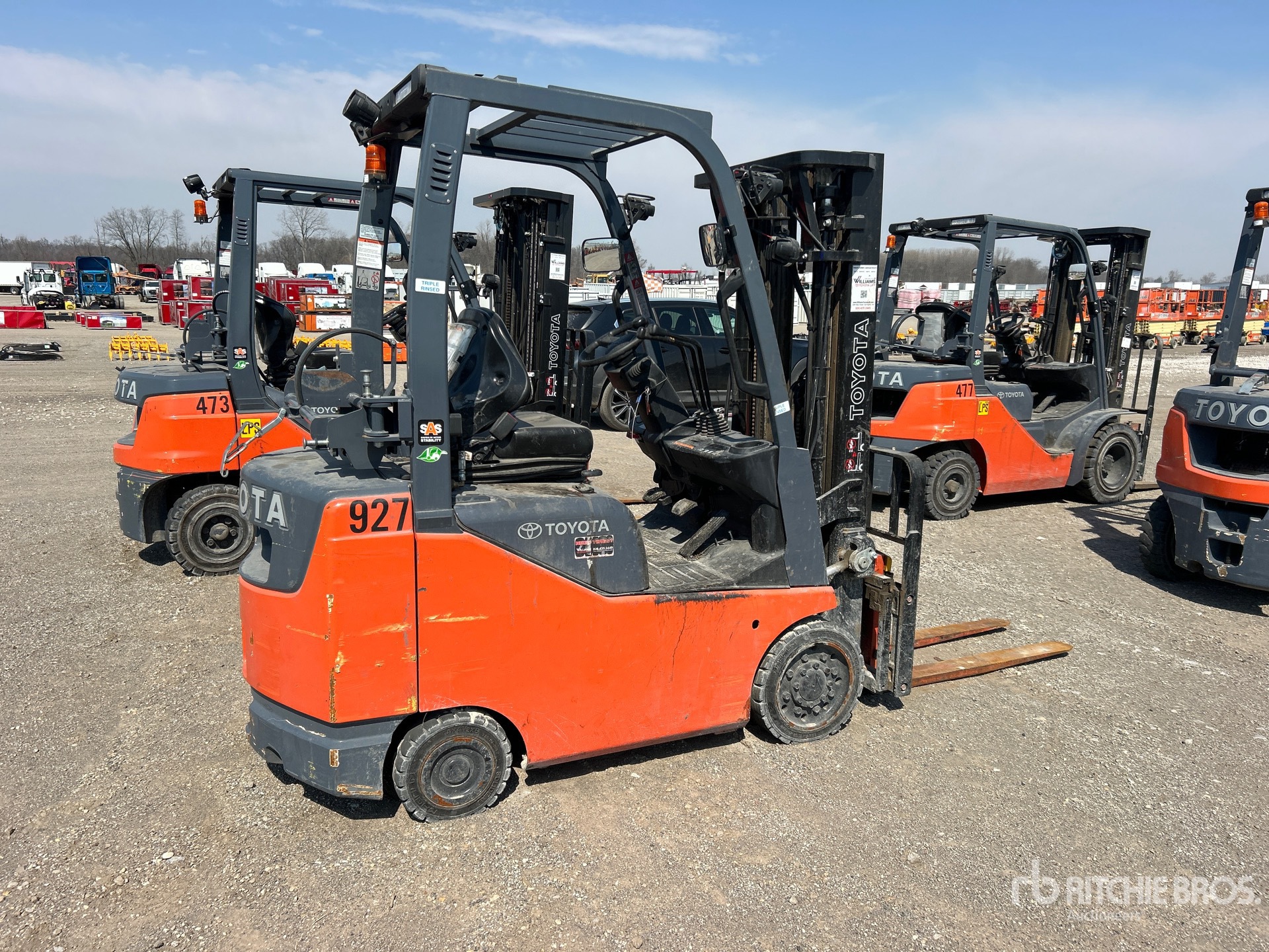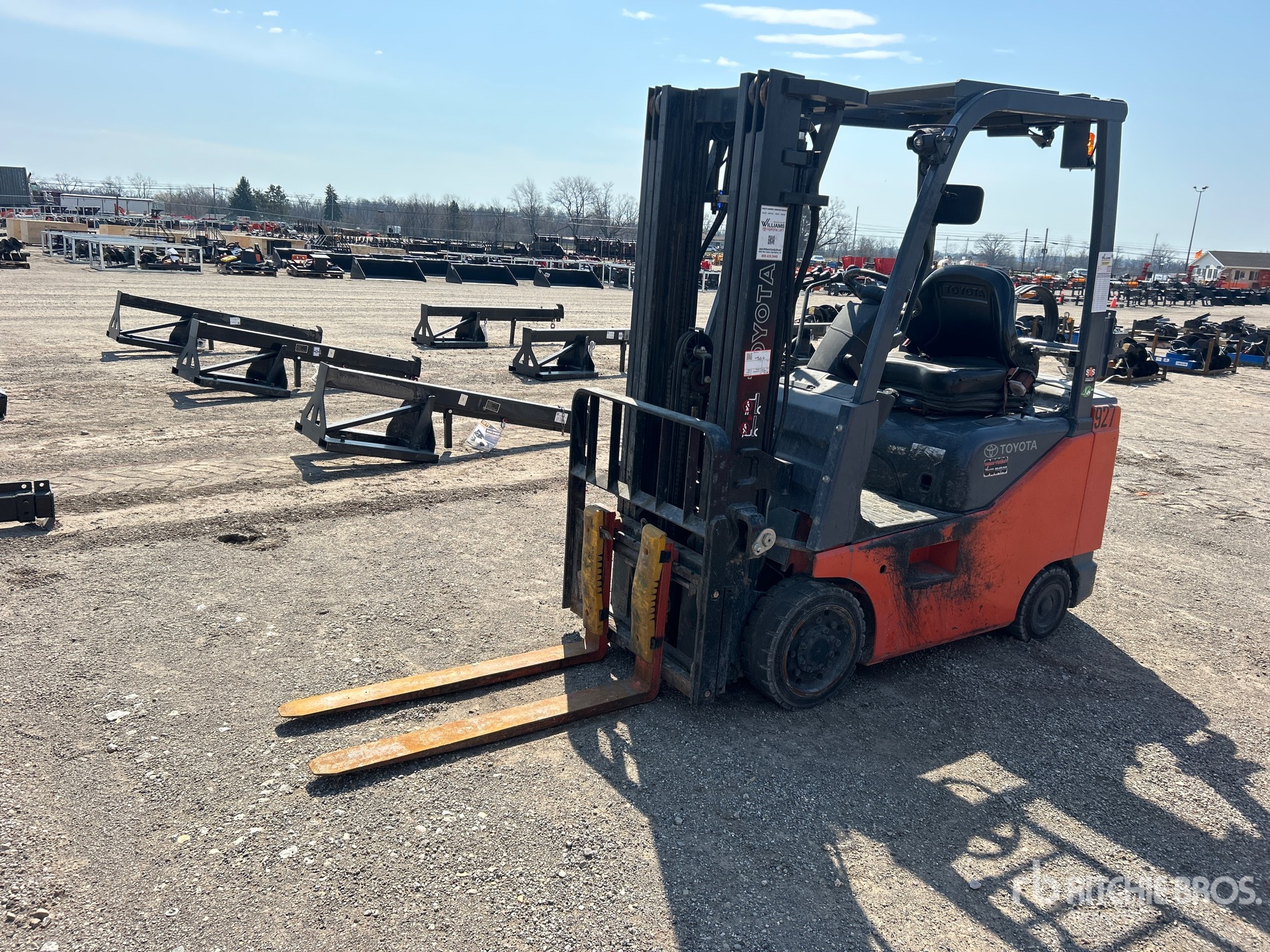 Mât à 3 sections, hauteur de levage maximale de 4,32 m (170 po), hauteur de mât abaissée de 2,08 m (82 po), fourches de 1,07 m (42 po), déplacement latéral, homologation EPA américaine 2023, moteur Toyota 4 cylindres 2,2 L GPL