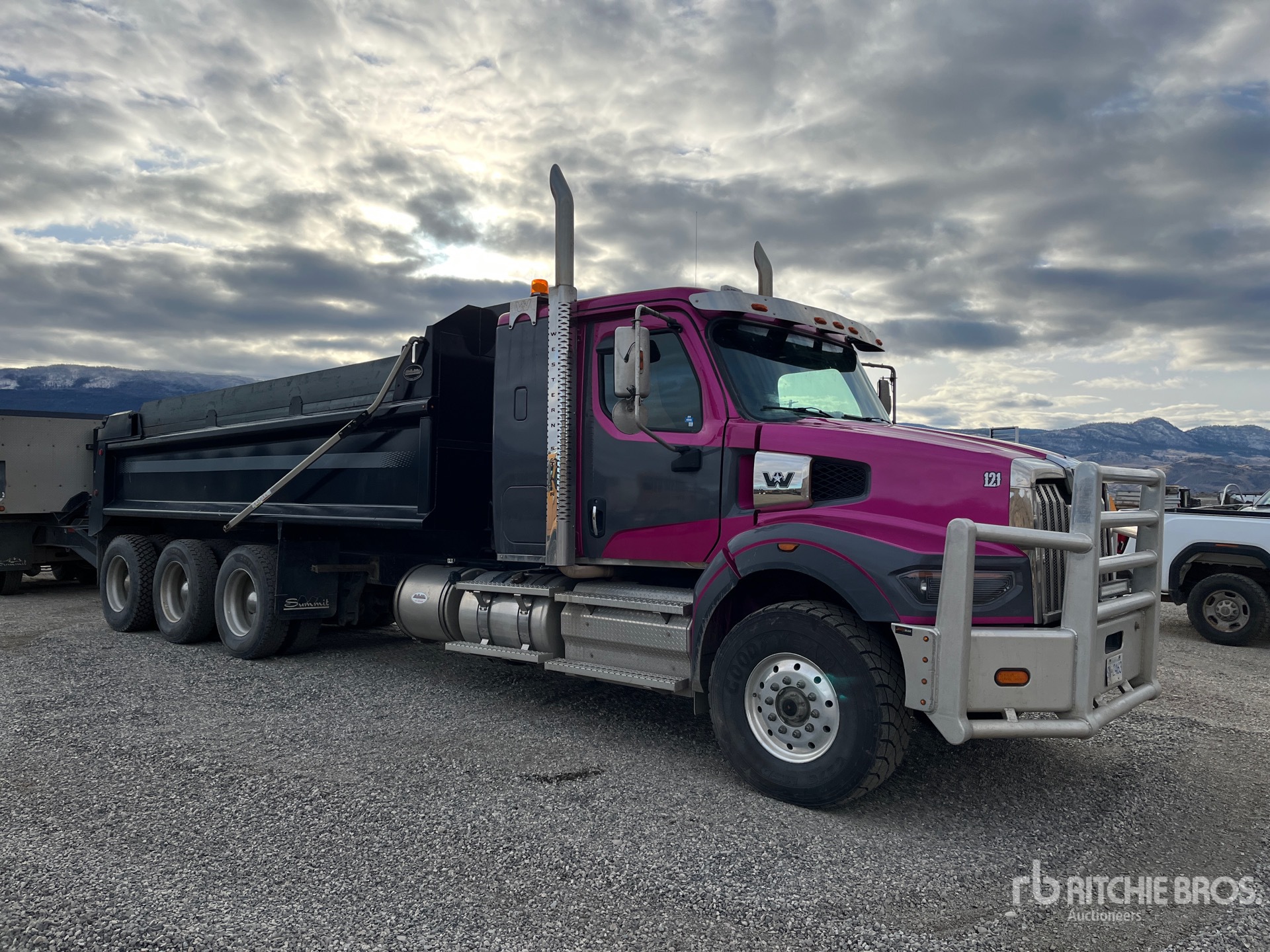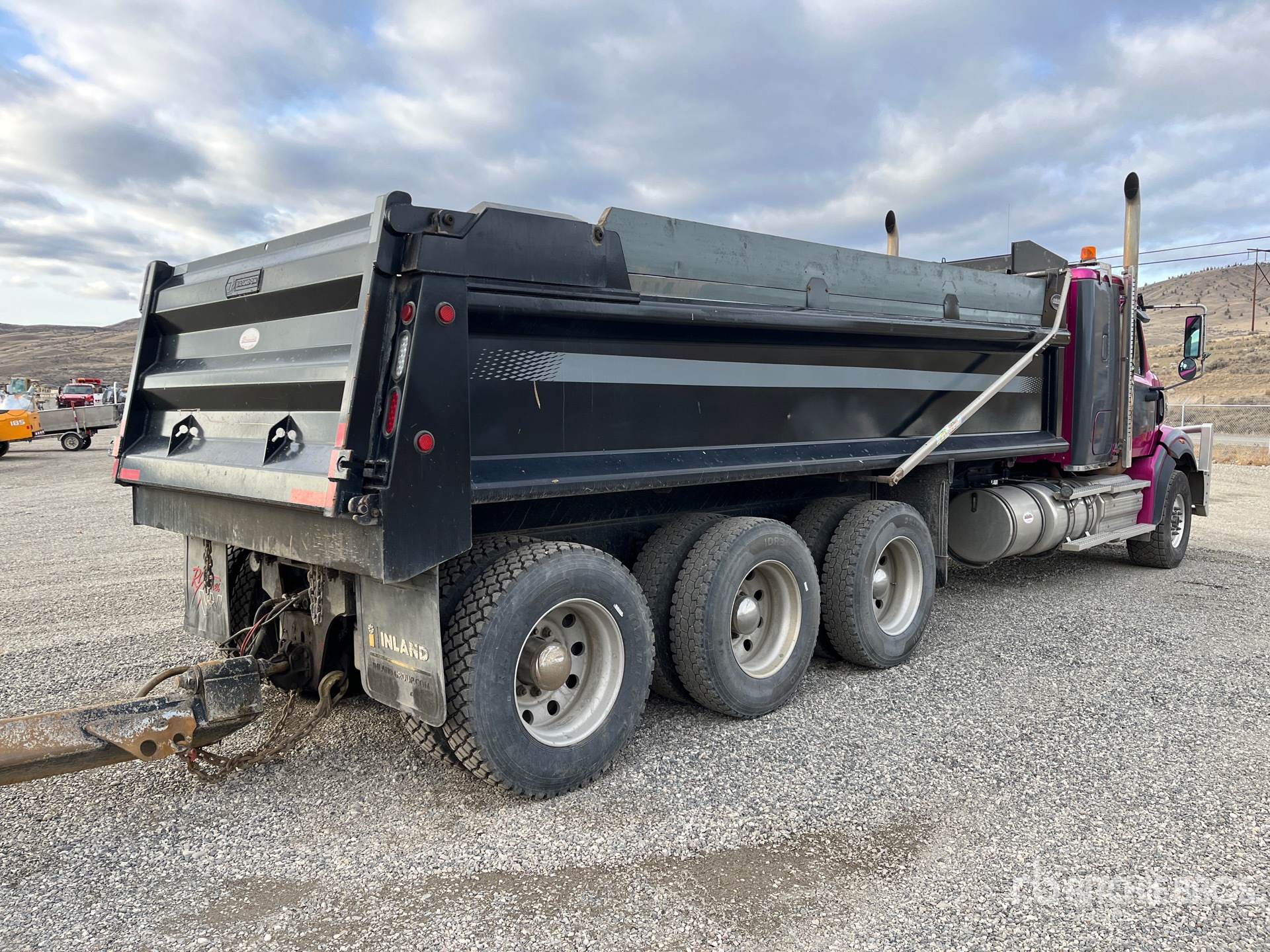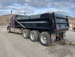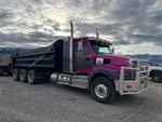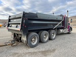 Ralentisseur, transmission manuelle Eaton Fuller à 18 vitesses, triple blocage de différentiel, essieu avant de 9 072 kg, essieu arrière de 27 768 kg, PTAC de 36 737 kg, cabine à suspension pneumatique, cabine couchette à toit plat de 86 cm, jantes en aluminium, pneus avant 425/65R22.5, pneus arrière 11R24.5, châssis double, suspension pneumatique, empattement de 747 cm, prise de force, caisse en acier de 11,6 m de long x 11,6 m de hauteur, bâche à enroulement pneumatique, hayon élévateur