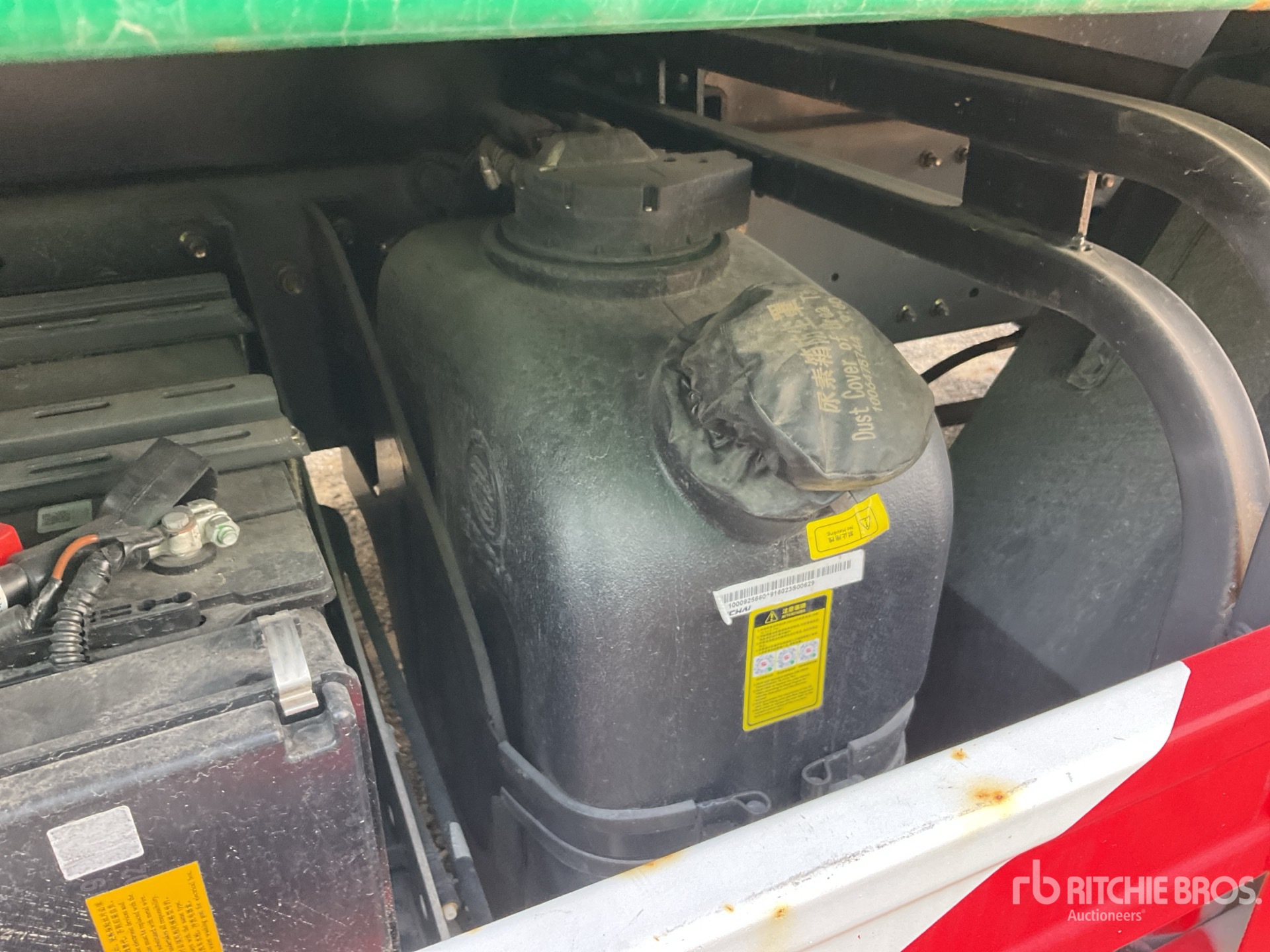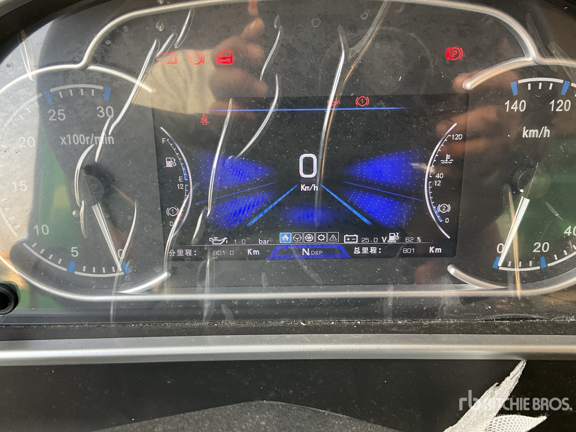 Moteur diesel 6 cylindres, nécessite AdBlue, frein moteur, boîte de vitesses manuelle à 10 rapports, double blocage de différentiel, pneus avant 11.00R20, pneus arrière 11.00R20, suspension à ressorts, prise de force, benne de 5700 mm de long x 1200 mm de haut, bâche à enroulement électrique