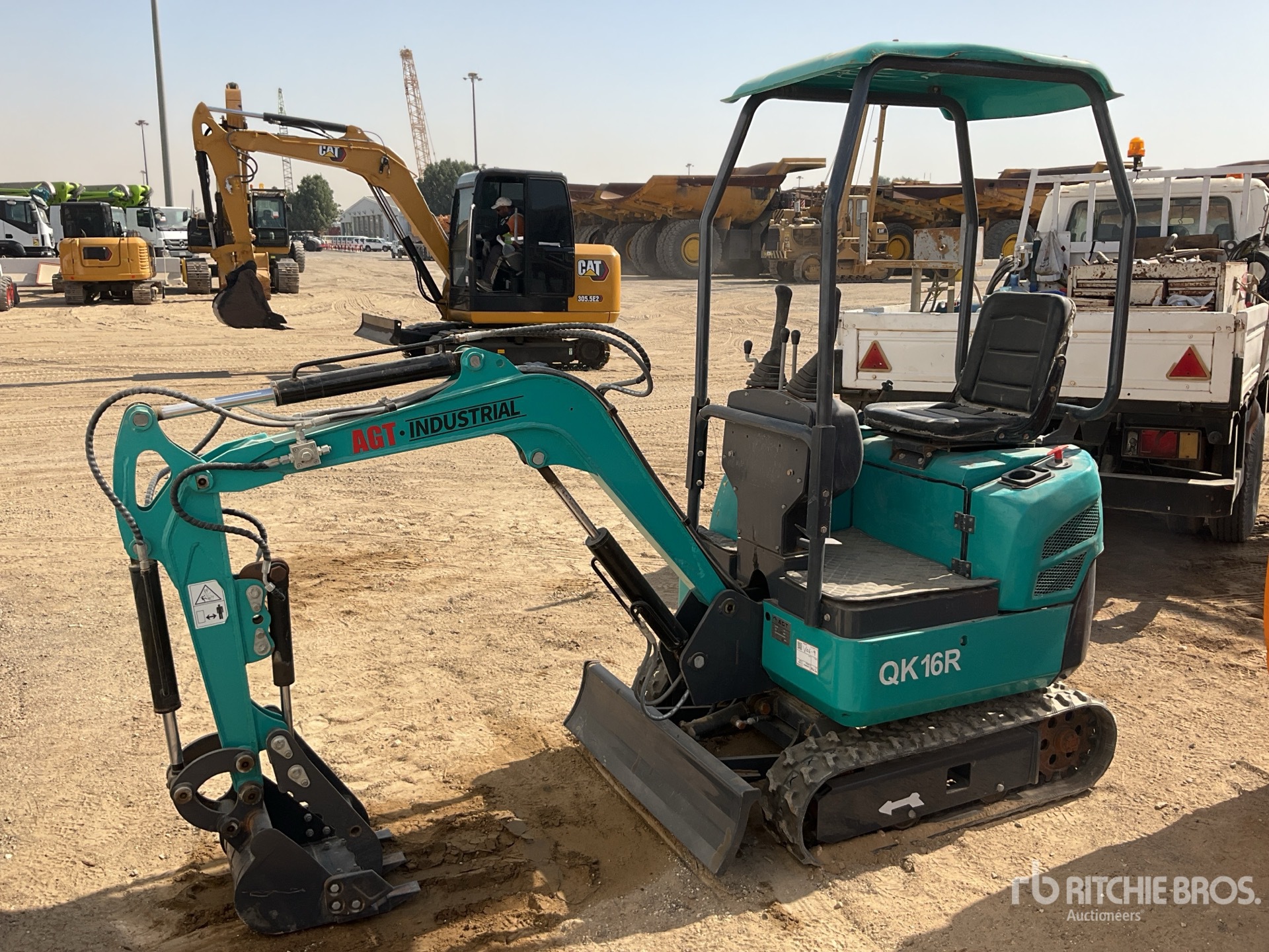 Lance de 780 mm, circuit hydraulique auxiliaire, lame de remblayage, chenilles en caoutchouc de 180 mm, godet de creusement de 420 mm, godet supplémentaire, pince hydraulique