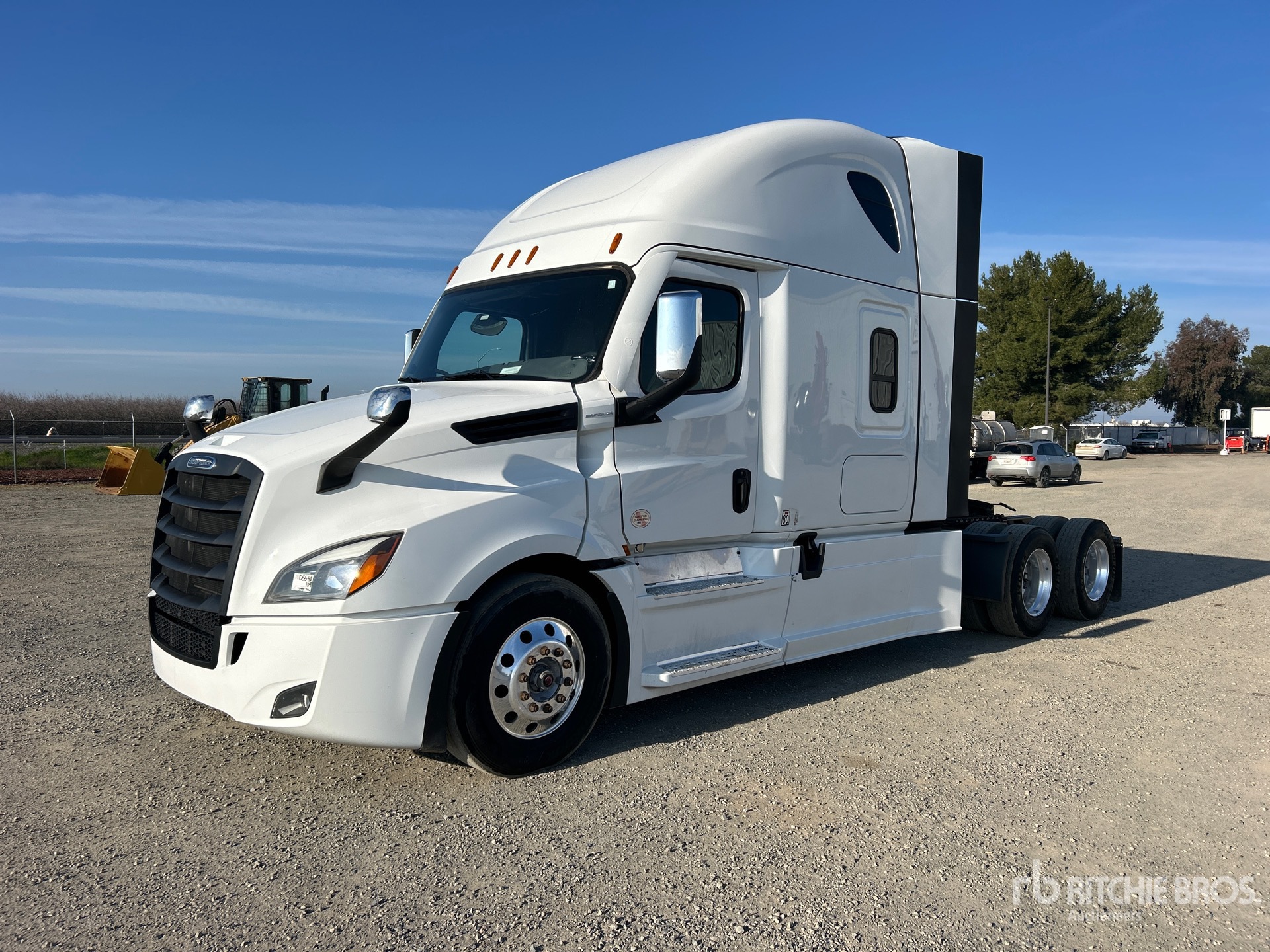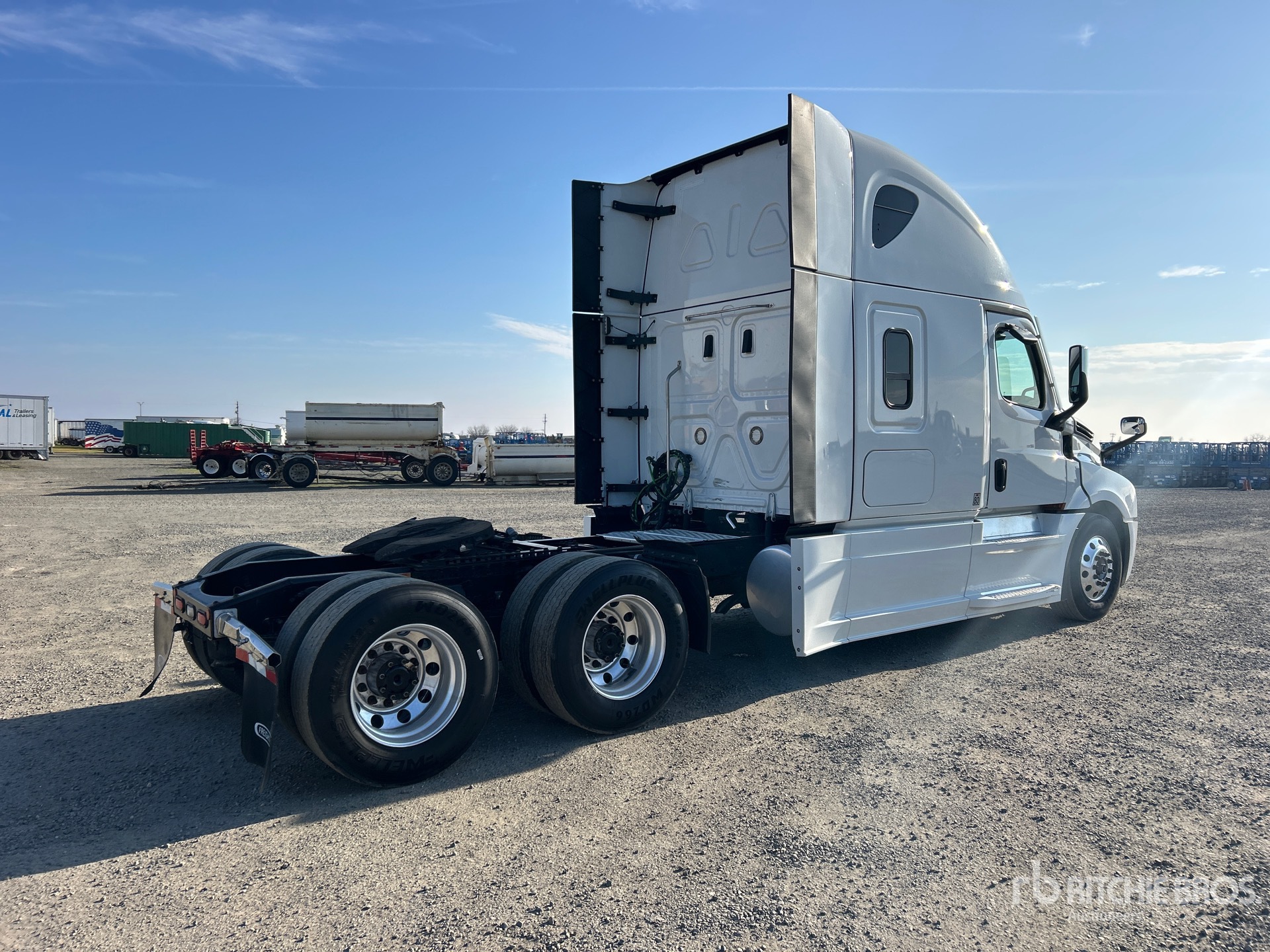 Moteur Detroit DD15 de 505 ch, homologué EPA 2023, 7 979 heures de fonctionnement, transmission automatisée Detroit DT12-1750-OH1 à 12 rapports, essieu avant de 6 032 kg, essieu arrière de 18 144 kg, PTAC de 24 235 kg, frein moteur, cabine couchette surélevée de 183 cm, lits superposés, empattement de 607 cm, suspension pneumatique, jantes en aluminium, pneus 295/75R22.5, sellette d'attelage coulissante pneumatique, double réservoir de carburant.