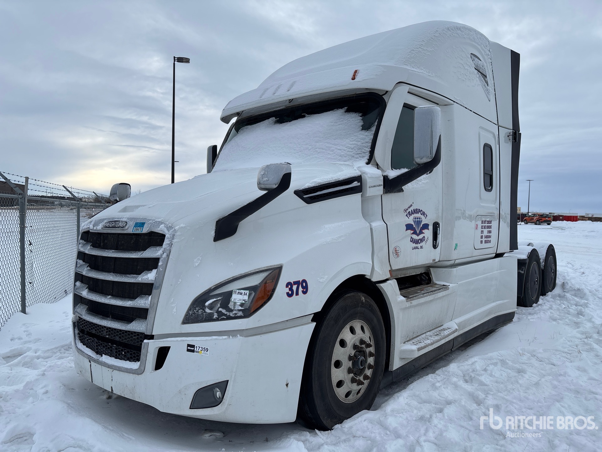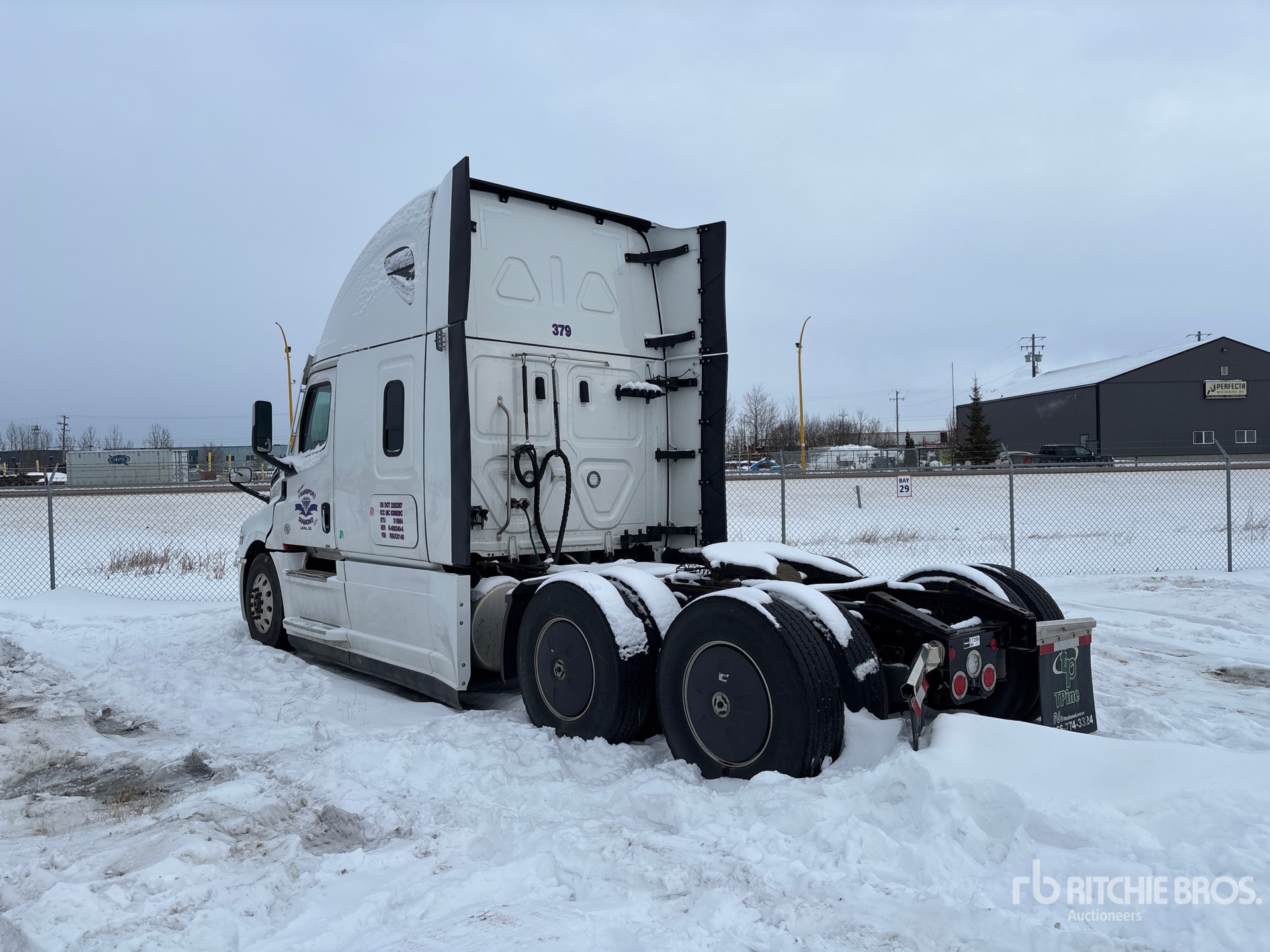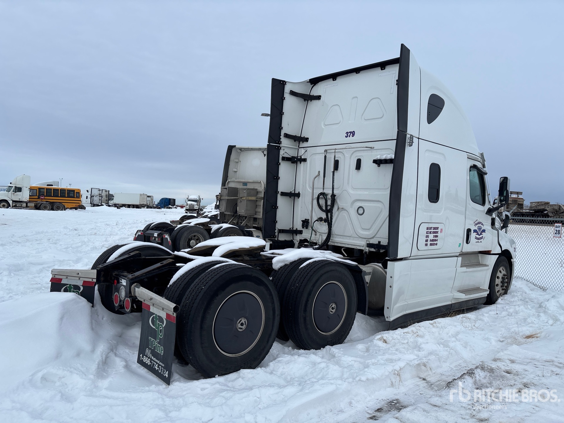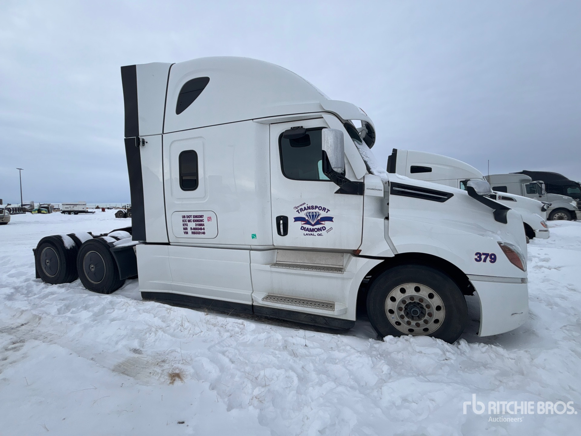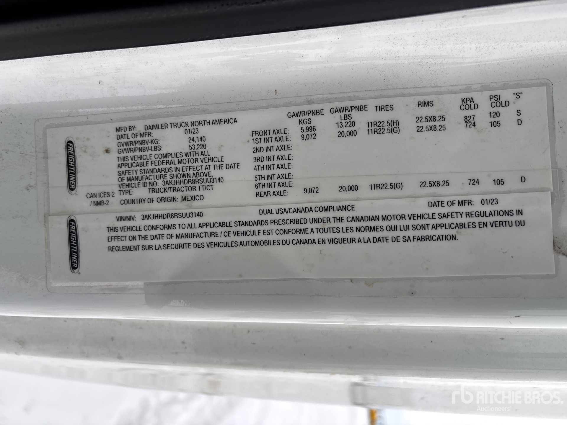 Moteur Detroit DD15 de 505 ch, homologué EPA 2023, transmission automatique Detroit DT12-1650-OHE à 12 rapports, essieu avant de 5 987 kg, essieux moteurs Meritor MT-40-14X, rapport de pont de 3,08:1, essieux arrière de 18 144 kg, PTAC de 24 158 kg, frein moteur, empattement de 5,81 m, suspension pneumatique, jantes en aluminium, pneus 11R22.5, sellette d'attelage coulissante pneumatique, double réservoir de carburant.