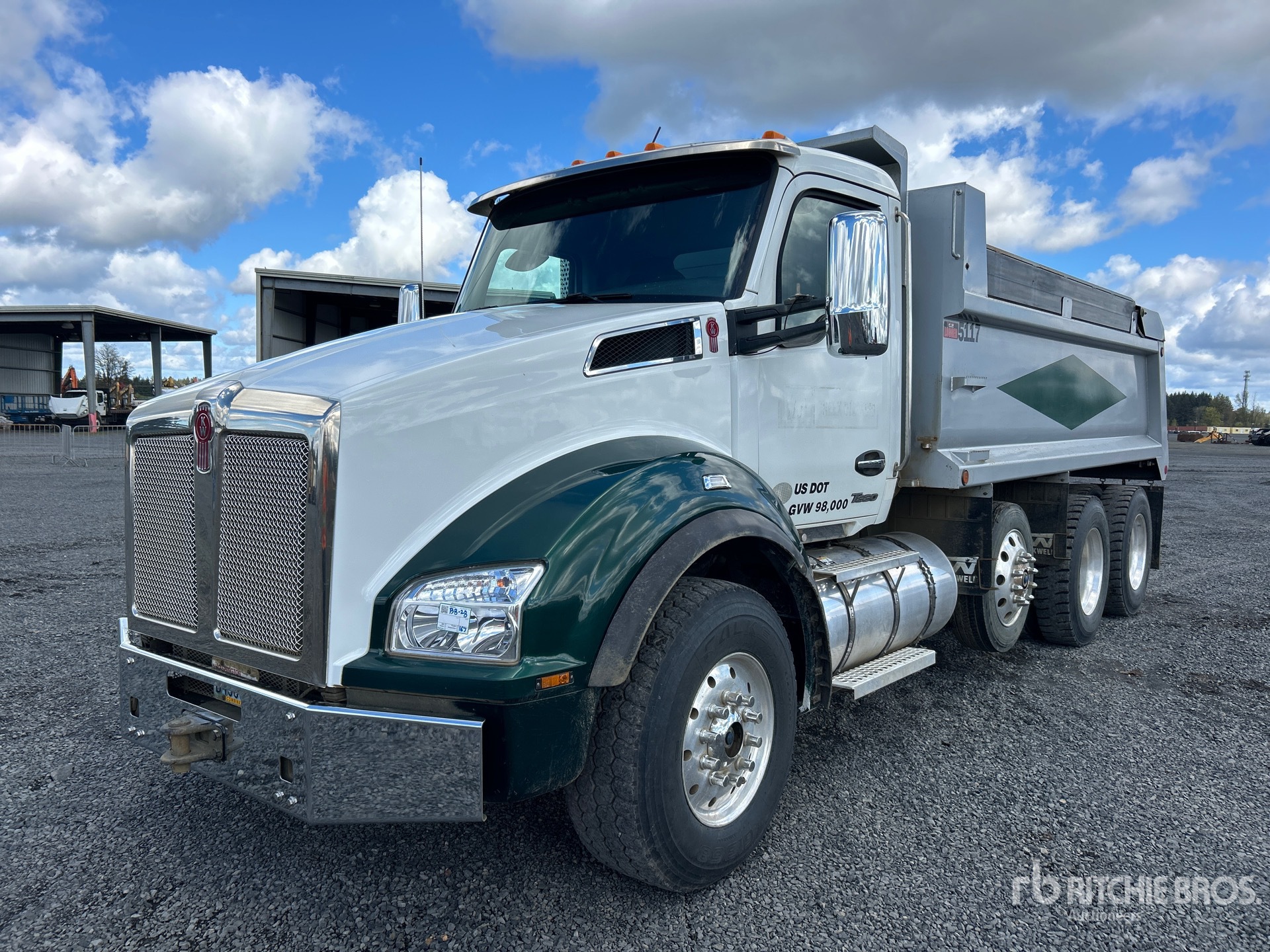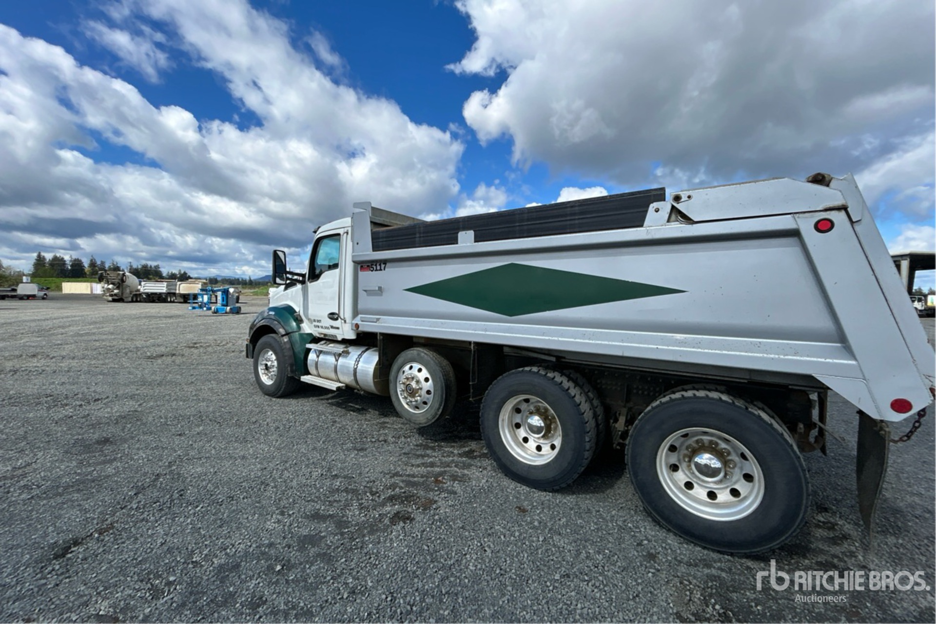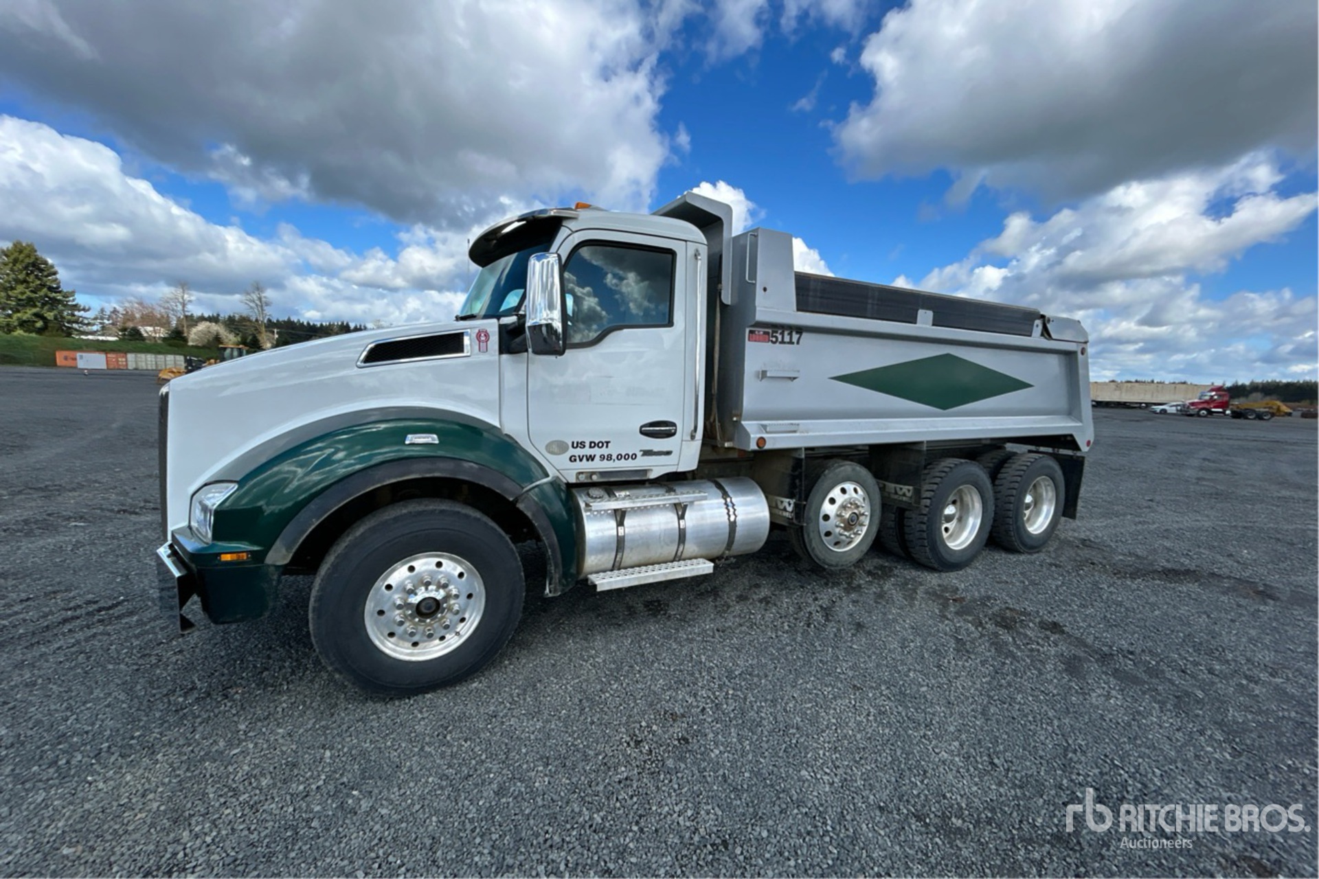 Situé sur la voie 10, emplacement 12, moteur diesel Cummins X15 6 cylindres 15,0 L 525 ch, étiquette EPA américaine 2023, nécessite du liquide d'échappement diesel, 4909 heures moteur, frein moteur, transmission manuelle Eaton Fuller 18 vitesses, double blocage de différentiel, essieu avant 14 600 lb, essieux arrière 46 000 lb, PTAC 71620 lb, cabine à suspension pneumatique, roues en aluminium, pneus avant 385/65R22.5, pneus arrière 11R24.5, essieu porteur pneumatique directionnel, suspension Hendrickson Haulmaax à longerons en caoutchouc, empattement de 214 pouces, prise de force, capacité de remorquage, caisse en acier de 16 pi 6 po de long x 3 pi 4 po de haut, capacité de 18,9 m³, hayon à grande levée, circuit hydraulique arrière, attelage à anneau. Équipement de la Green Diamond Resource Company