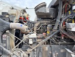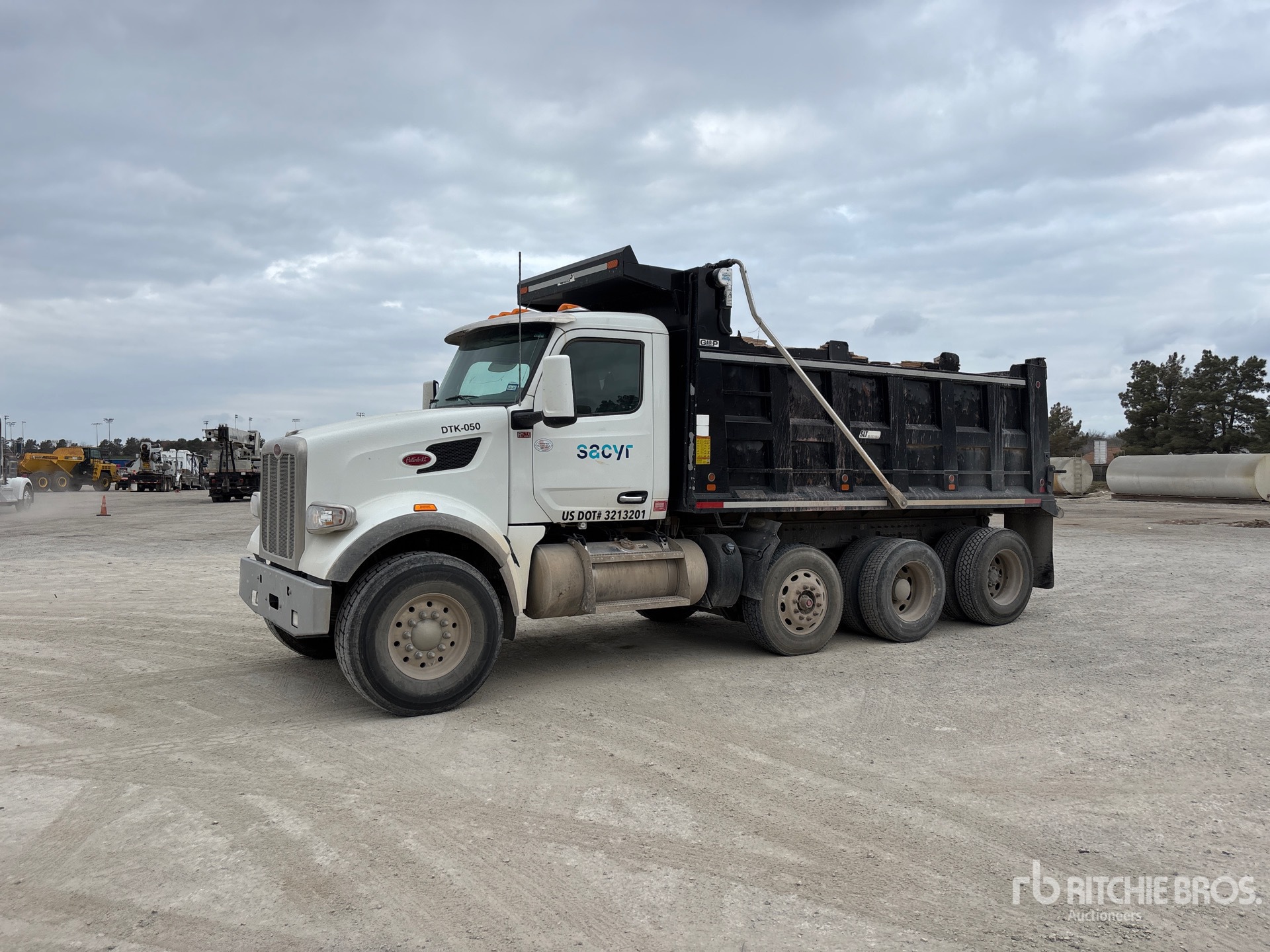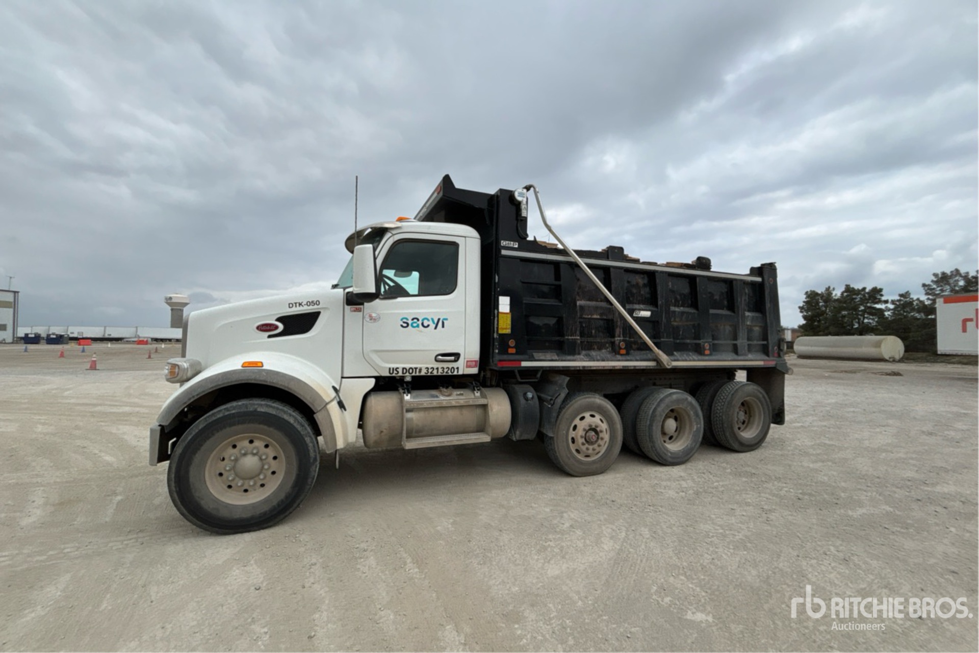Camion Paccar MX-13, moteur diesel 6 cylindres 12,9 L 456 ch, homologué EPA 2023, nécessite un additif pour réservoirs de diesel (AdBlue), 3 782 heures moteur, frein moteur, transmission automatique Allison, double blocage de différentiel, essieu avant 9 072 kg, essieux arrière 26 180 kg, PTAC 35 280 kg, cabine à suspension pneumatique, jantes en aluminium, pneus avant 425/65R22.5, pneus arrière 295/75R22.5, double direction, châssis renforcé, suspension à balancier sur silentblocs en caoutchouc, empattement de 559 cm, prise de force, benne en acier Garp de 4,88 m de long x 1,22 m de haut, vibreur de plateau, bâche à enroulement électrique
