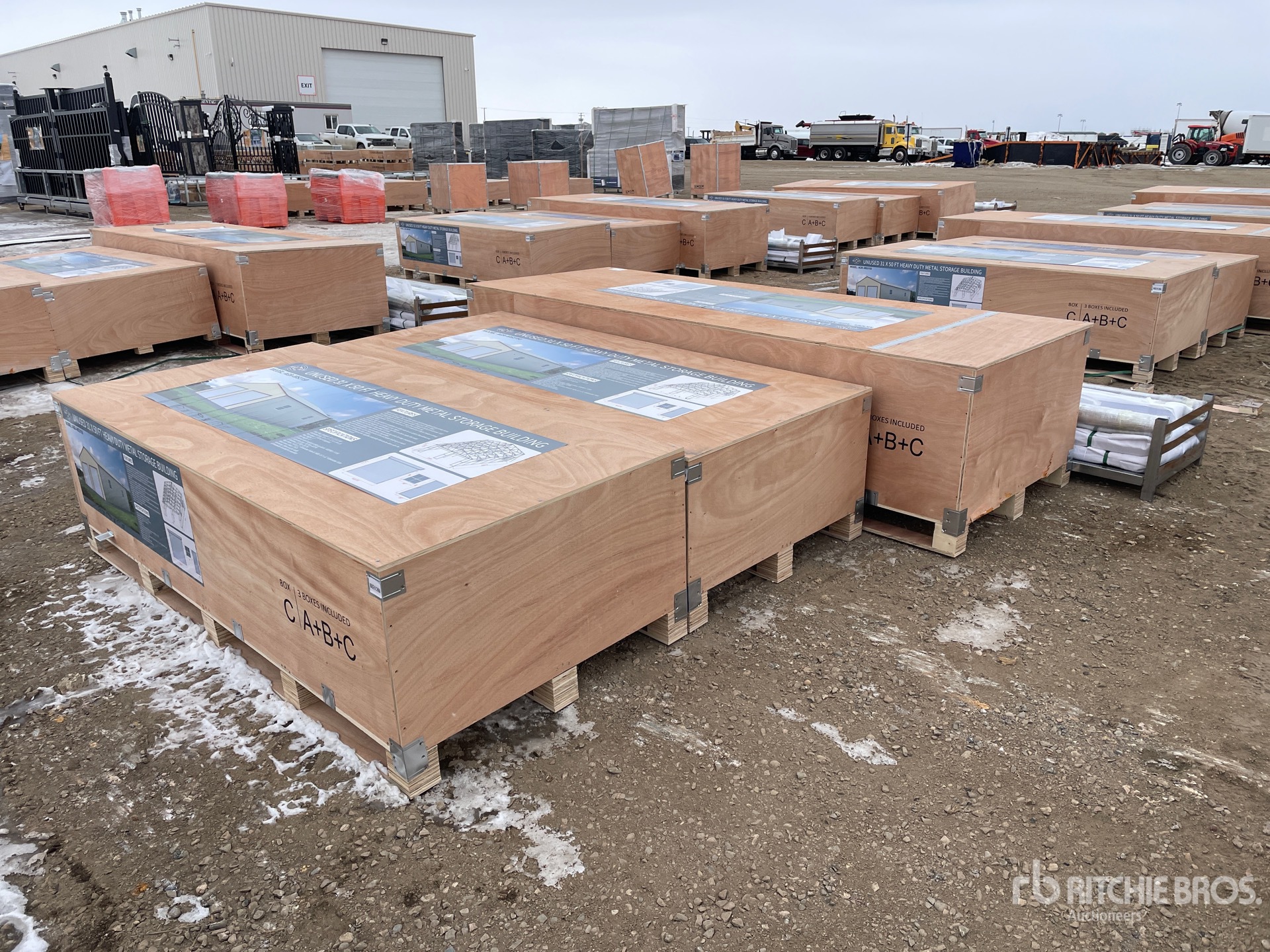 Hauteur totale : 5,2 m (17 pi), hauteur des parois latérales : 3,7 m (12 pi), quantité : 3 boîtes – permet de construire 1 bâtiment de rangement, avec 2 portes sectionnelles électriques. Les images présentées sont des photos d’illustration. Article neuf/non utilisé.
