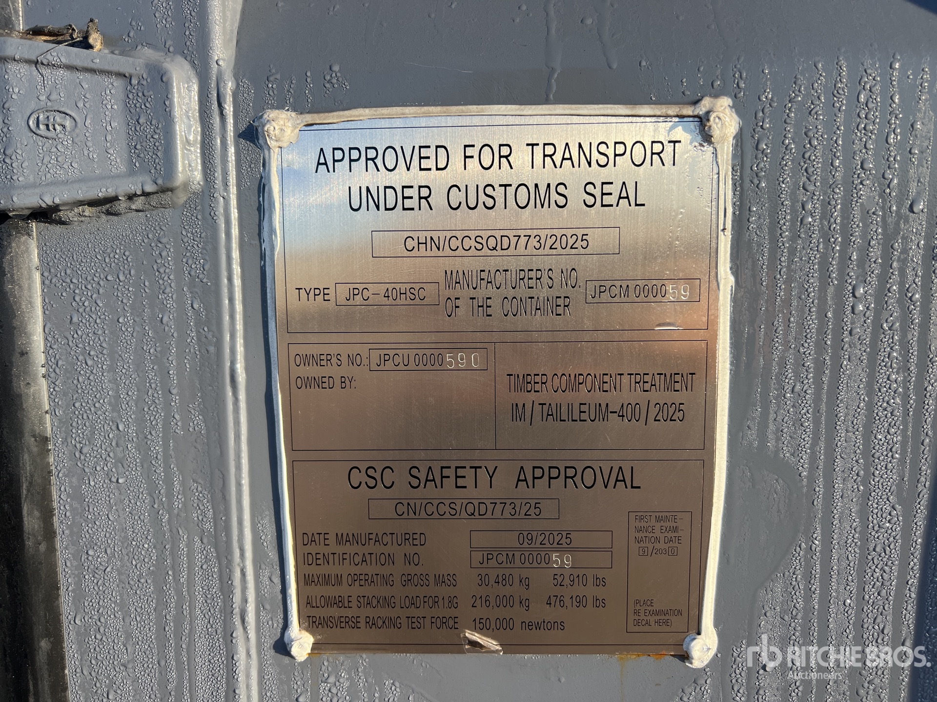 Les Informations détaillées de l’équipement sont d’une portée limitée, et les Encans Ritchie Bros. n’ont inspecté aucun autre aspect ou composant de l’équipement que ceux présentés expressément. Sauf indication précise, nous n’offrons aucune représentation ou garantie, officielle ou implicite, sur l’équipement ou ses composants, sans aucune limite de représentation ou de garantie en ce qui concerne la fonctionnalité, la conformité à toute norme de sécurité ou l’exigence de toute autorité ou agence de régulation en vigueur, l’adaptation à un quelconque usage, ou la valeur commerciale. Il vous est fortement conseillé d’effectuer votre propre inspection détaillée de l’équipement avant d’enchérir.