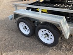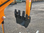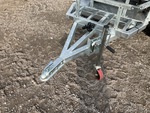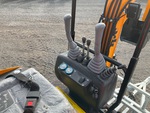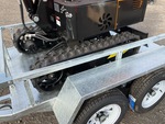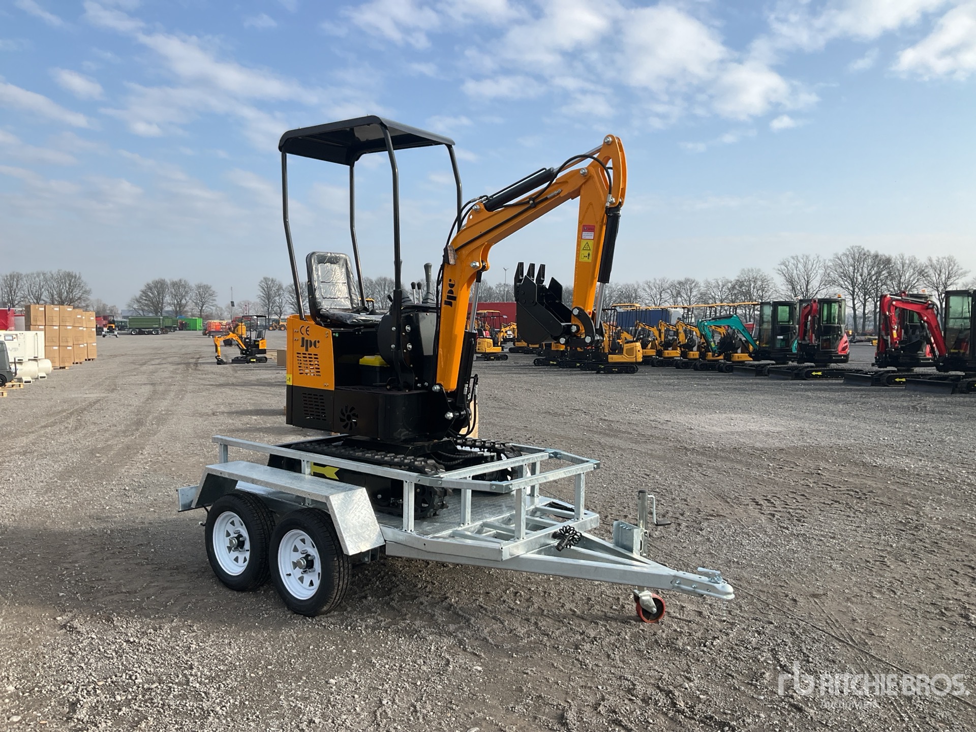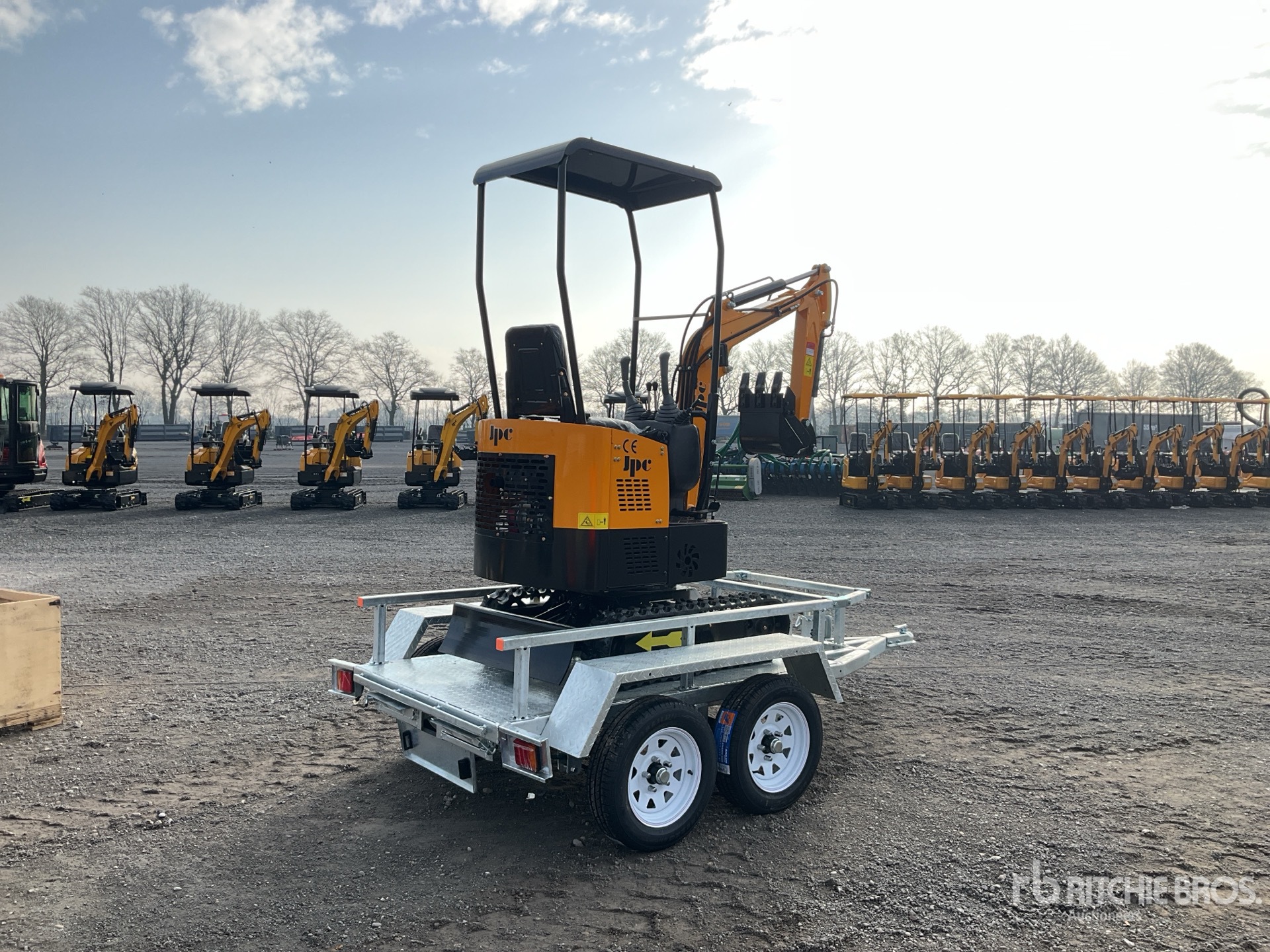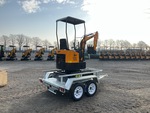 Lance de 800 mm, circuit hydraulique auxiliaire, lame de remblayage, chenilles en caoutchouc de 150 mm, godet de terrassement de 290 mm, sur remorque de transport T/A