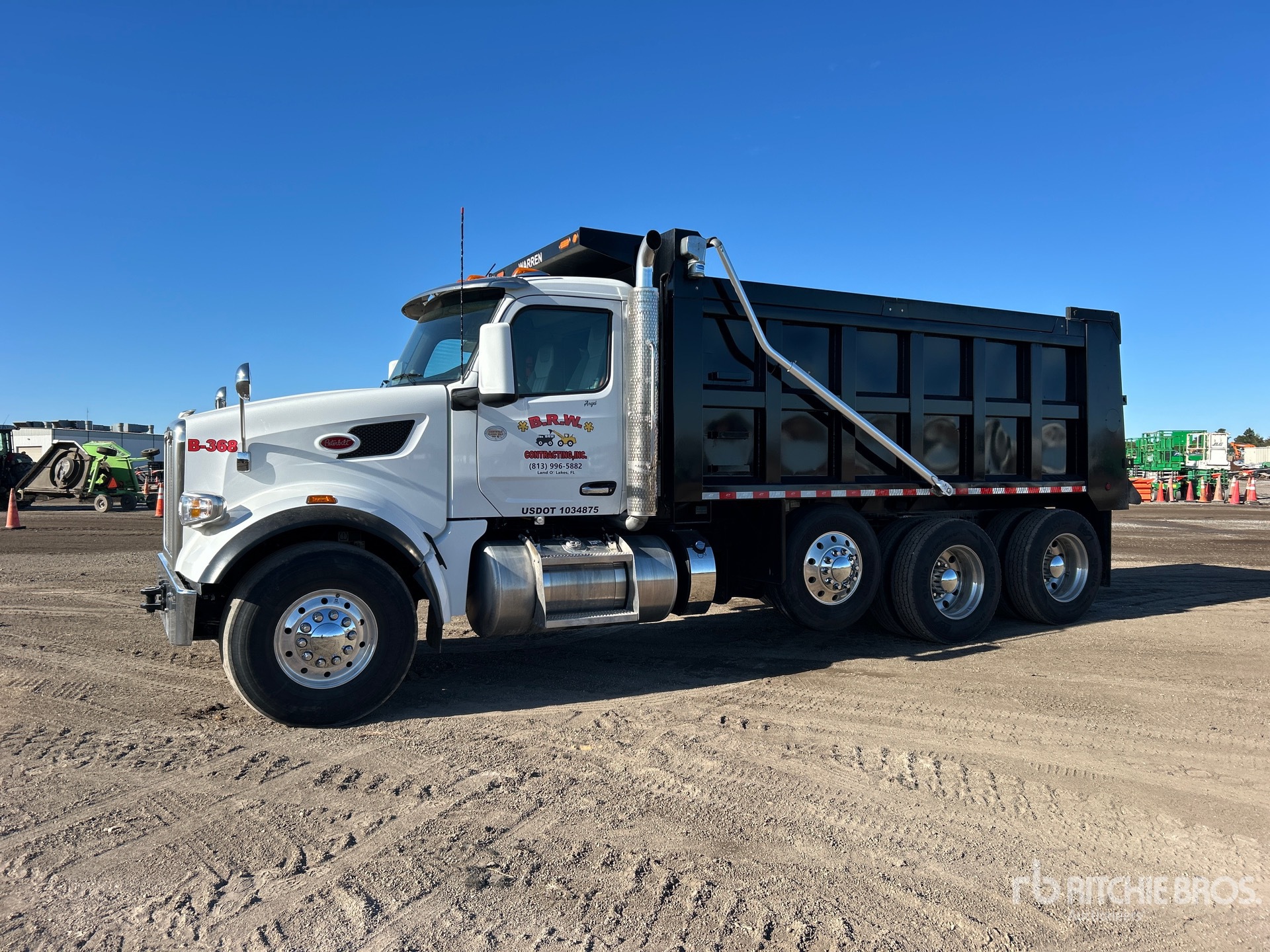 Moteur diesel Cummins X15 6 cylindres 15 L 450 ch, homologué EPA 2024, nécessite un liquide d'échappement diesel, 3035 heures moteur, frein moteur, transmission automatique Allison 4500, double blocage de différentiel, essieu avant 9 072 kg, essieu arrière 20 867 kg, PTAC 35 580 kg, cabine à suspension pneumatique, jantes en aluminium, pneus avant 425/65R22.5, pneus arrière 11R24.5, essieu porteur pneumatique directionnel, double boîtier de direction, châssis renforcé, suspension en caoutchouc Hendrickson Haulmaax, empattement 6 m, prise de force, benne en acier Warren 5,2 m de long x 1,5 m de haut, capacité 157 m³, bâche à enroulement électrique, hayon élévateur pneumatique, équipement fourni par B-R-W-Contracting